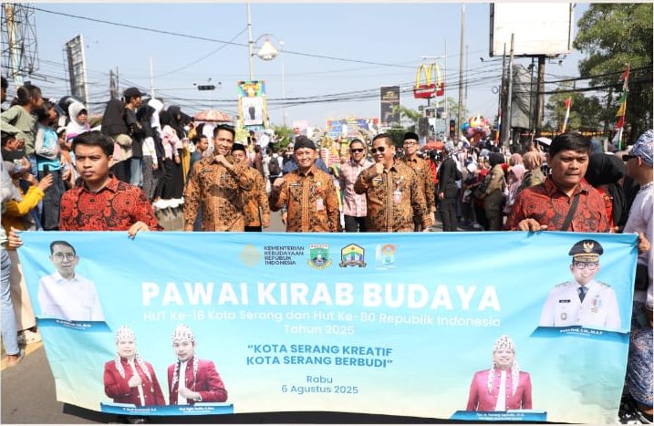 Bantenaktual.com, Serang – Sebanyak 103 kontingen turut memeriahkan Kirab Budaya dalam rangka memperingati Hari Ulang Tahun (HUT) ke-18 Kota Serang, Rabu (6/8/2025). Pawai ini diikuti oleh berbagai elemen, mulai dari 33 Organisasi Perangkat Daerah (OPD), stakeholder Kota Serang, pelajar SMP dan SMA/SMK se-Kota Serang, komunitas budaya, hingga masyarakat umum.