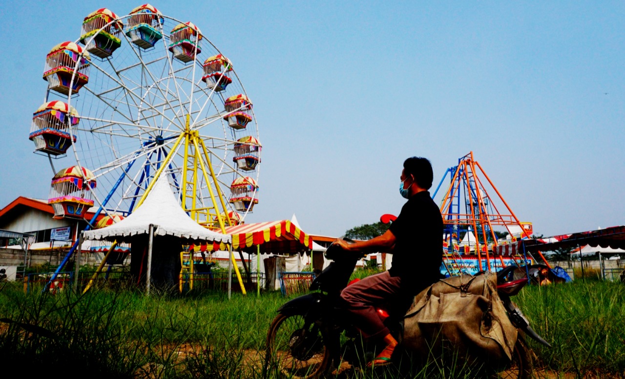 Di Tengah Pemberlakuan Pembatasan Kegiatan Masyarakat (PPKM) Level 4 pengusaha hiburan malam alamai gulung tikar, terlihat arena permainan Pasar Malam di Komplek Industri Pasar kemis Kabupaten Tangerang terbengkalai akibat Pemerintah melarang tempat wisata beroperasi, arena permainan tersebut sudah dua bulan ini tutup hingga di penuhi rumput liar yang sudah mulai meninggi. Kamis (29/7/21). Banten Aktual/Dennys