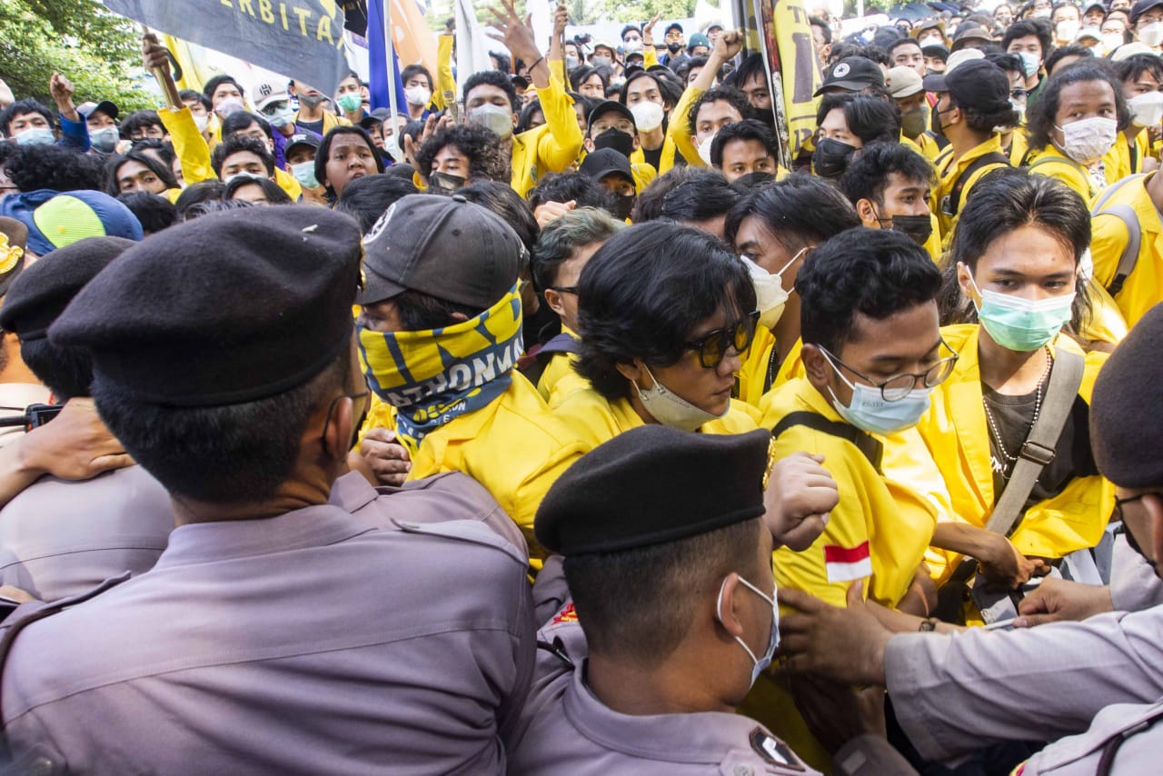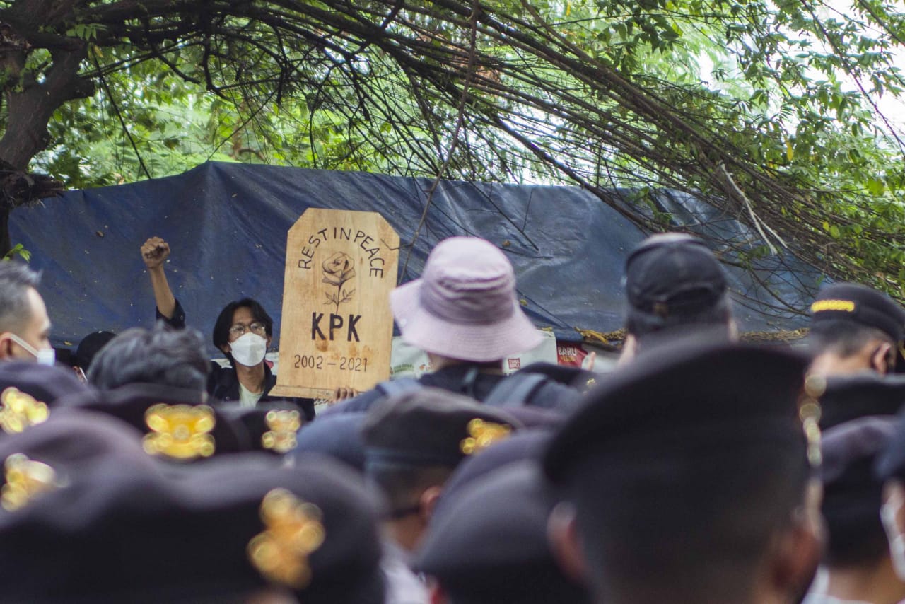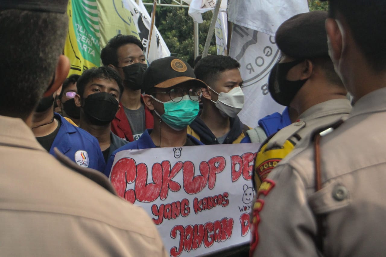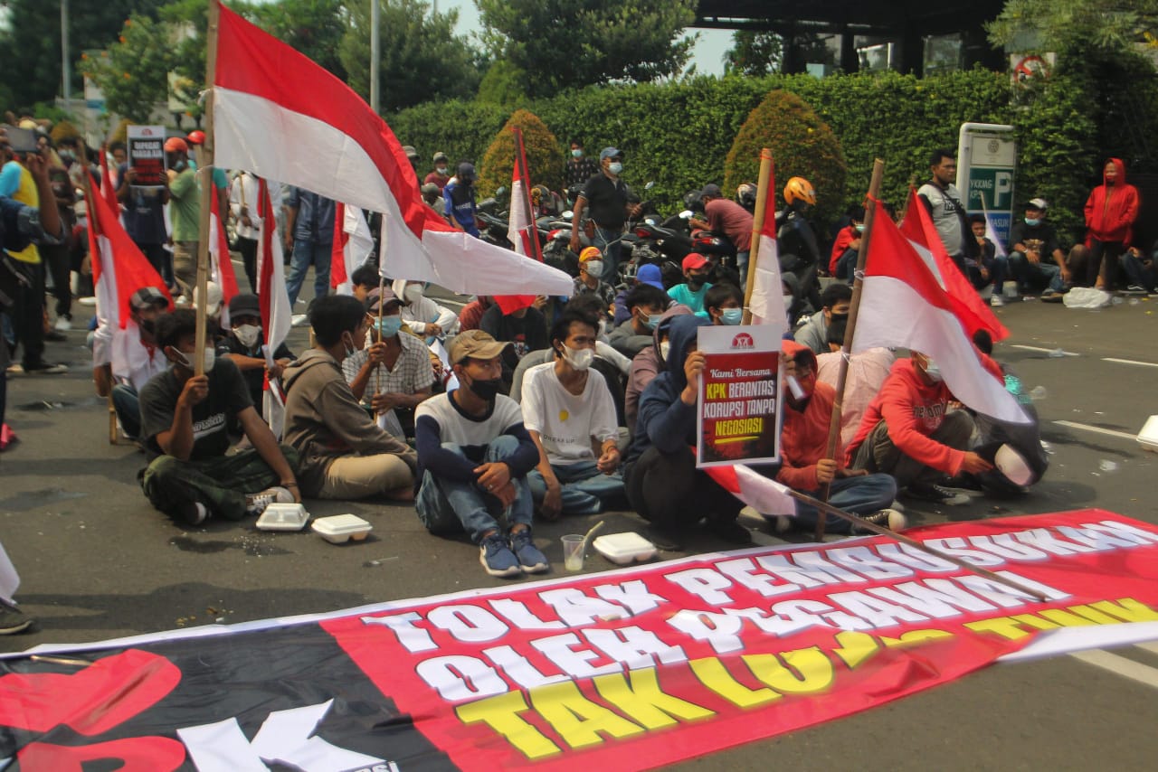 Ratusan mahasiswa yang tergabung dalam Badan Eksskutif Mahasiswa Seluruh Indonesia (BEM SI) dan Gerakan Selamatkan KPK (GASAK) menyambangi gedung Merah Putih di kawasan Kuningan, Jakarta Selatan, Senin (27/09/2021). Dalam aksi tersebut mahasiswa menuntut Presiden Joko Widodo untuk membatalkan pemecatan terhadap 57 pegawai Komisi Pemberantasan Korupsi (KPK) yang tidak lulus dalam Tes Wawasan Kebangsaan (TWK) serta memecat Ketua KPK Firli Bahuri. Dalam aksinya tersebut mahasiwa yang datang dari berbagai kampus dihadang oleh aparat kepolisian agar tidak maju ke depan halaman gedung anti rasuah tersebut, akibatnya sempat ada saling dorong antara mahasiswa dan petugas. Banten Aktual/Cecep