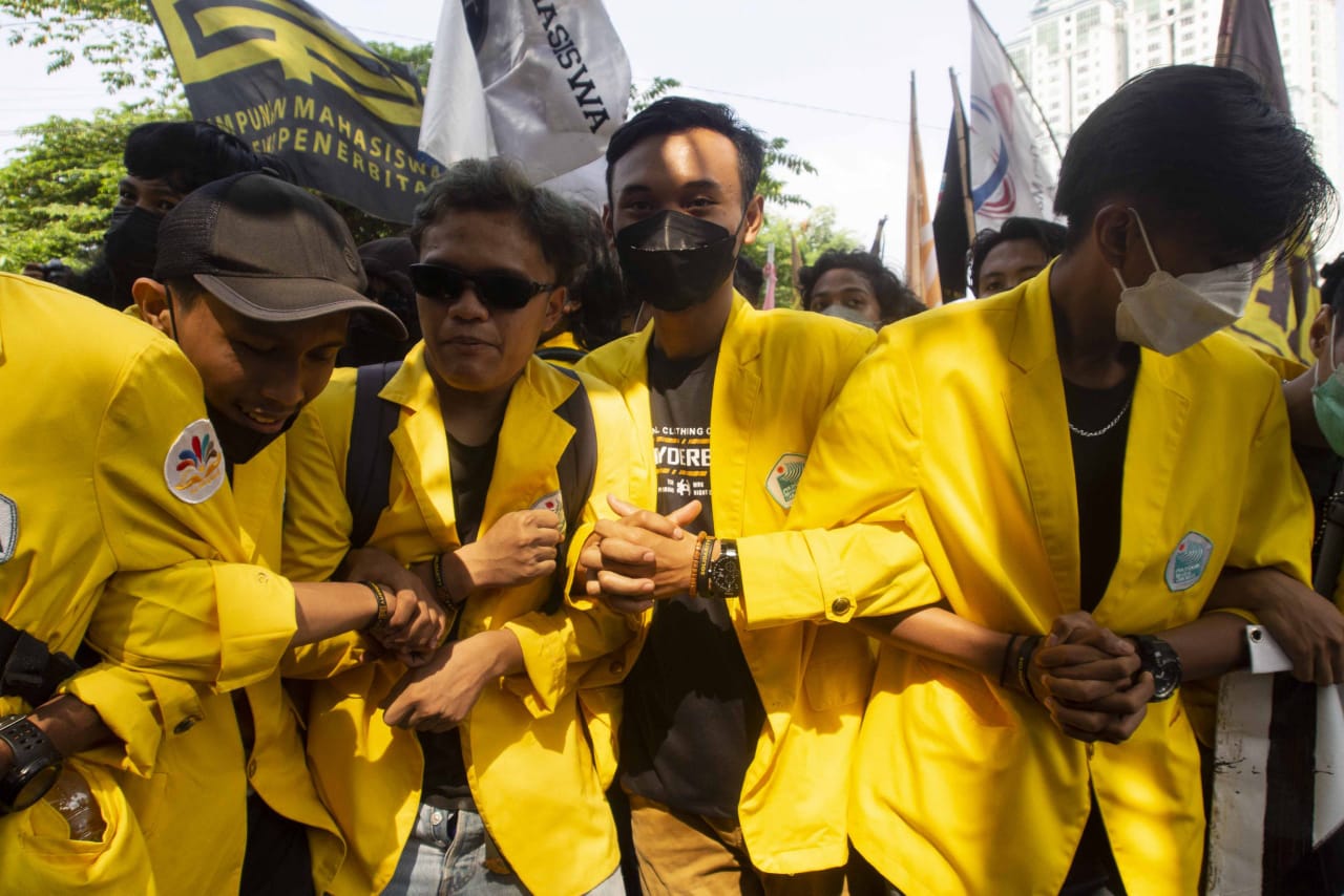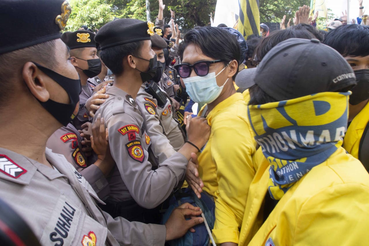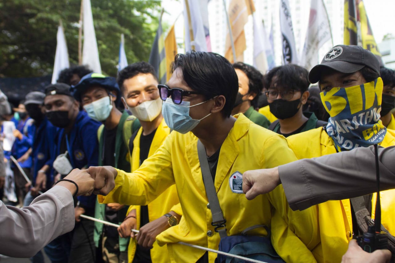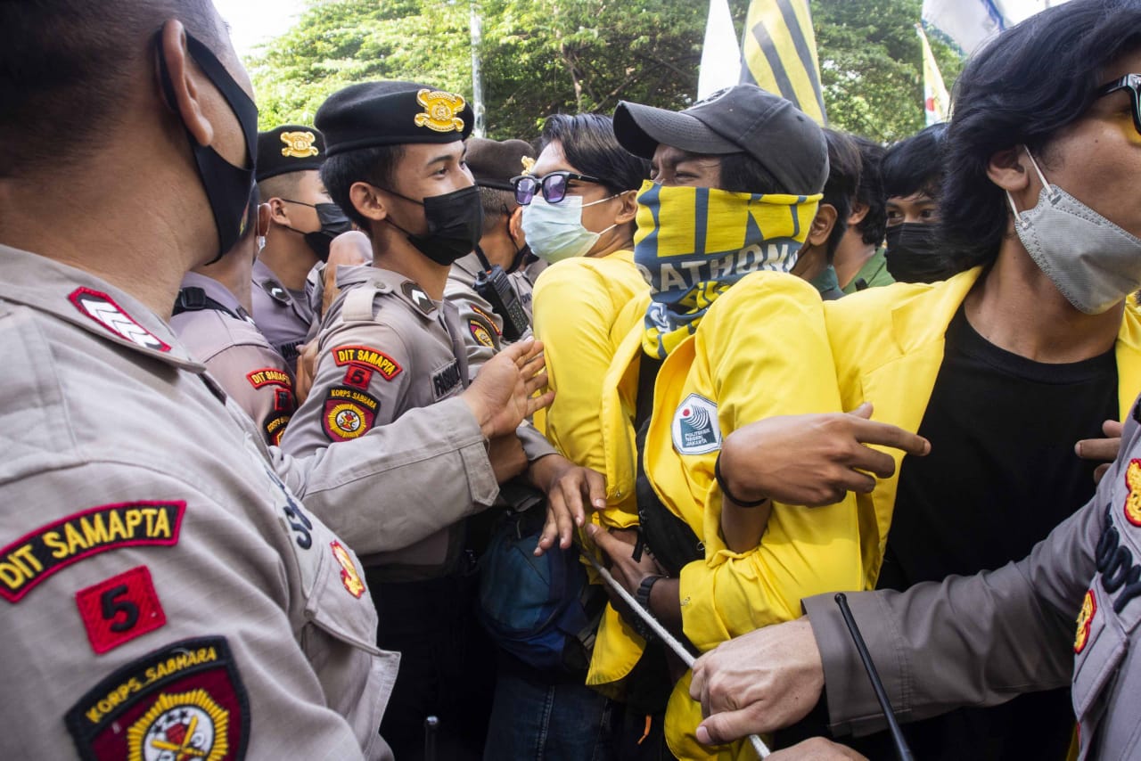 Ratusan mahasiswa yang tergabung dalam Badan Eksskutif Mahasiswa Seluruh Indonesia (BEM SI) dan Gerakan Selamatkan KPK (GASAK) menyambangi gedung Merah Putih di kawasan Kuningan, Jakarta Selatan, Senin (27/09/2021). Dalam aksi tersebut mahasiswa menuntut Presiden Joko Widodo untuk membatalkan pemecatan terhadap 57 pegawai Komisi Pemberantasan Korupsi (KPK) yang tidak lulus dalam Tes Wawasan Kebangsaan (TWK) serta memecat Ketua KPK Firli Bahuri. Dalam aksinya tersebut mahasiwa yang datang dari berbagai kampus dihadang oleh aparat kepolisian agar tidak maju ke depan halaman gedung anti rasuah tersebut, akibatnya sempat ada saling dorong antara mahasiswa dan petugas. Banten Aktual/Cecep