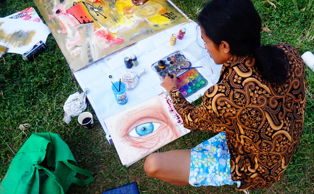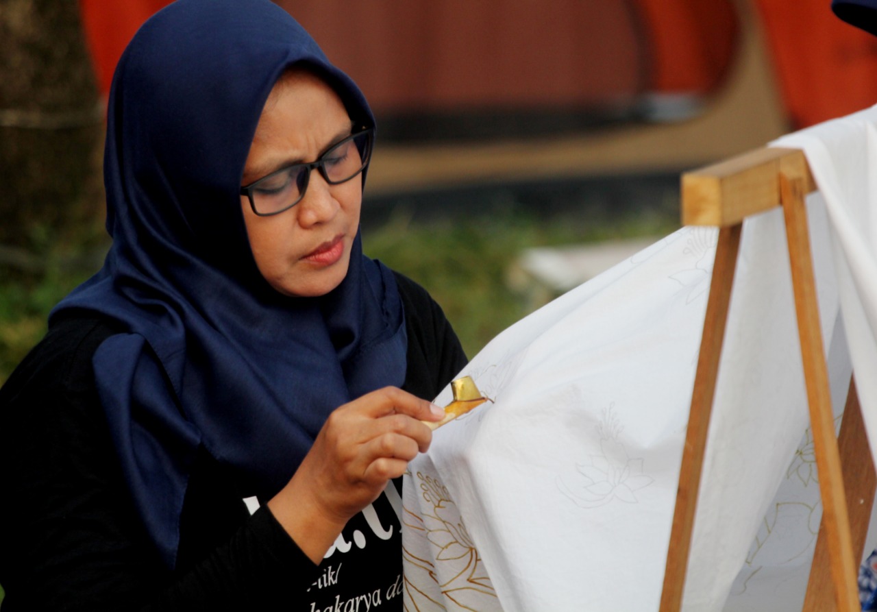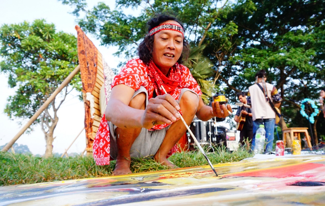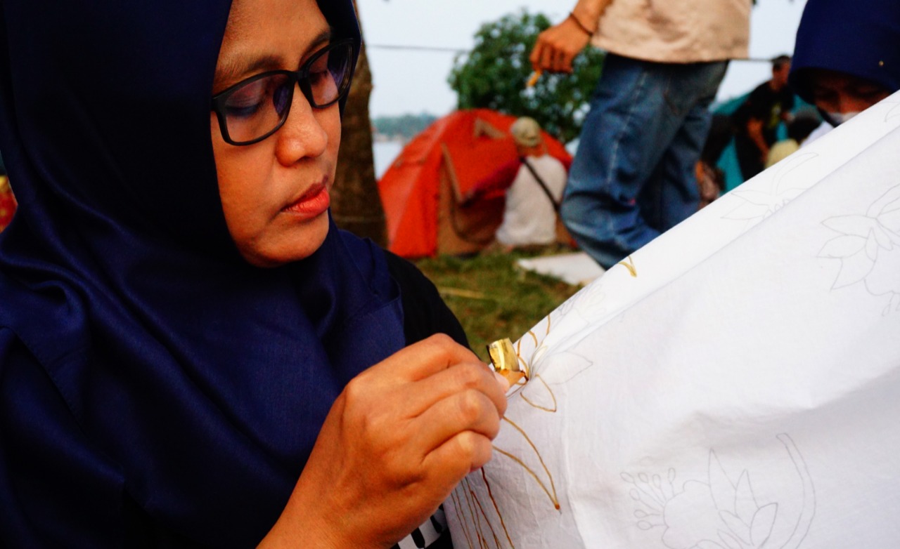 Jelang hari batik nasional sekelompok anak muda memperingati hari batik dengan menggelar acara Art Saloka di Camping Ground Situ Cipondoh Kota Tangerang, dalam acara tersebut sanggar batik kembang mayang yang berada di Kecamatan Larangan menjadi narasumber dan sekaligus mempraktekan cara membatik dengan canting (Batik Tulis), selain itu acara tersebut juga menggelar musik dari beberapa grup band baik dari Kota Tangerang maupun luar kota, terlihat Edibonetsky sedang membuat mural di acara tersebut. Sabtu (2/10/21). Banten Aktual/Dennys