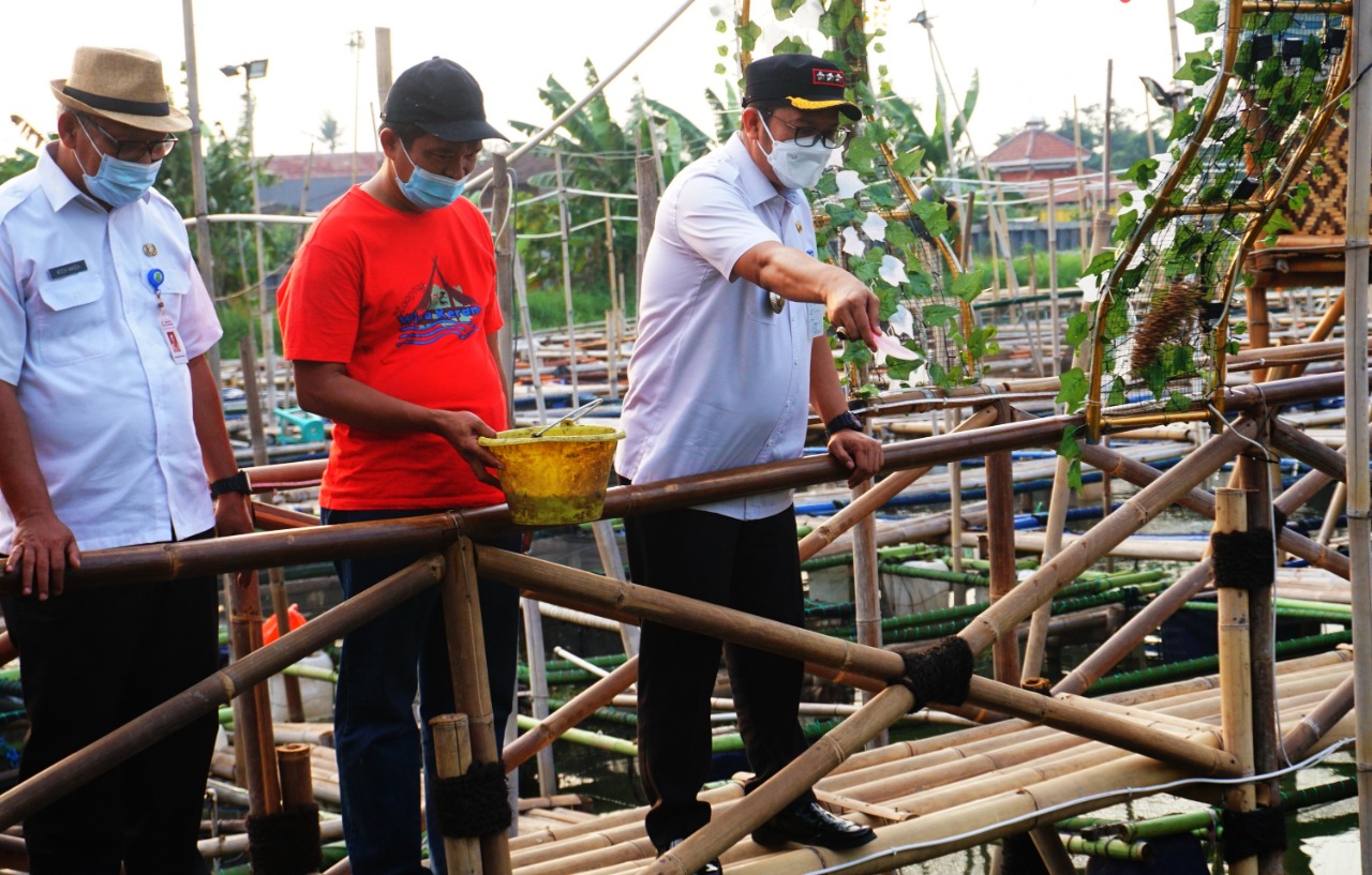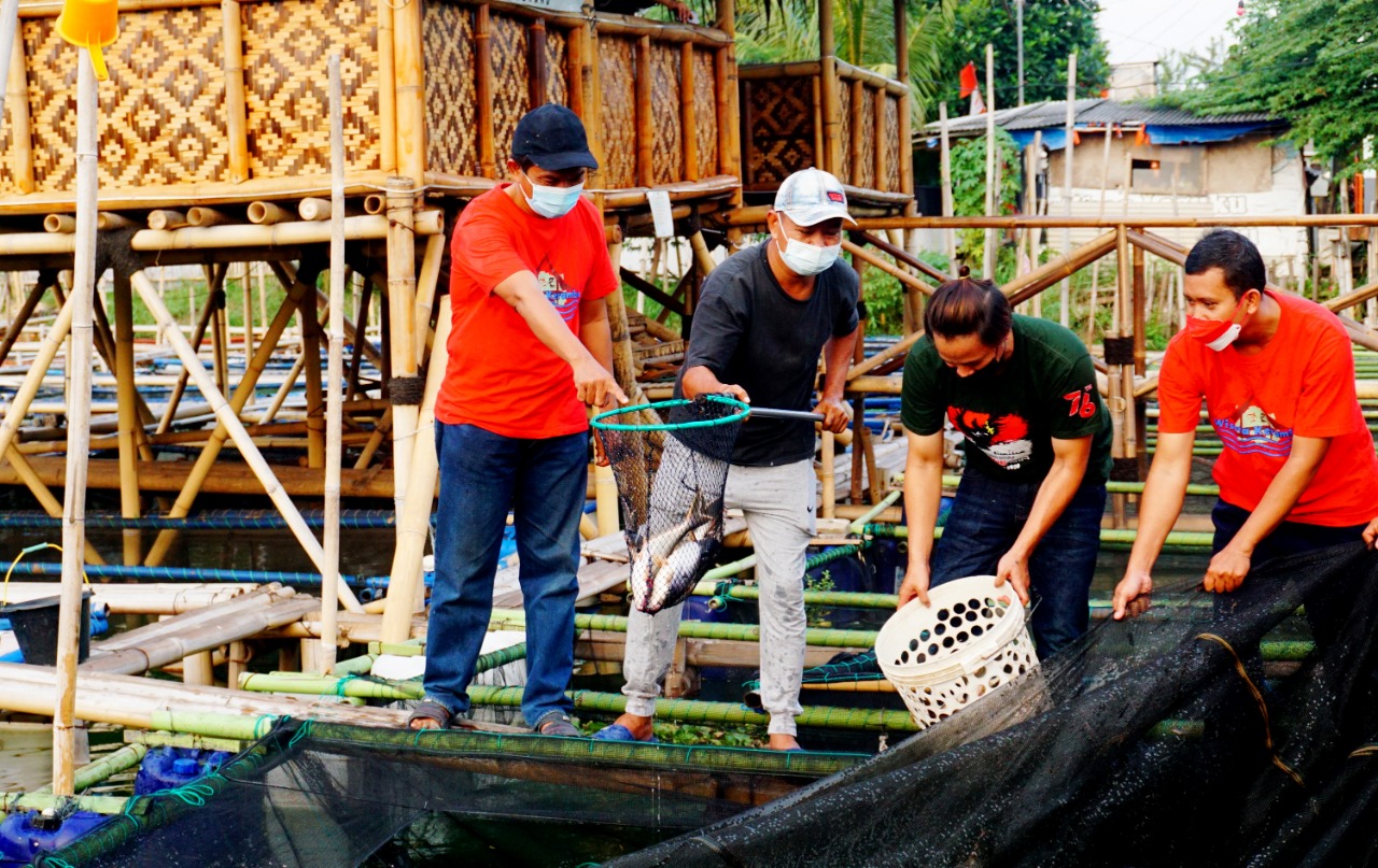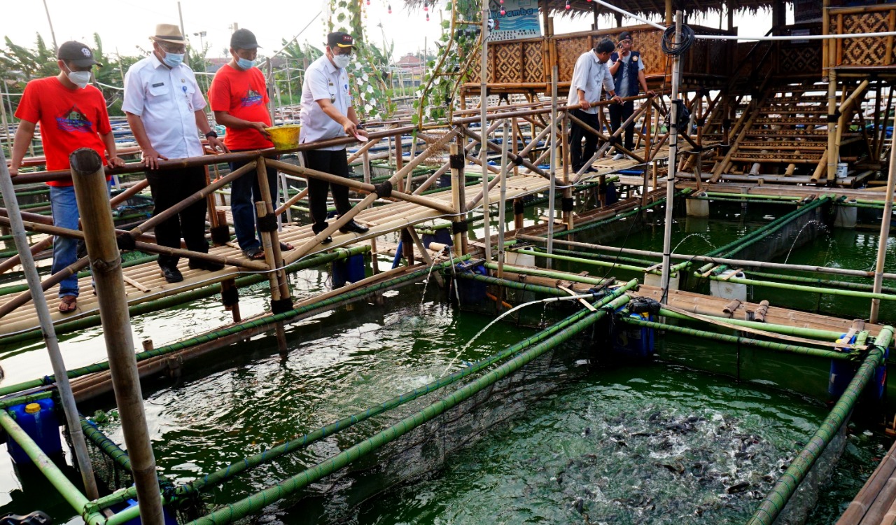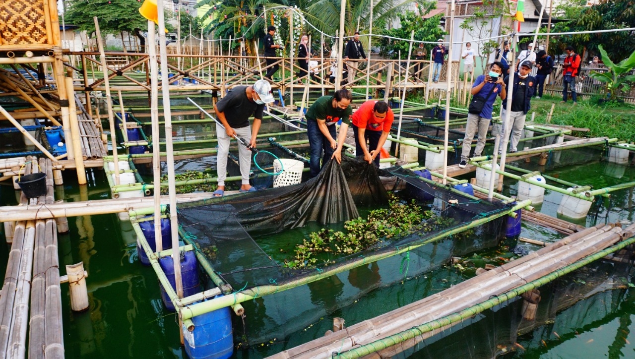 Kampung Wisata Keramba 22 panen ikan, terlihat sejumlah warga sedang memanen ikan di kerambanya untuk di bagikan kepada warga di Perumahan Garden City Kelurahan Gebang Raya Kecamatan Periuk Kota Tangerang, di acara panen tersebut terlihat Camat Periuk Maryono Hasan sedang memberi makan ikan di keramba apung dengan di dampingi oleh warga Kampung Keramba. Rabu (1/9/21). Banten Aktual/Dennys
