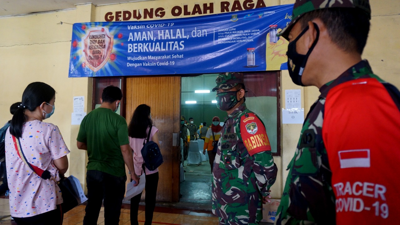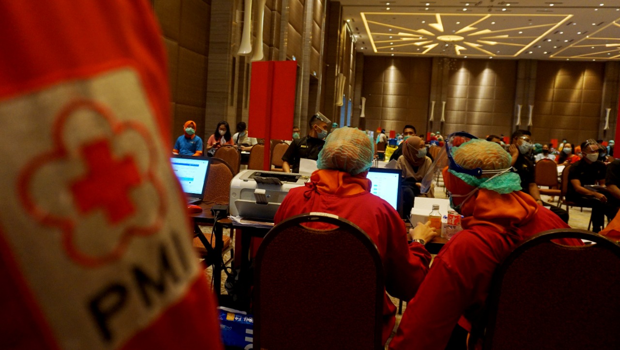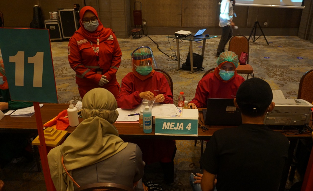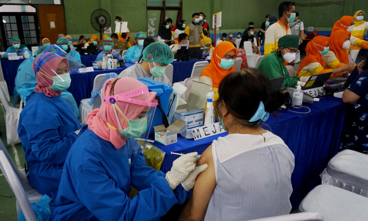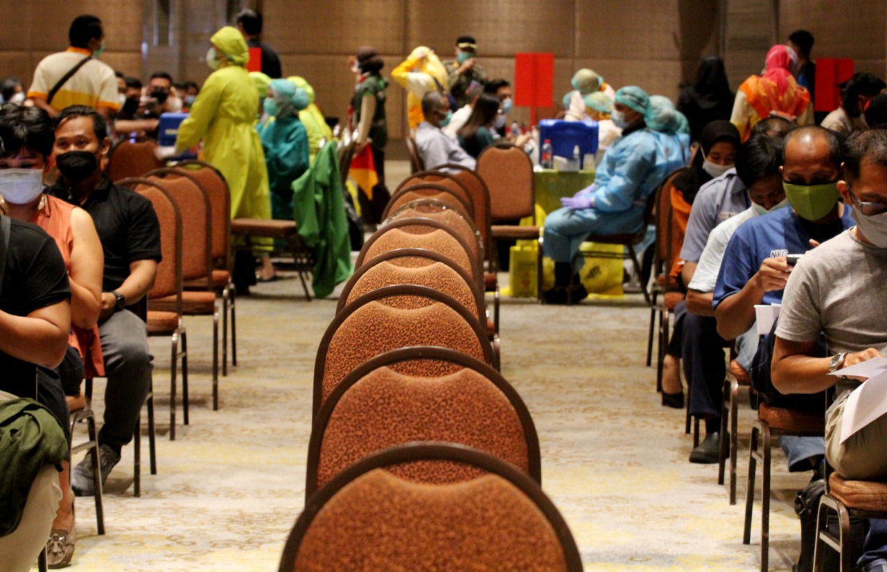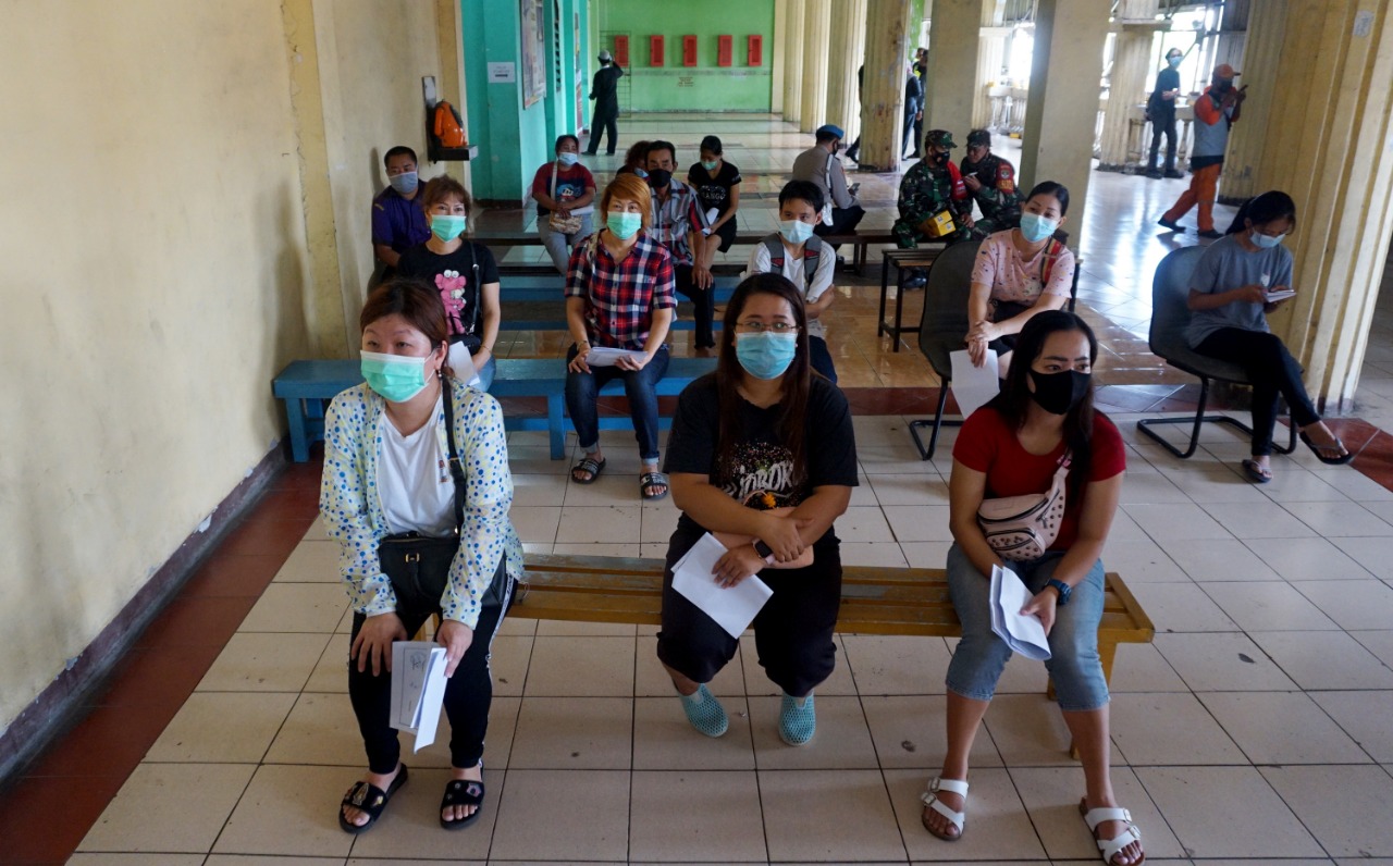 Dinas Kesehatan kembali distribusikan vaksin Covid-19 bagi pemilik toko maupun karyawan di pasar dan Mall yang ada di Kota Tangerang. Para penerima vaksin mengantri dengan tertib dan tetap mengikuti protokol kesehatan dengan penjagaan yang ketat. Senin (1/3/21). Banten Aktual/Dennys