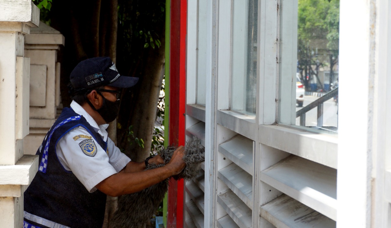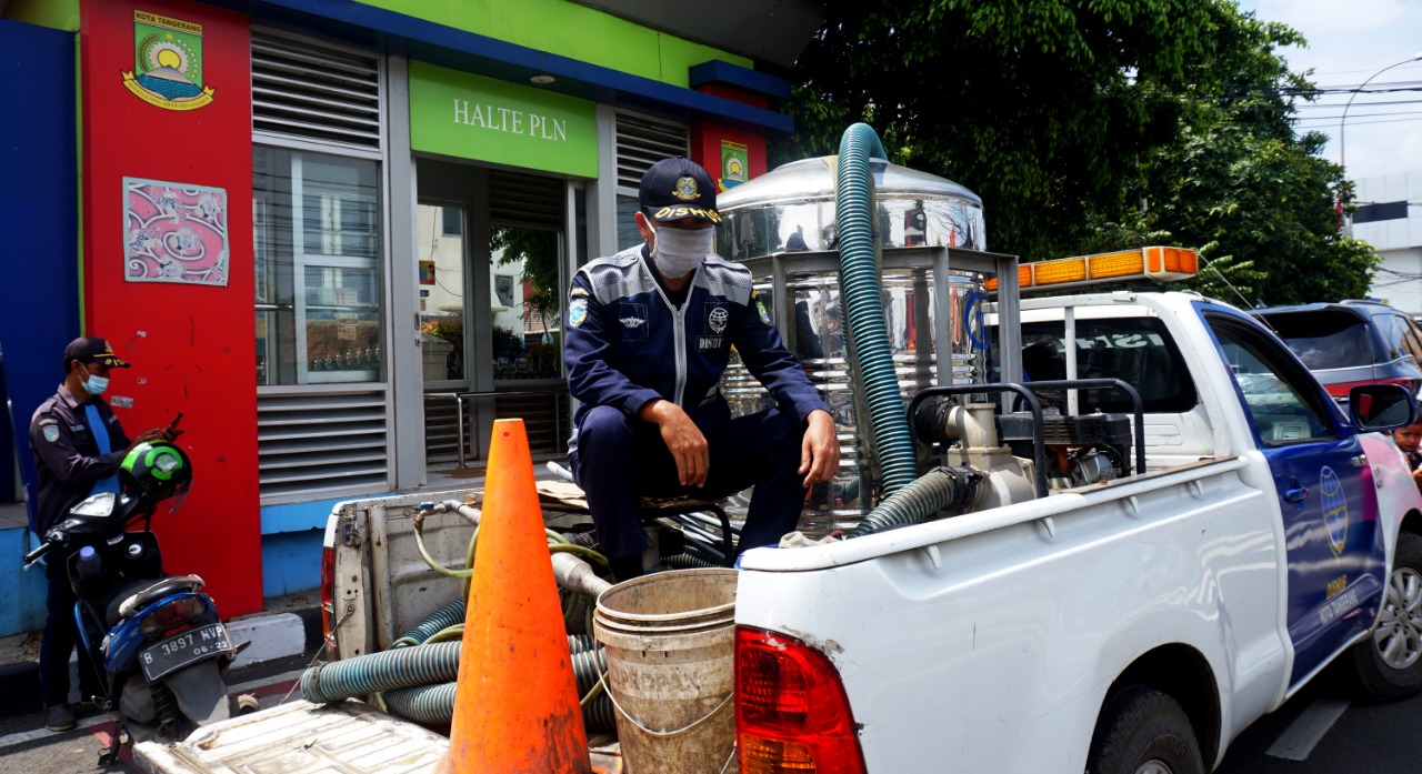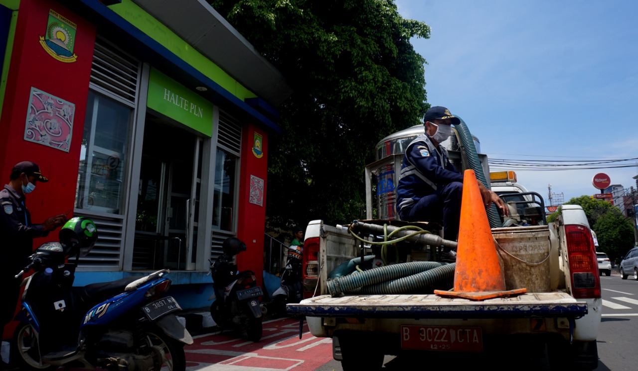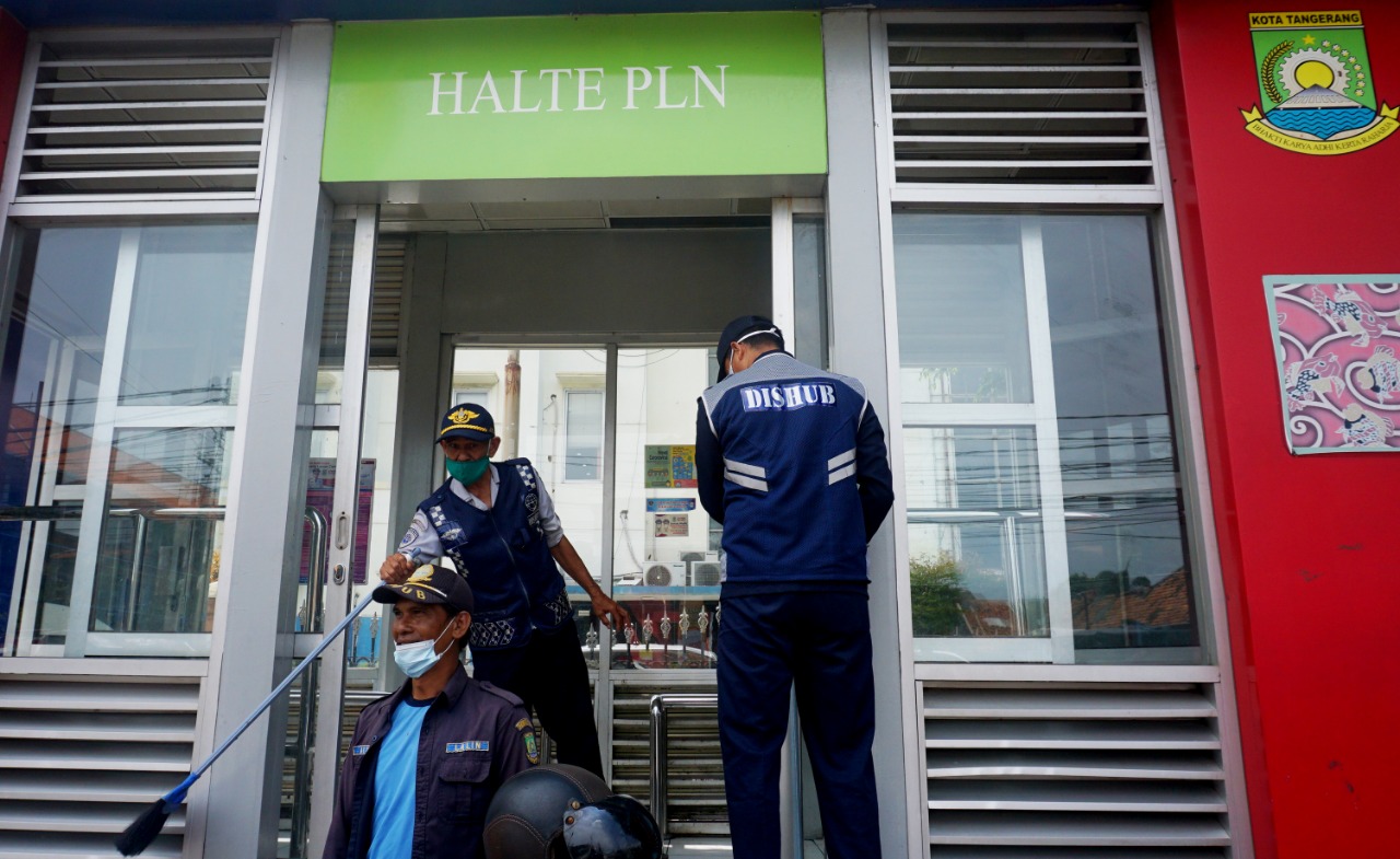Petugas Dinas Perhubungan (DISHUB) Kota Tangerang sedang membersihkan Halte (Tempat Pemberhentian Mobil Angkutan Umum). Dalam setiap harinya para petugas Dishub membersihkan 20 Halte yang ada di Kota Tangerang. Kegiatan tersebut menjadi satu Program Pemerintah Kota Tangerang selama masa Pandemi, guna memutus mata rantai penyebaran Virus Covid-19. Selasa (23/2/21). Banten Aktual/Dennys