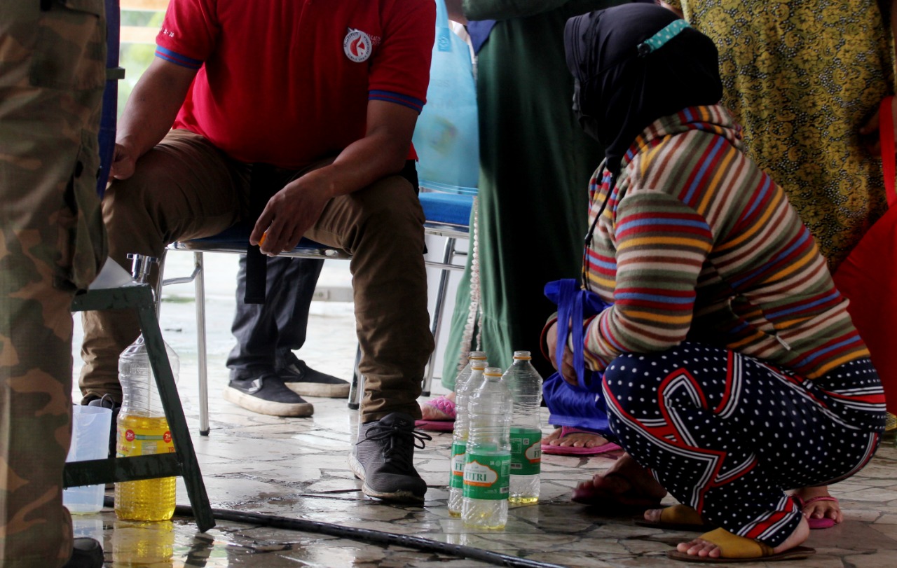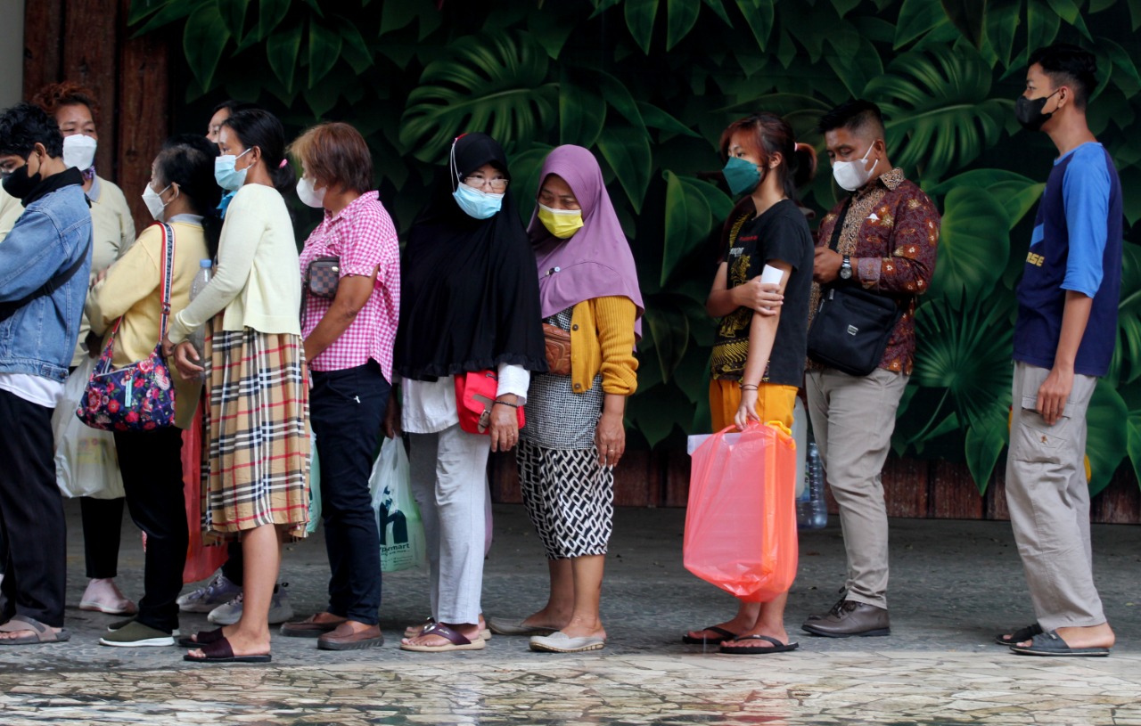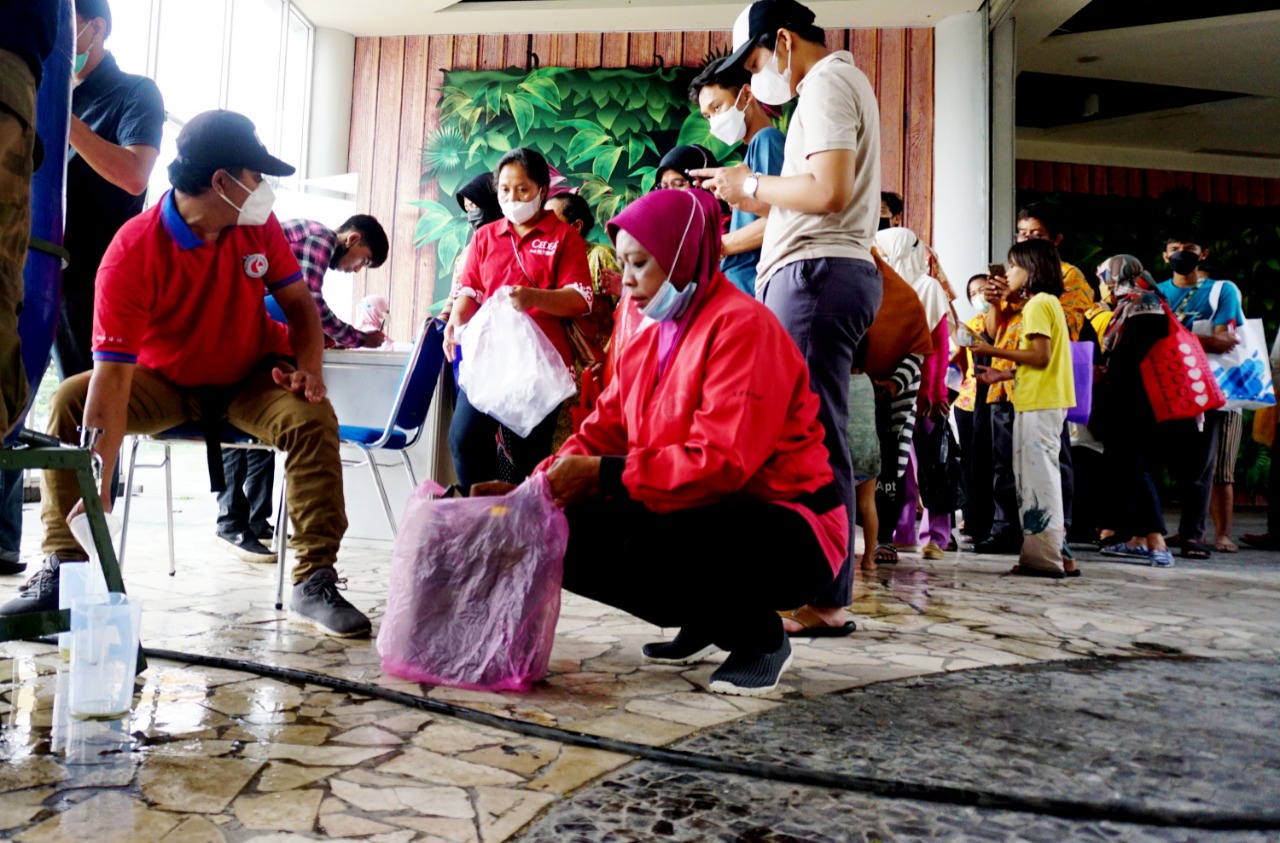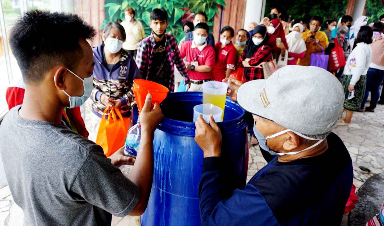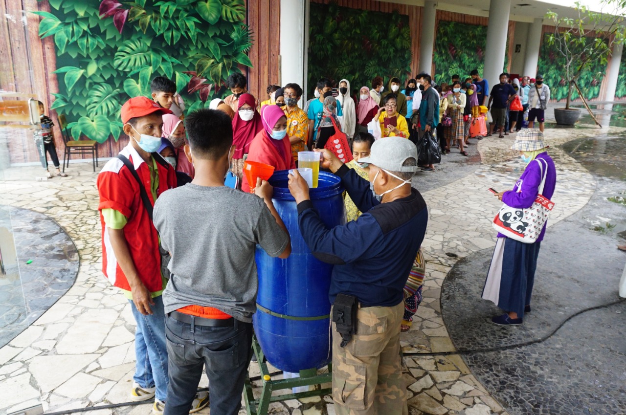 Masyarakat antri membeli minyak Goreng (Curah) murah diacara Festival UMKM dan Kebudayaan 2022 Kota Tangerang, Festival yang di adakan di Mall Bale Kota bekerja sama dengan Dinas Perindustrian Koperasi dan UMKM (Perindagkop dan UMKM), Dinas Budaya dan Pariwisata (Budpar) Kota Tangerang dan Komisi 6 DPR RI melalui Partai PDI Perjuangan (PDIP) yang diwakili oleh Ananta Wahana bertujuan untuk memberikan semangat bagi para pelaku UMKM yang ada di Tangerang, dalam acara tersebut selain menjual hasil produk UMKM juga ada pagelaran seni dari berbagai macam karya seni. Sabtu (26/3/22). Banten Aktual/Dennys