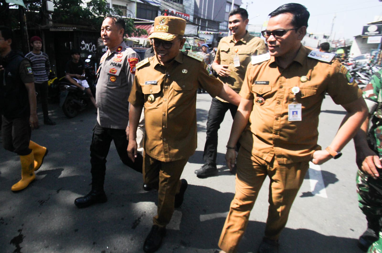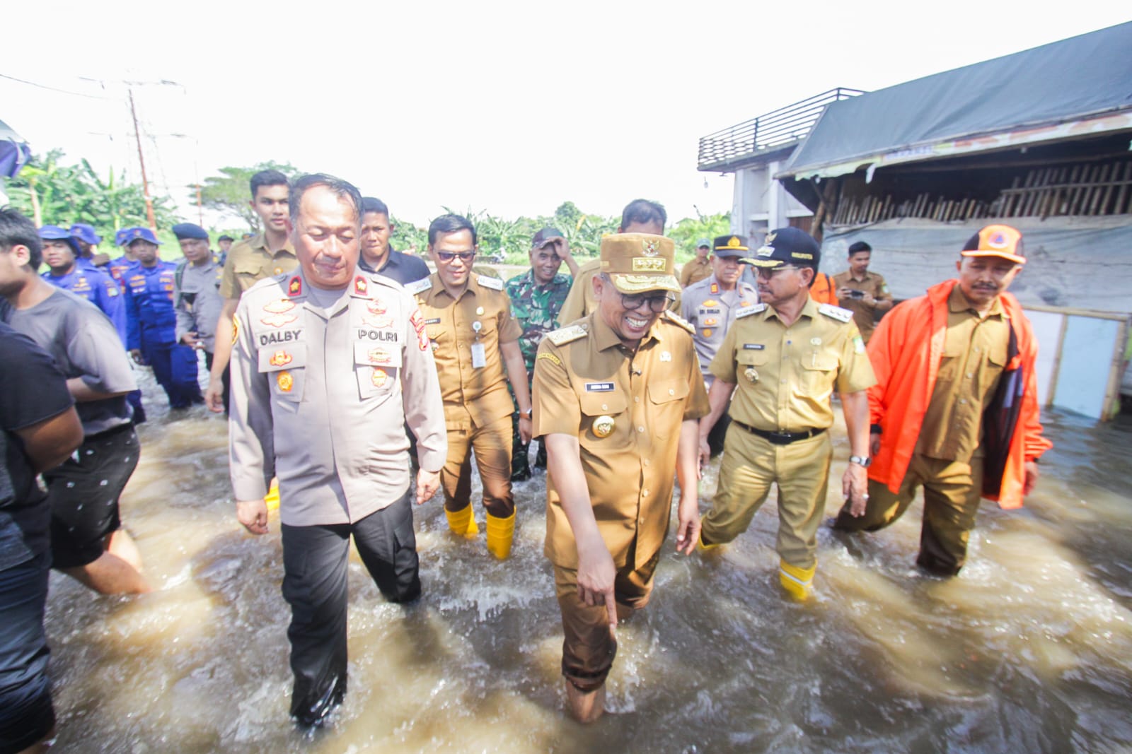 Gubernur Banten Andra Soni dan Walikota Tangerang Sachrudin meninjau banjir di Perumahan Ciledug Indah Kecamatan Ciledug Kota Tangerang. Putusnya Jalan menuju Jakarta membuat warga mengurangi aktifitas pekerjaannya. Hal tersebut di karnakan Banjir yang menggenangi rumah mereka. Ratusan rumah tergenang air akibat meluapnya sungai Pesanggrahan. Selasa (08/07/25). Banten Aktual/Dennys