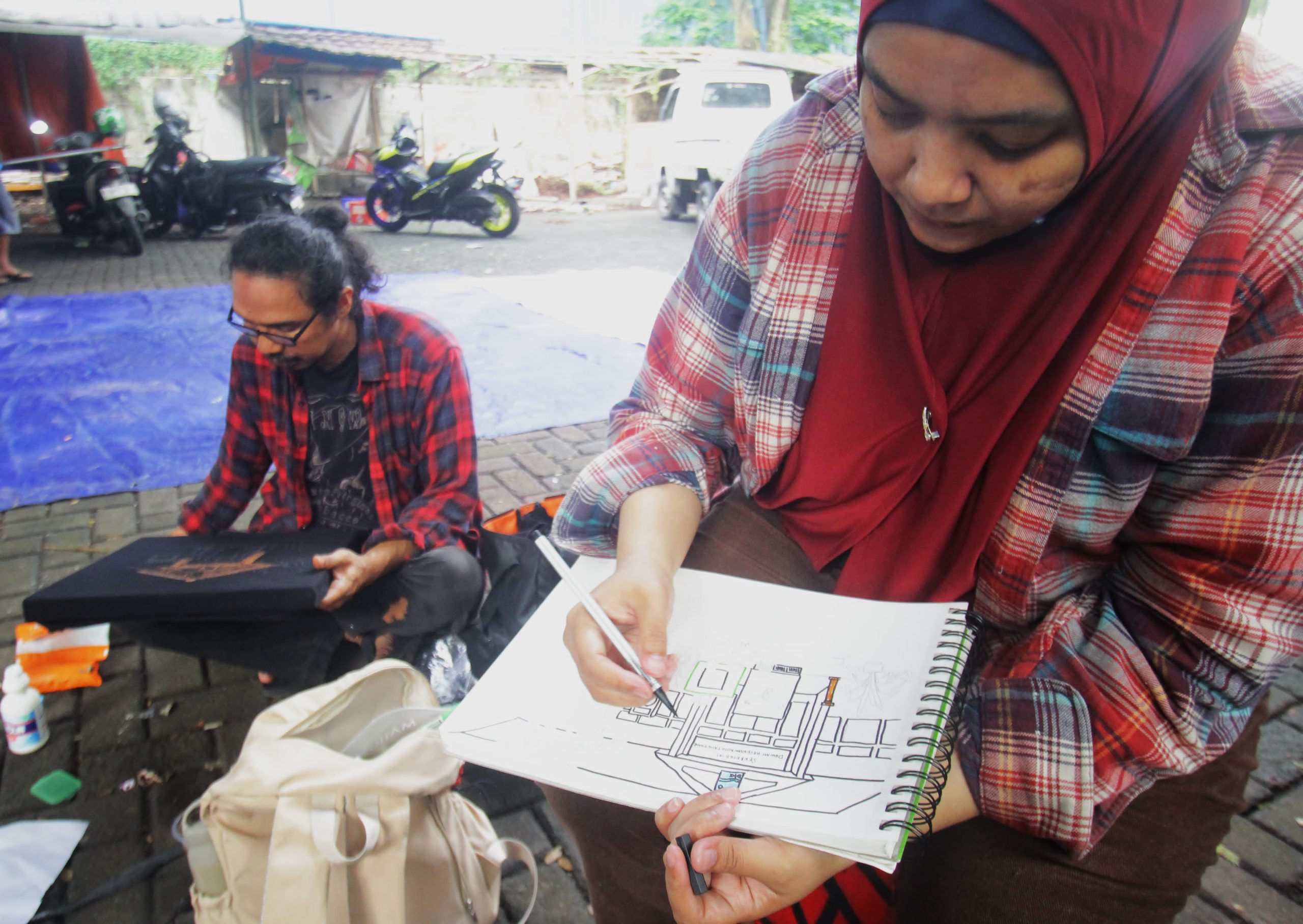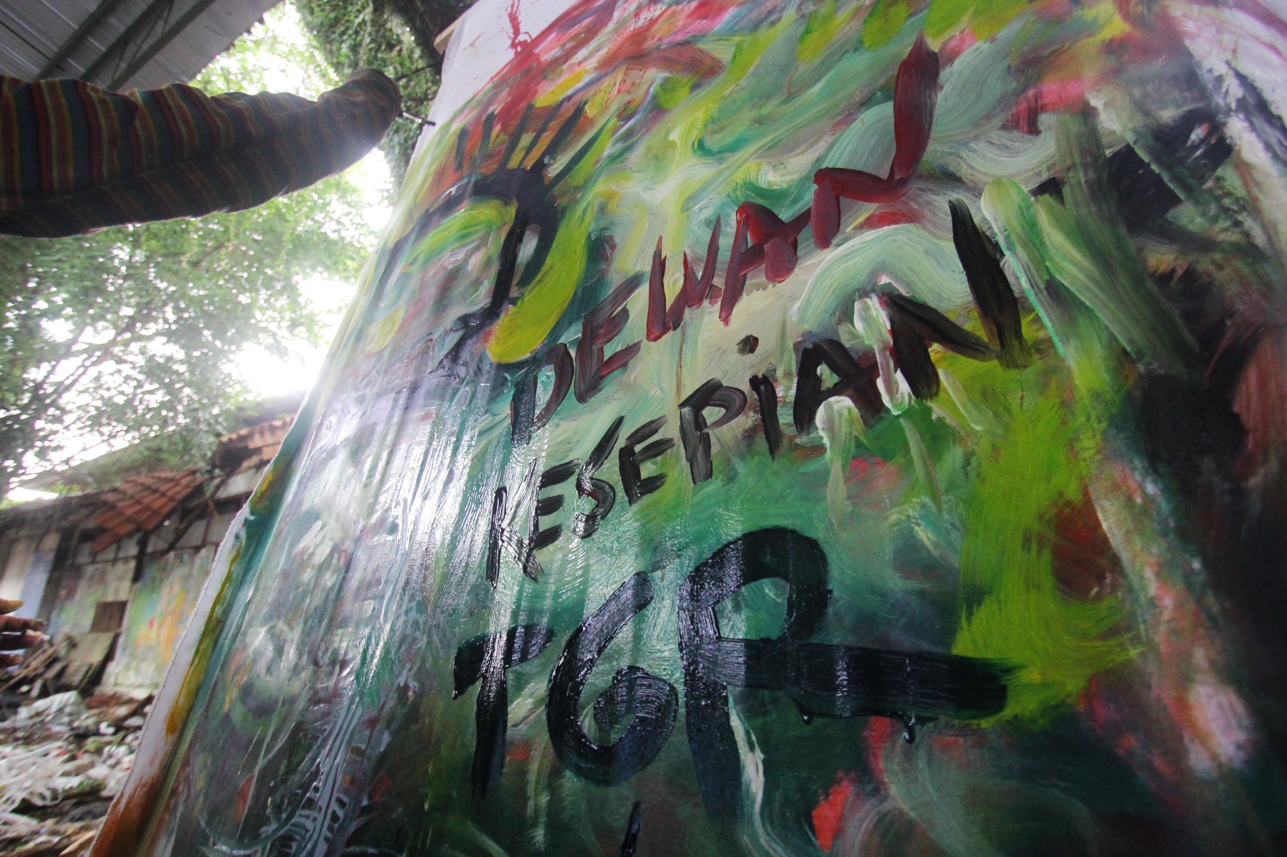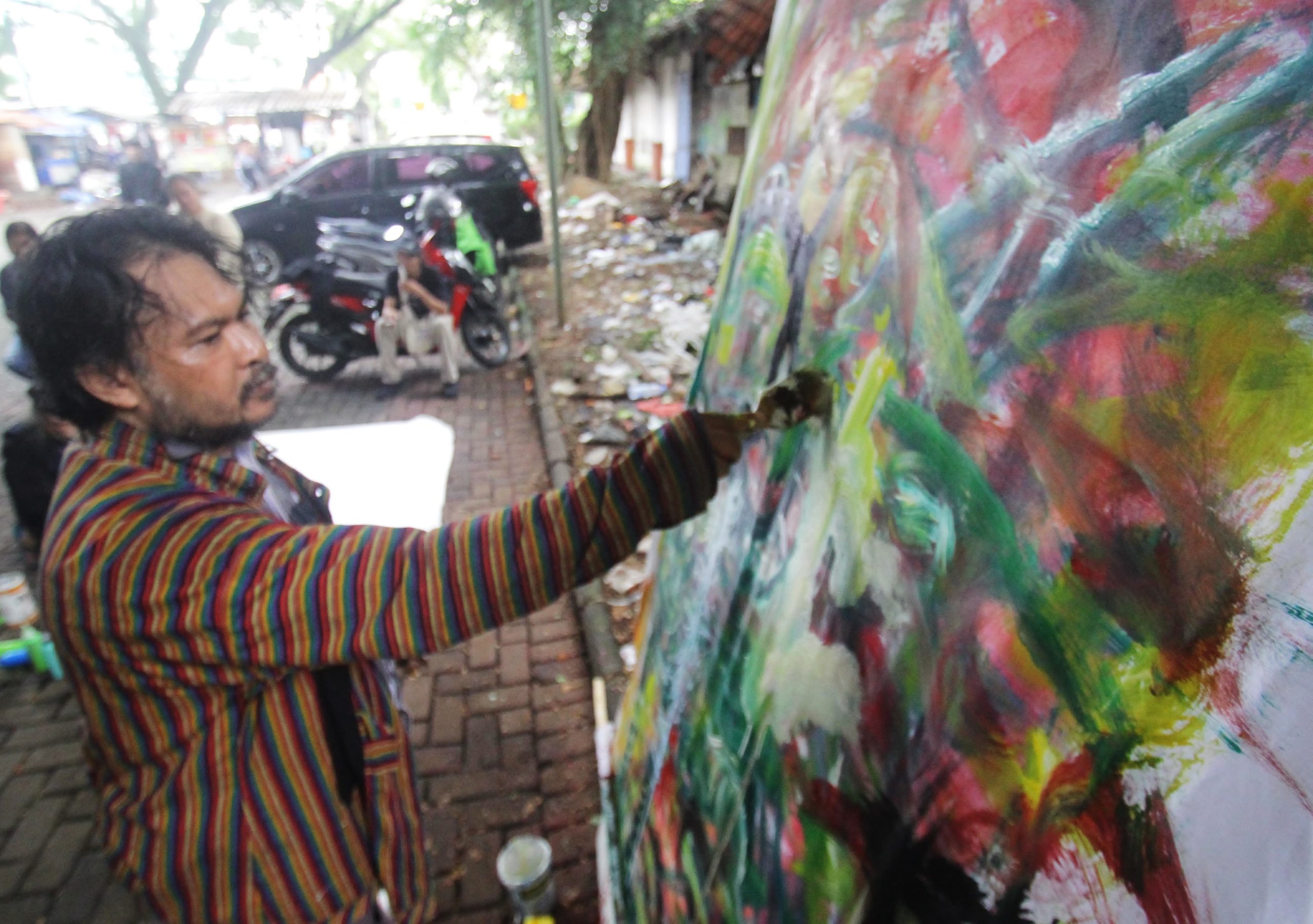 Sejumlah Seniman yang tergabung di Dewan Kesenian Tangerang (DKT) berkumpul di gedung lama Dewan Kesenian Tangerang guna mengenang perjalanan gedung lama DKT, dimana banyak melahirkan seniman besar. Gedung Kesenian lama akan dijadikan parkir RSUD Kota Tangerang. Pemerintah Kota Tangerang memindahkan kegiatan para seniman di dekat Gedung Kesenian yang baru yang wilayahnya masih di Perumahan Modernland Kota Tangerang. Tampak terlihat seniman lukis dan musik sedang menggelar aksinya. Minggu (25/05/25). Banten Aktual/Dennys