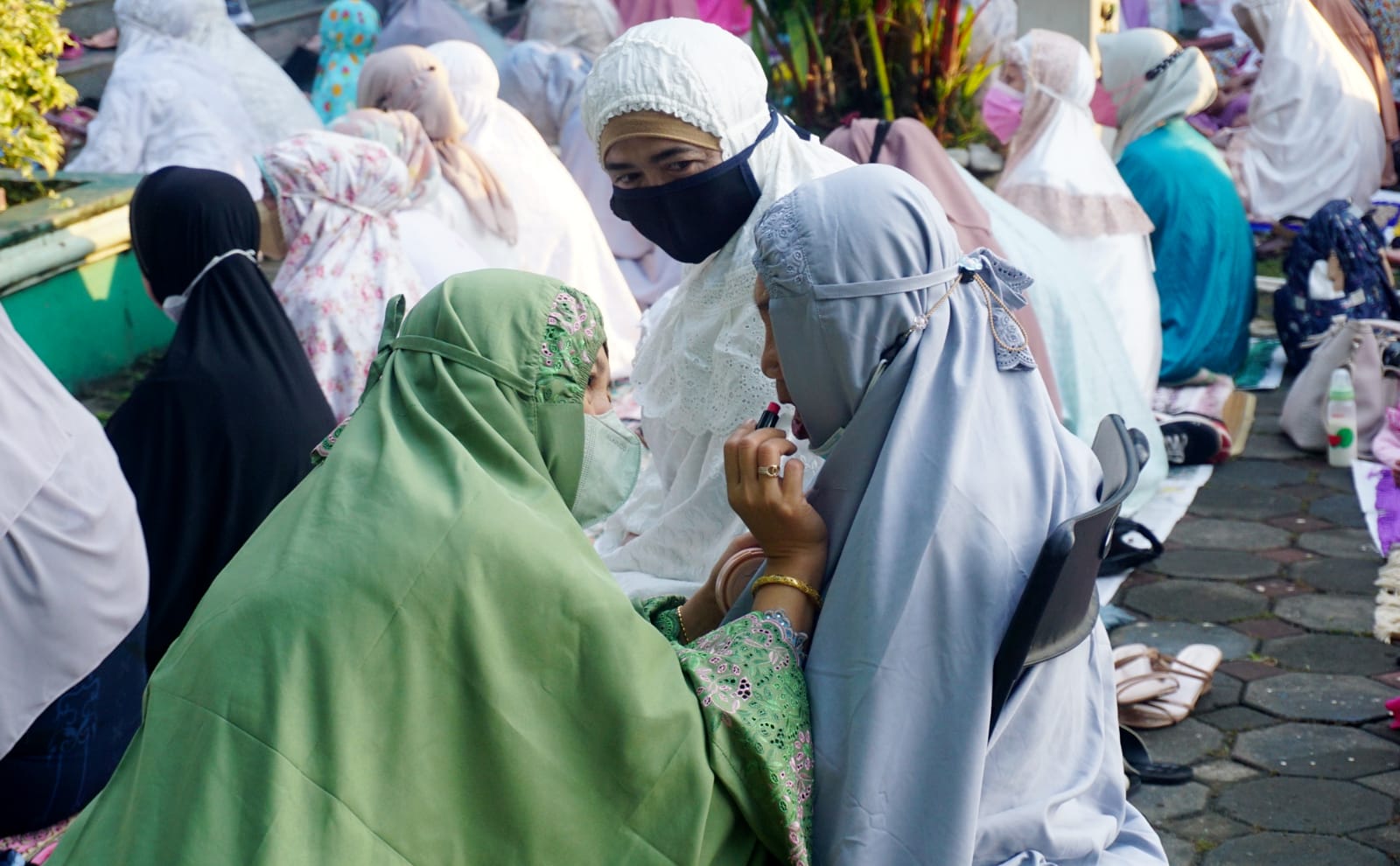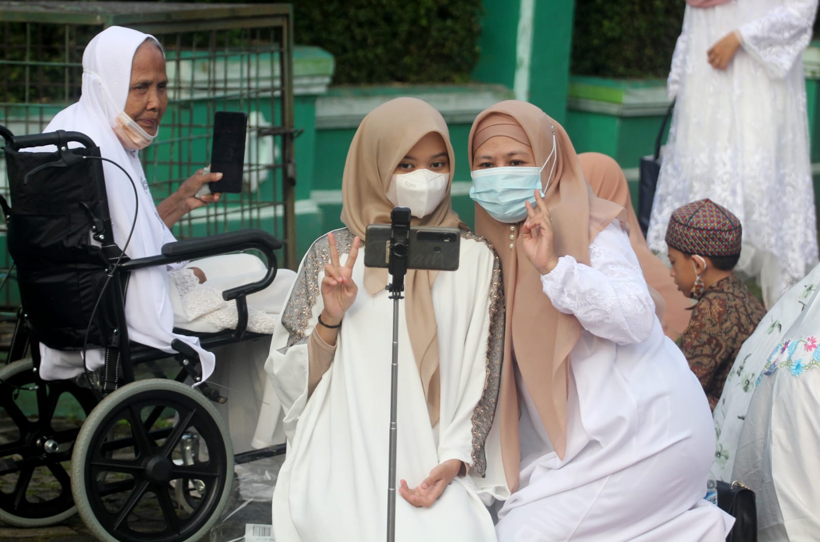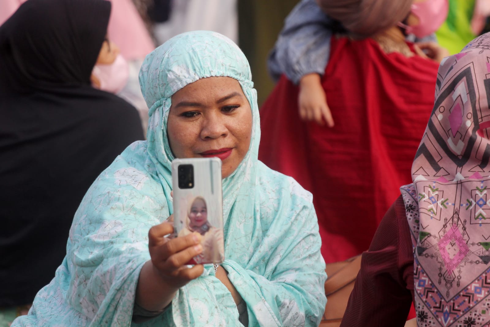 Silaturahmi era milenial menjadi satu hal yang dianggap penting bagi masyarakat Indonesia pada hari lebaran, terutama mereka yang tidak bisa melaksanakan mudik (pulang kampung). Majunya teknologi saat ini sangat lah membantu mereka yang jauh dari sanak keluarga. Seperti terlihat warga yang sedang melakukan Video Call kepada orang yang mereka cintai usai melaksanakan sholat Ied di masjid Al Azhom Kota Tangerang. Senin (2/5/22). Banten Aktual/Dennys