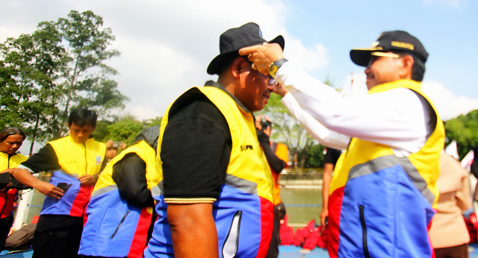 Pemerintah Kota (Pemkot) Tangerang terus berkomitmen mendorong kolaborasi lintas sektor dalam memperkuat mitigasi bencana. Hal ini disampaikan dalam pelantikan pengurus Forum Pengurangan Risiko Bencana (FPRB) Kota Tangerang Periode 2026-2029. Dalam acara tersebut di gelar juga simulasi Bencana oleh seluruh elemen yang terlibat dalam pengurusan FPRB Kota Tangerang di Sungai Cisadane Kota Tangerang. Terlihat Walikota Tangerang melantik Pengurus FPRB Kota Tangerang dengan memakaikan topi Rimba Kepada Ketua FPRB Kota Tangerang Supiani. Minggu (26/04/26). Banten Aktual/Dennys