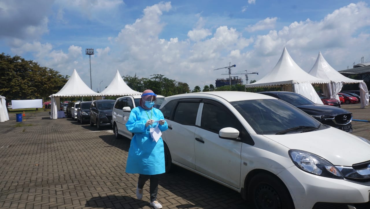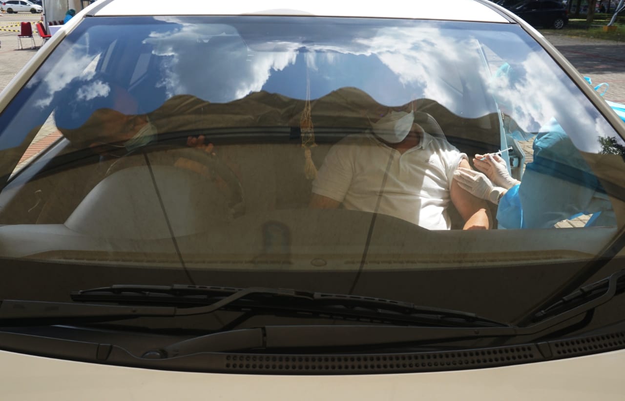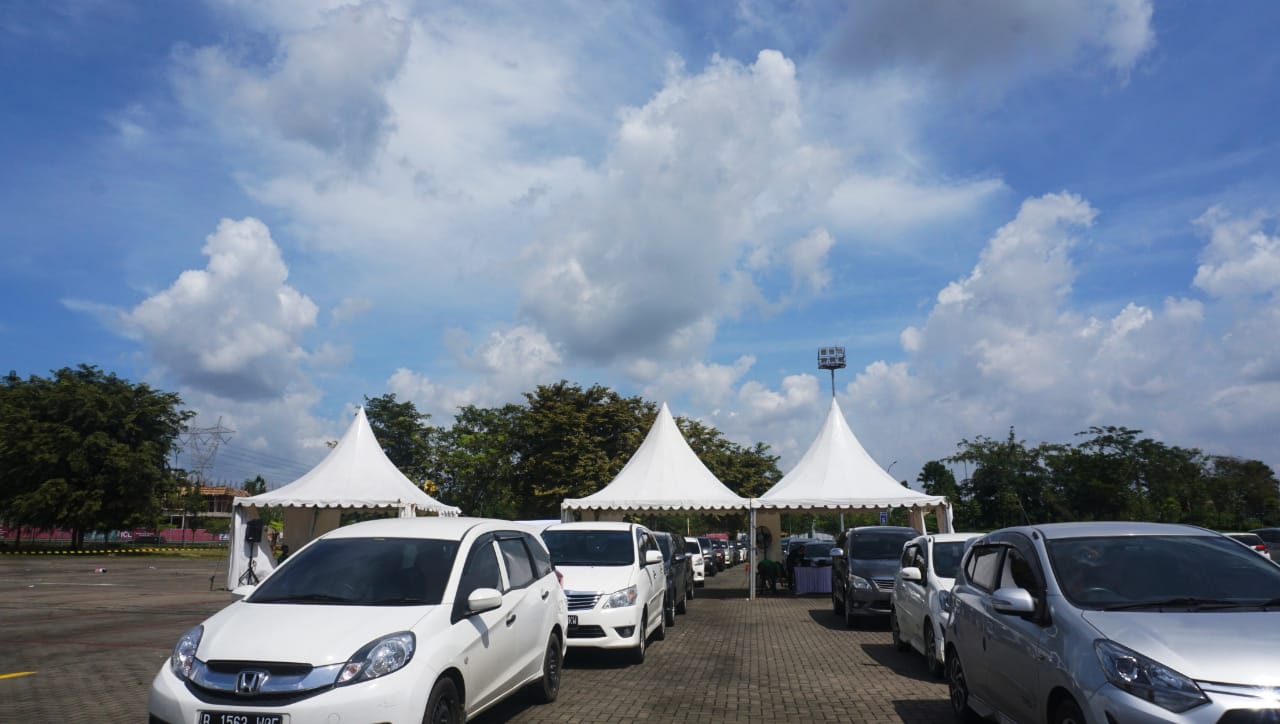 Vaksinasi Drive Thru mobil dan motor yang di gagas oleh Perusahaan Transportasi Online bagi para pengemudi, pengguna jasa dan lansia yang diadakan di Halaman parkir ICE BSD, Kabupaten Tangerang. Acara tersebut di hadiri oleh Budi Gunadi Sadikin (Menkes), Bambang Permadi Sumantri Brojonegoro (Menristek) dan pejabat di wilayah tersebut. Sabtu (13/3/21). Banten Aktual/Dennys