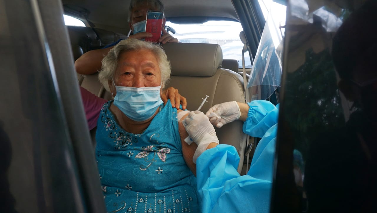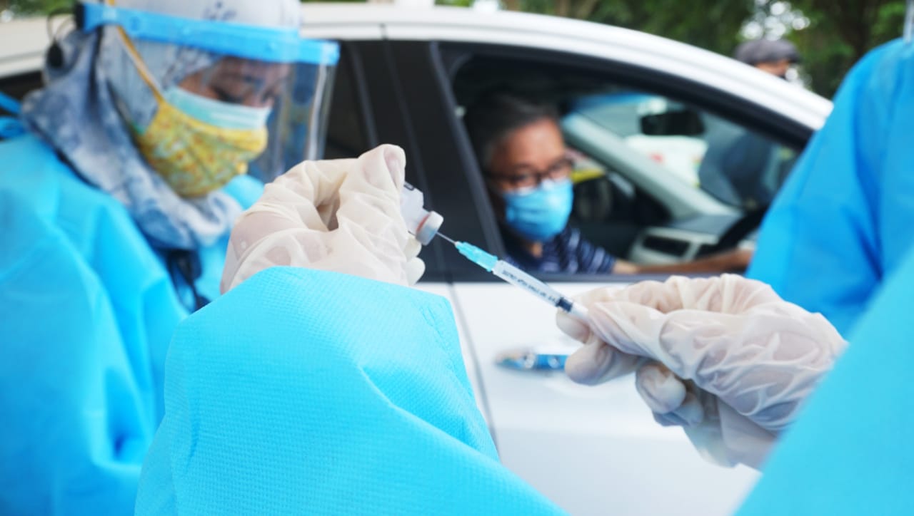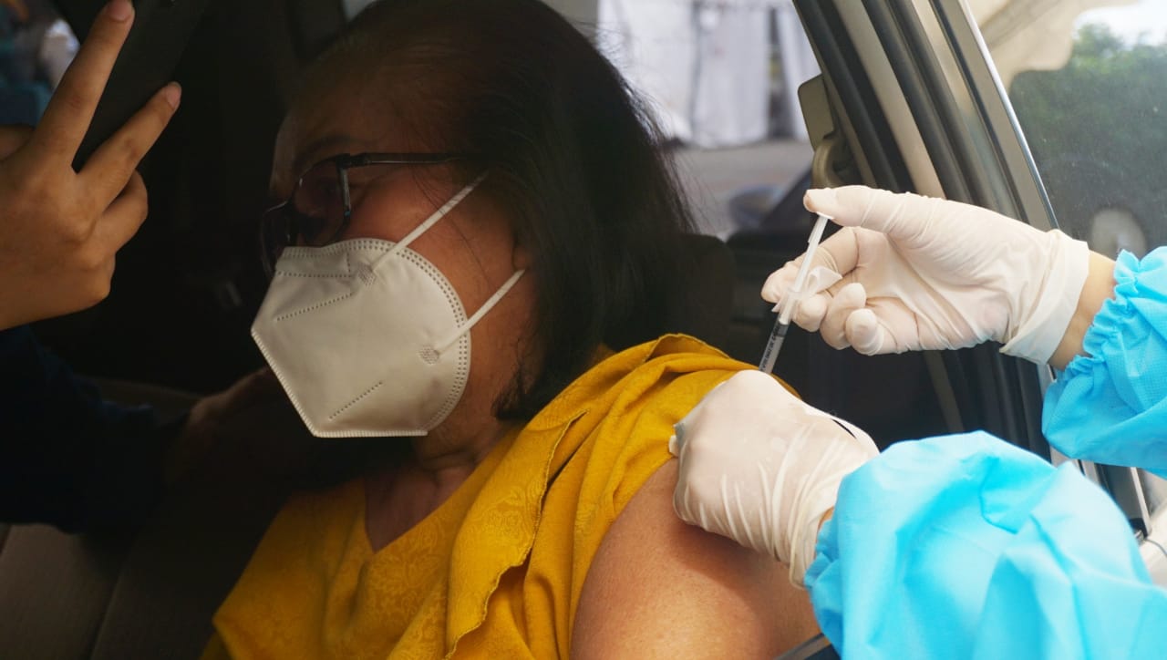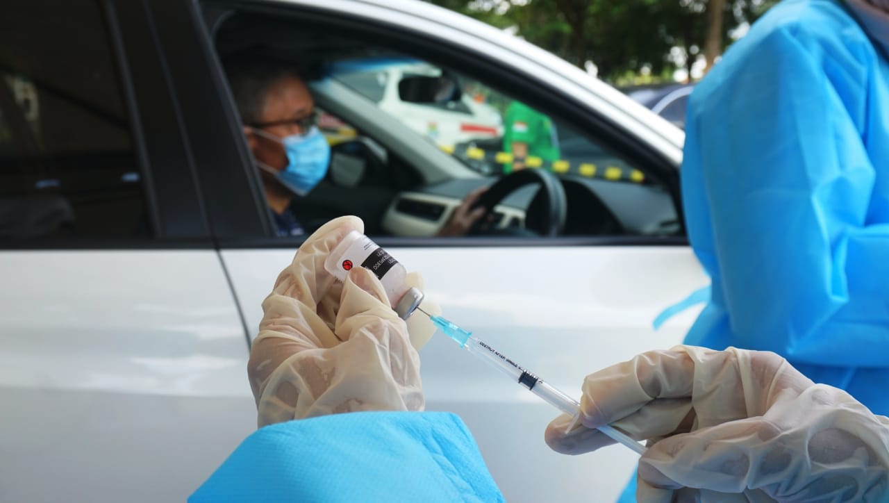 Vaksinasi Drive Thru mobil dan motor yang di gagas oleh Perusahaan Transportasi Online bagi para pengemudi, pengguna jasa dan lansia yang diadakan di Halaman parkir ICE BSD, Kabupaten Tangerang. Acara tersebut di hadiri oleh Budi Gunadi Sadikin (Menkes), Bambang Permadi Sumantri Brojonegoro (Menristek) dan pejabat di wilayah tersebut. Sabtu (13/3/21). Banten Aktual/Dennys