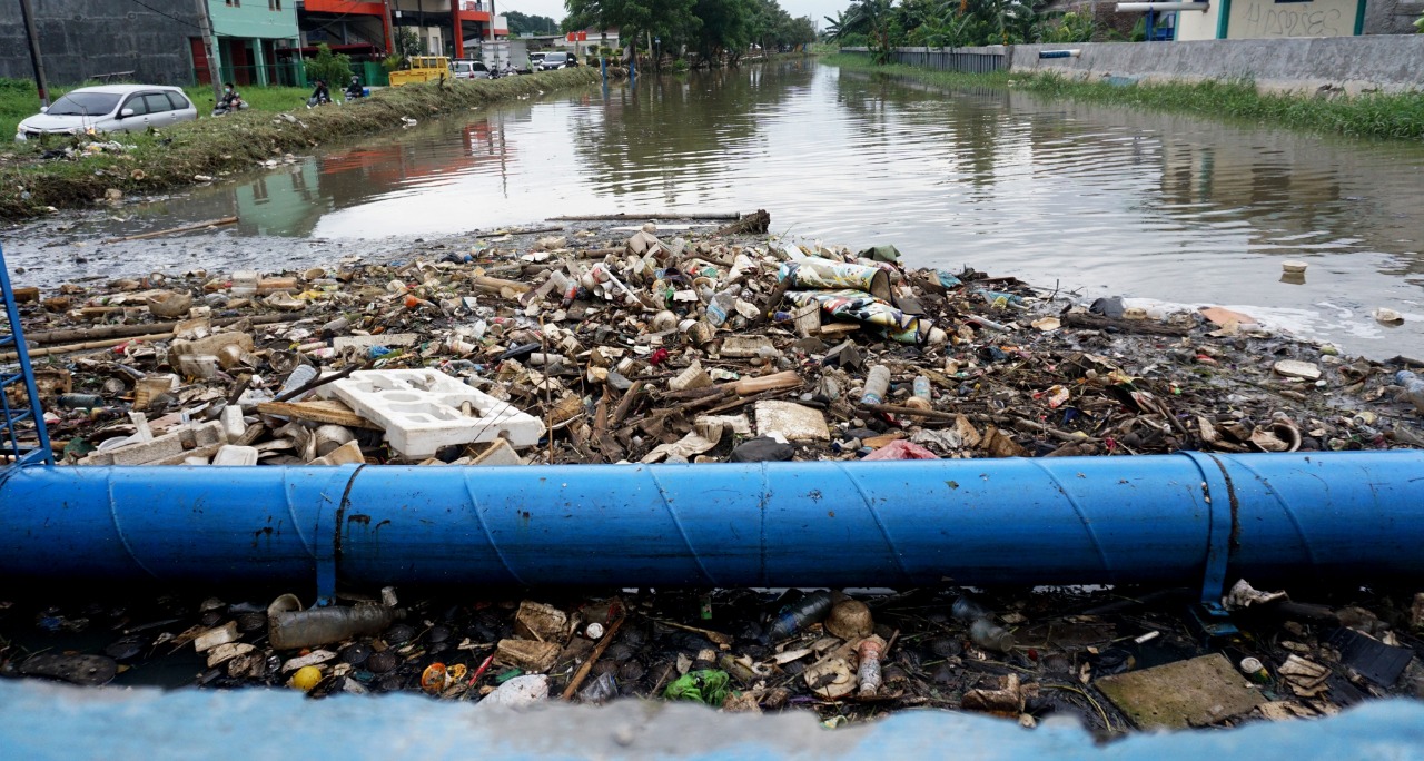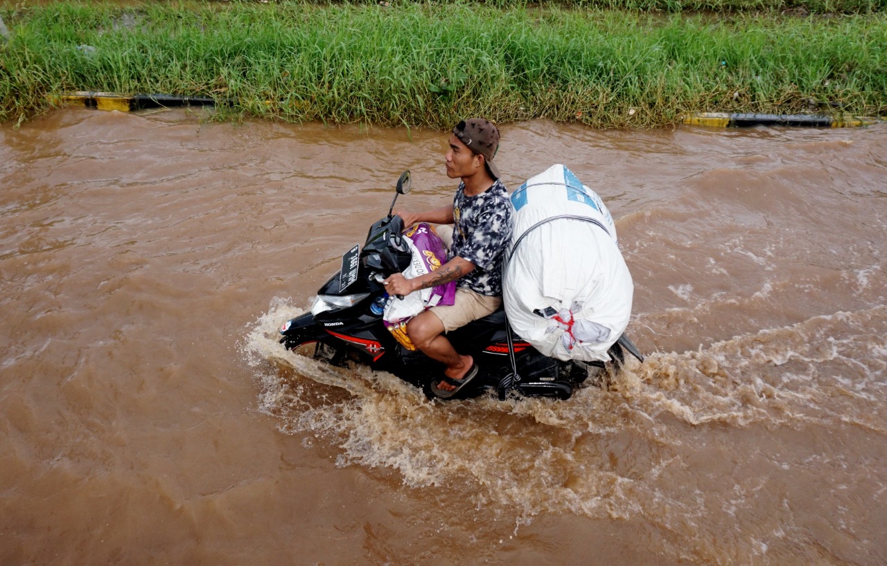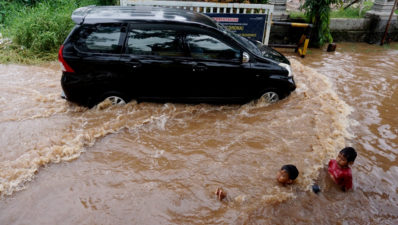 Sejumlah ruas jalan Perumahan Total Persada Kelurahan. Gembor Kecamatan. Periuk Kota Tangerang. Tergenang air yang meluap dari Kali Leduk akibat di guyur hujan tadi malam. Akibat banjir tersebut warga yang melintas dengan kendaraan bermotor roda dua mogok di tengah genangan yang dalamnya hampir selutut orang dewasa. Rabu (3/2/21). Banten Aktual/Dennys
