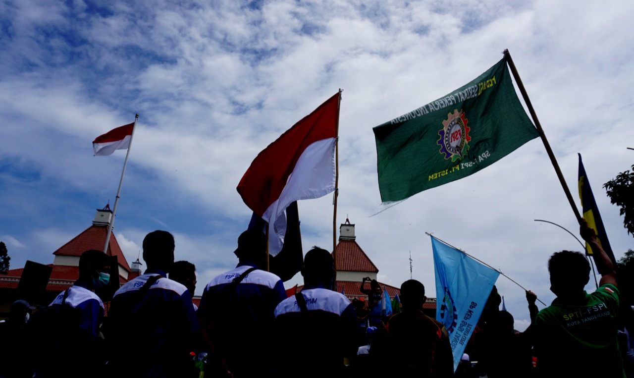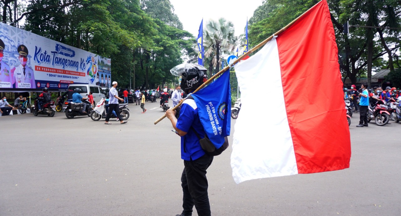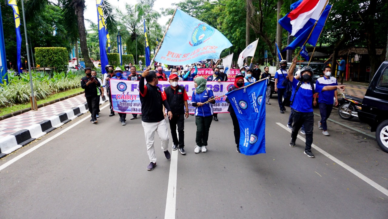 Ratusan Buruh yang tergabung dengan Buruh Banten Bersatu (B3) datangi Gedung Dewan Perwakilan Rakyat Daerah (DPRD) Kota Tangerang untuk menggelar aksi atas Permenaker no.2 tahun 2022 tentang pencairan dana Jaminan Hari Tua (JHT). Dalam aksinya kali ini Ketua DPRD Kota Tangerang Gatot Wibowo menerima dan sekaligus menjemput 18 perwakilan dari buruh untuk mendengarkan keingainan buruh agar mencabut Permenaker tersebut, karena menurut buruh sudah cacat dalam hukum dan menyakiti hati buruh Indonesia. Kamis (24/2/22). Banten Aktual/Dennys.