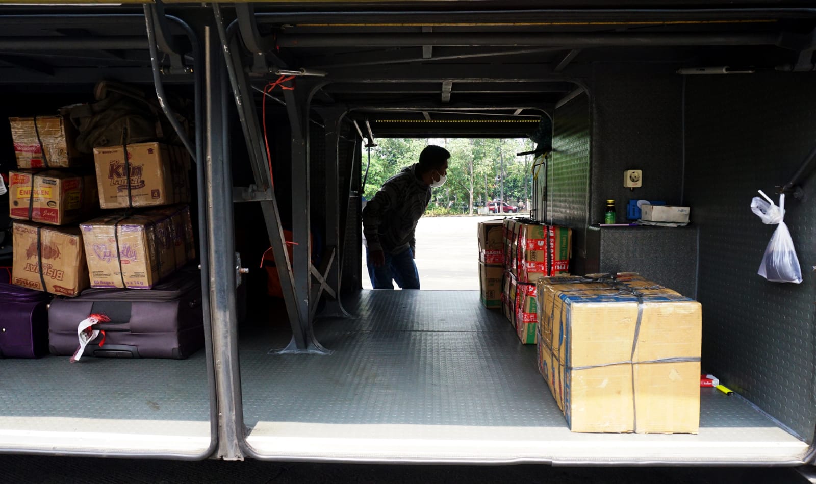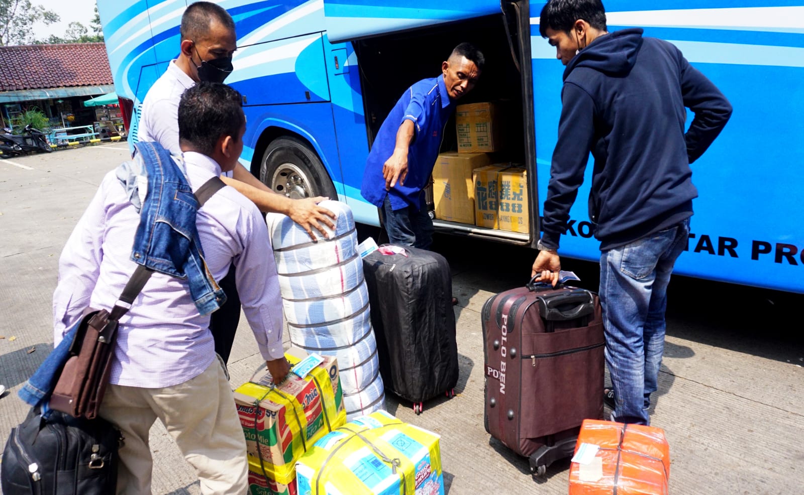 Memasuki Minggu ketiga bulan ramadhan di Terminal Poris Pelawad Kota Tangerang mulai terlihat kesibukan para pemudik, terlihat di jalur jurusan Jawa timur dan lintas Sumatra para pemudik mulai berdatangan dengan menenteng barang bawaannya, juga para kernet bus sedang memasukan barang bawaan kedalam bagasi bus yang siap berangkat. Senin (18/4/22). Banten Aktual/Dennys