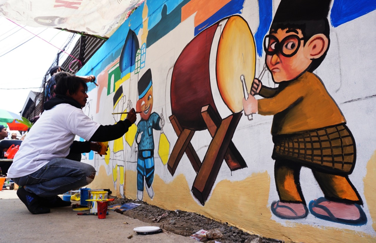 Sebanyak 18 tim seniman mural mengikuti lomba mural di Kelurahan Pasir Jaya Kecamatan Jatiuwung Kota Tangerang, lomba mural yang mengangkat tema Ramadhan ini menjadi satu momen jelang bulan puasa, selain itu dalam setiap gambar para seniman mural diminta untuk membuat lukisan yang dapat memberikan informasi maupun ajakan dalam menyambut bulan puasa pekan depan. Minggu (27/3/22). Banten Aktual/Dennys