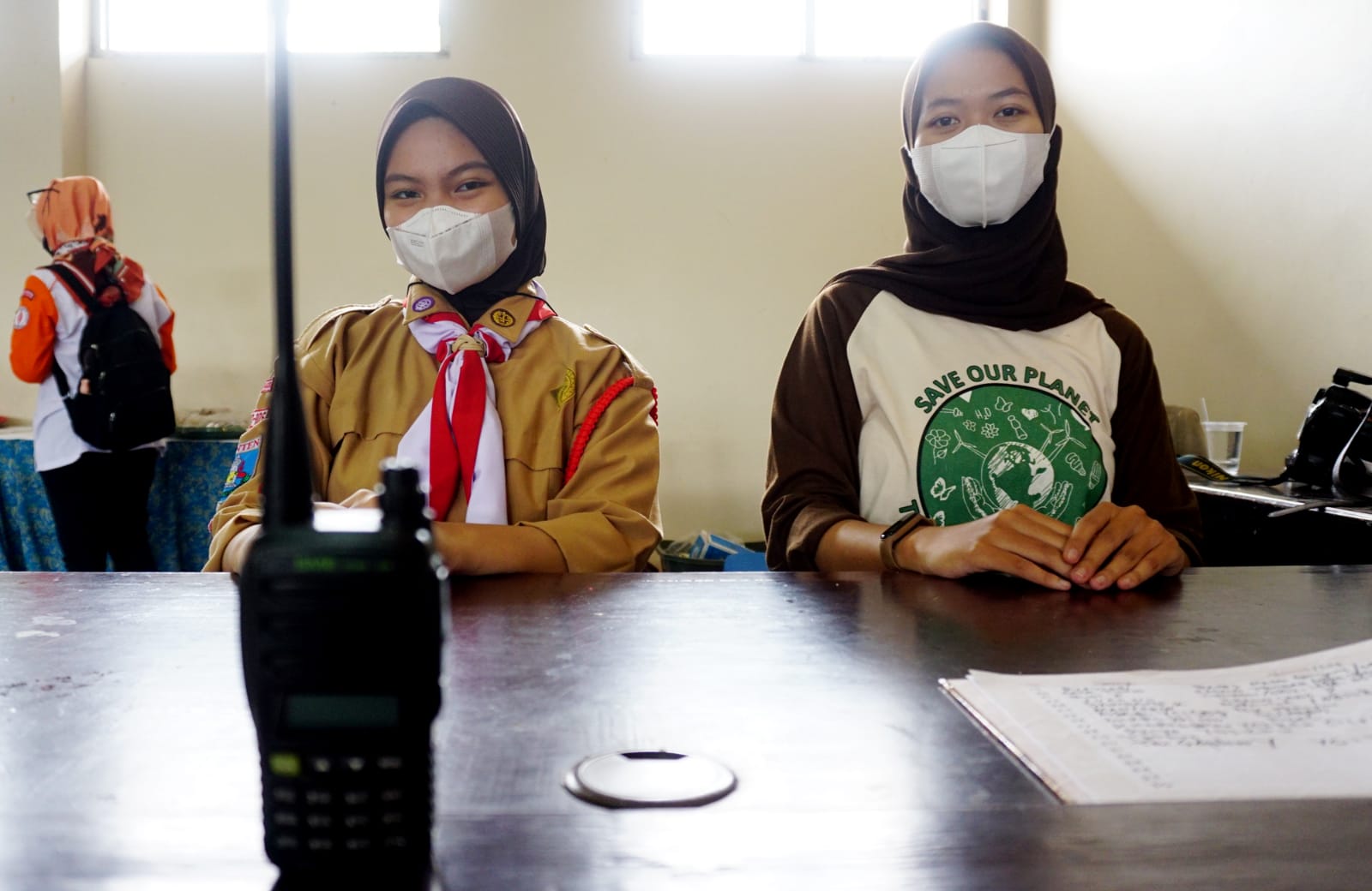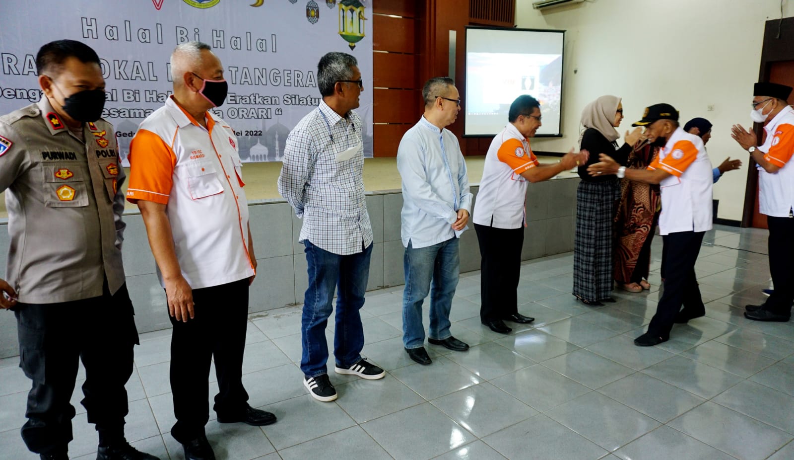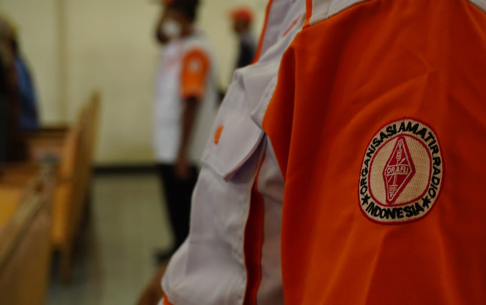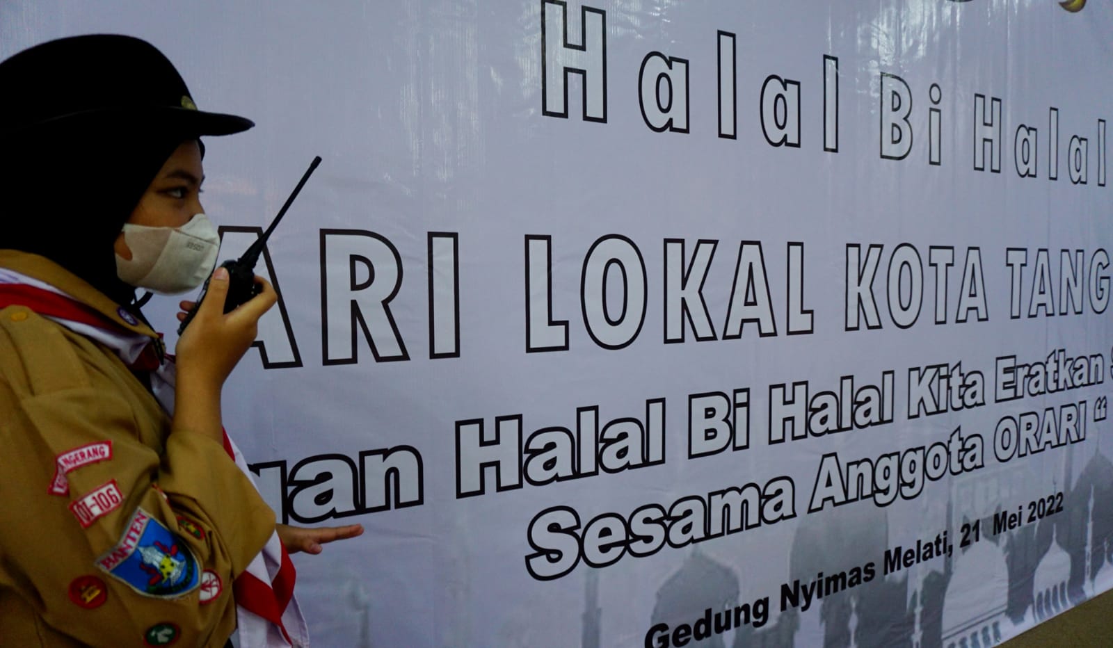 Organisasi Radio Amatir Republik Indonesia (ORARI) Lokal Kota Tangerang adakan Halal Bihalal sesama anggota orari di Gedung Nyimas Melati Kota Tangerang. Dalam kegiatan tersebut terlihat seorang anggota Pramuka kader binaan Oarari sedang berkomunikasi menggunakan Handy Talky (HT). Sabtu (21/5/22). Banten Aktual/Dennys