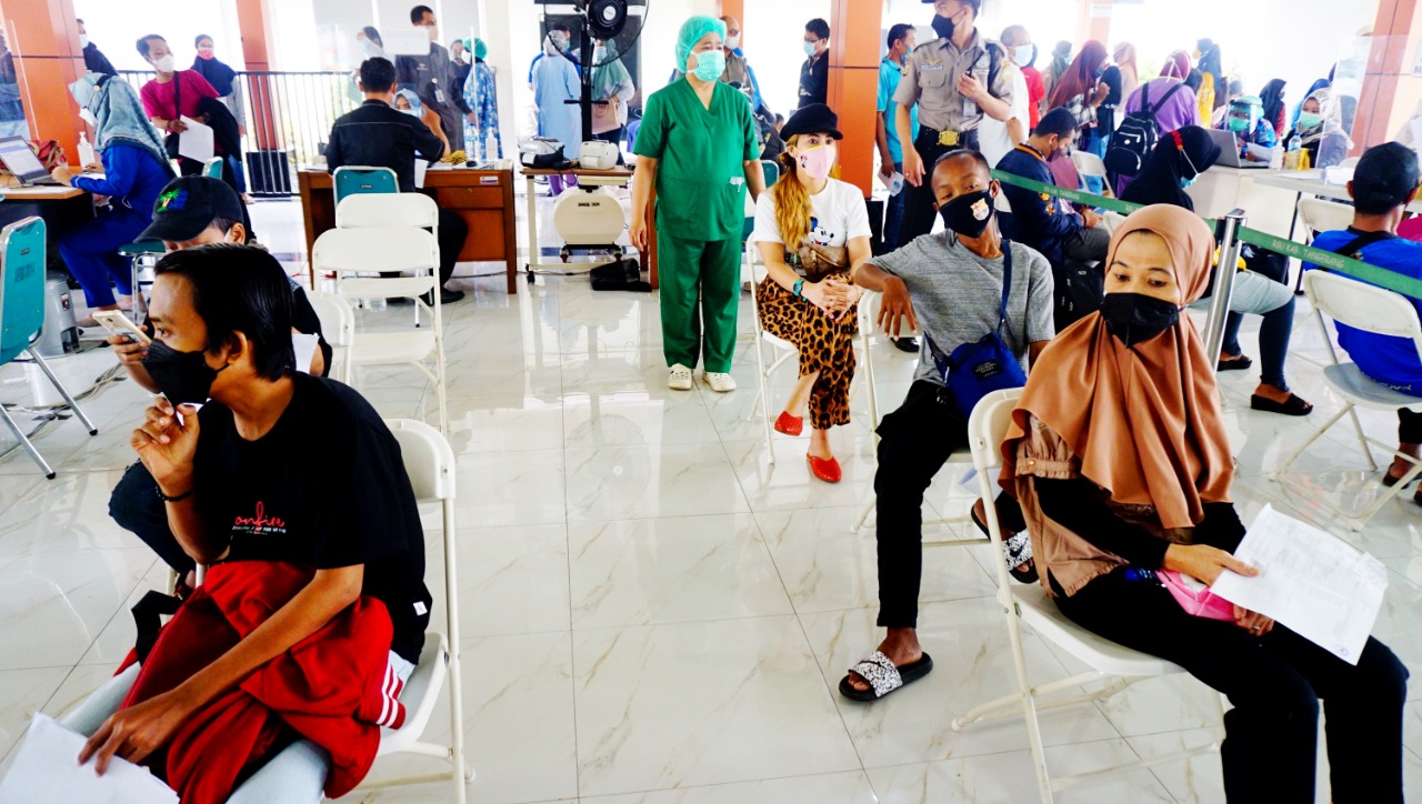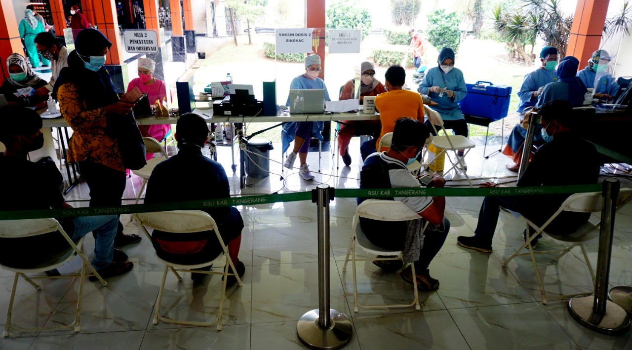 Sebanyak 300 orang pasien Komorbit (Kangker, Thalasemia dan Hemofilia) lakukan Vaksinasi Covid-19 di Rumah Sakit Umum Kabupaten Tangerang dengan menggunakan vaksin Pfizer dan Sinovac. Dalam pemberian vaksin tersebut para peserta vaksin harus di periksa dengan ketat dan harus mendapat rekomendasi dari dokter spesialis penyakit tersebut. Para penerima Vaksin tersebut di dampingi oleh Yayasan Amarilis Kirana yang menjadi yayasan kangker anak di Kota Tangerang. Selasa (31/8/21). Banten Aktual/Dennys.