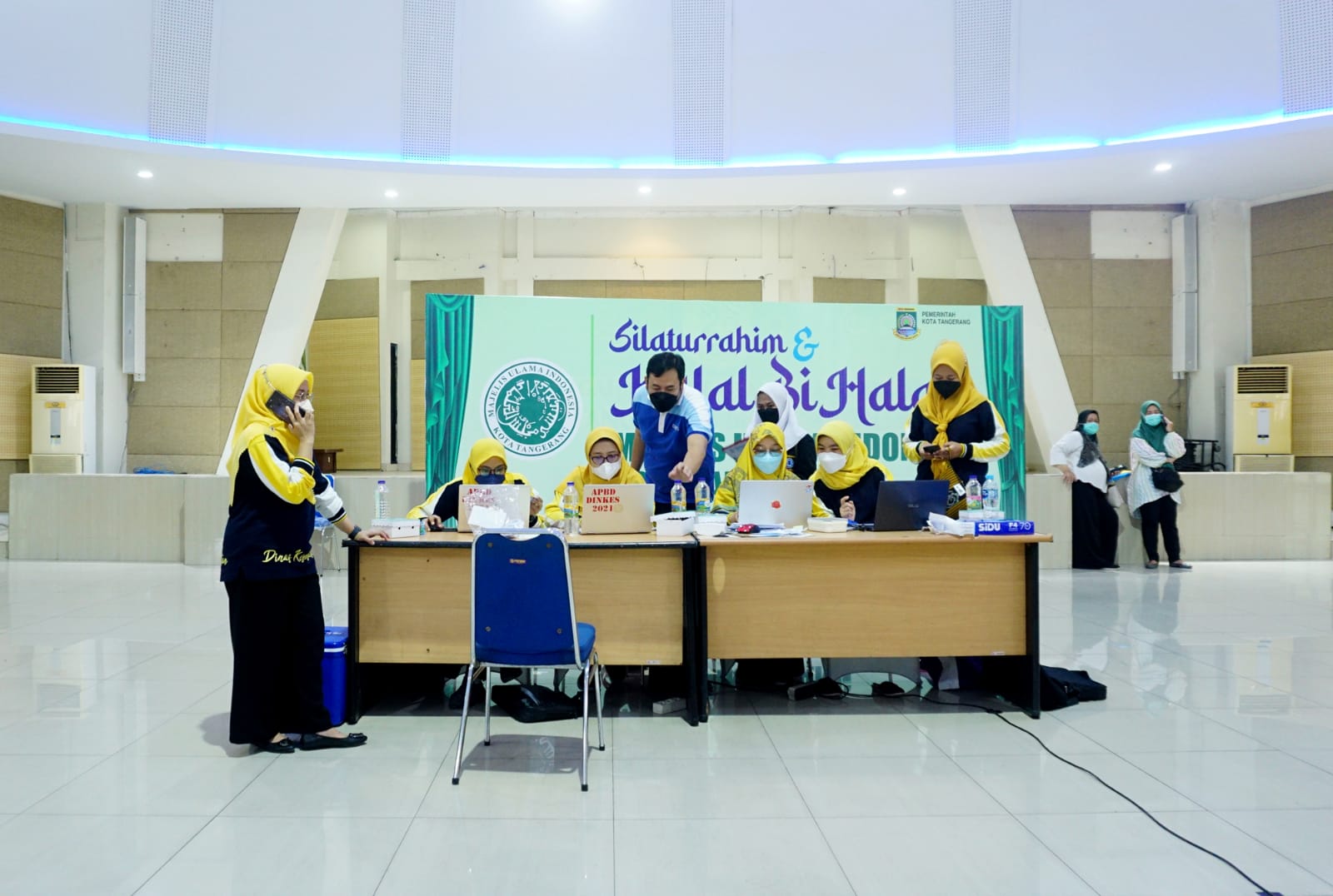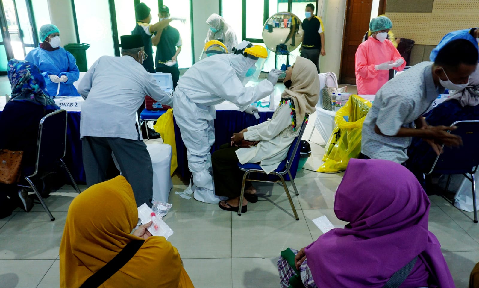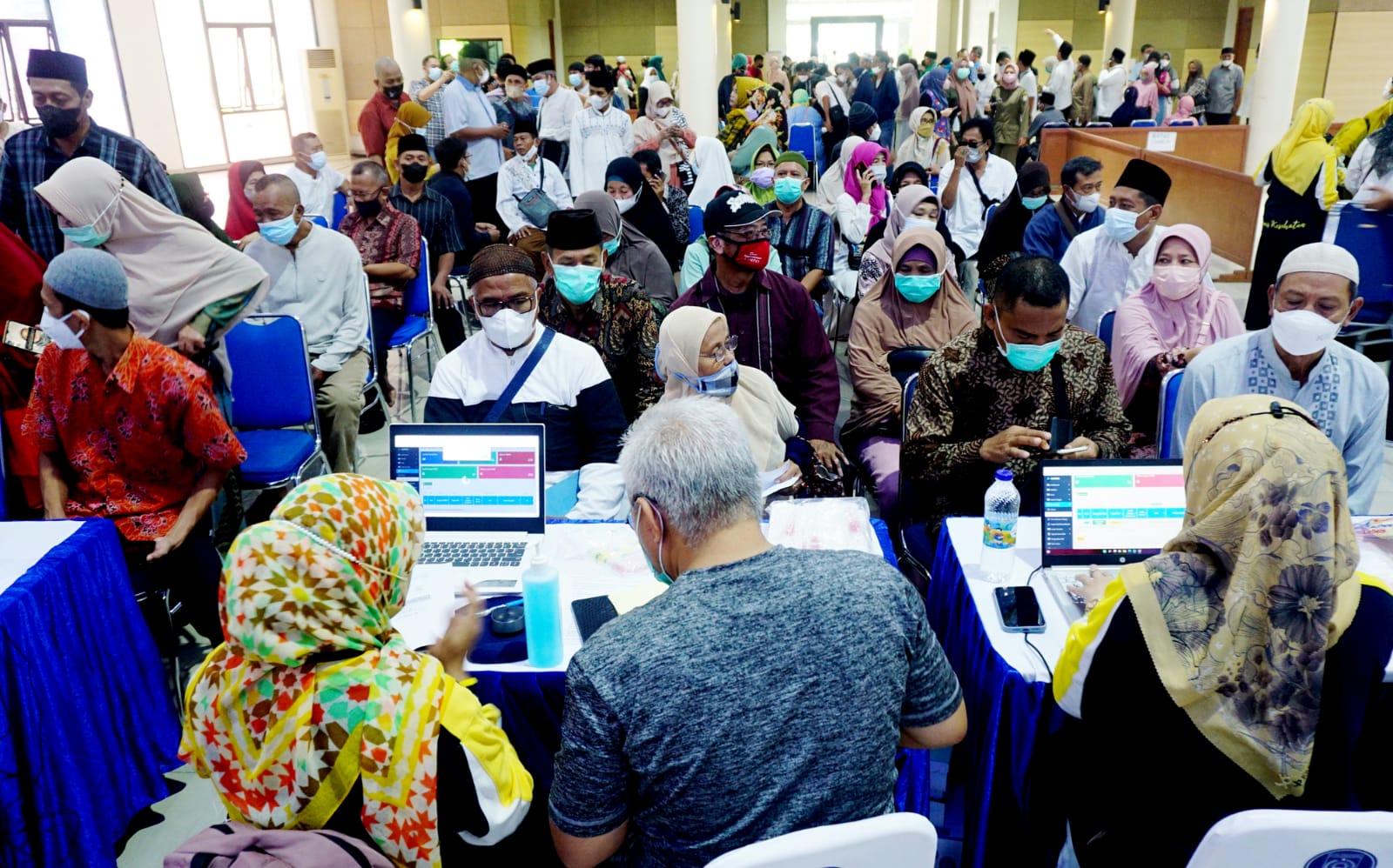Sebanyak 393 Calon Jemaah Haji Kota Tangerang jalankan Tes PCR di gedung Majelis Ulama Indonesia (MUI) Kota Tangerang. Tes PCR menjadi aturan wajib bagi jamaah haji yang dimana aturan tersebut permintaan langsung dari Pemerintah Saudi Arabia. Terlihat antusias para jamaah haji mengantri di lokasi pendaftaran PCR. Jumat (3/6/22). Dennys.