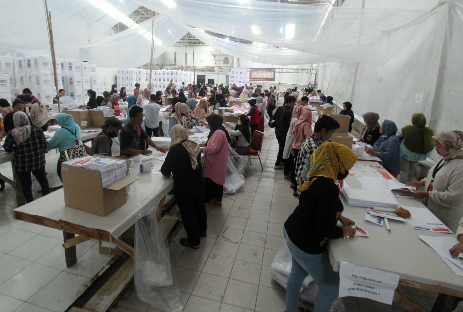 Komisi Pemilihan Umum (KPU) Kota Tangerang kerahkan 120 orang untuk Pelipatan Kertas Suara di Gudang 1. Dalam pelipatan surat suara dibagi menjadi dua shift pagi dan sore, petugas pelipat surat suara di berikan honor sebesar jumlah hasil pelipatan surat suara, untuk satu lembar surat suara DPR dan DPRD di hargai Rp. 500., yang sudah di potong pajak. Saat ini pelipatan surat suara di Gudang 1 Kecamatan Benda surat suara untuk DPRD Banten 8. Kamis (4/1/24). Banten Aktual/Dennys