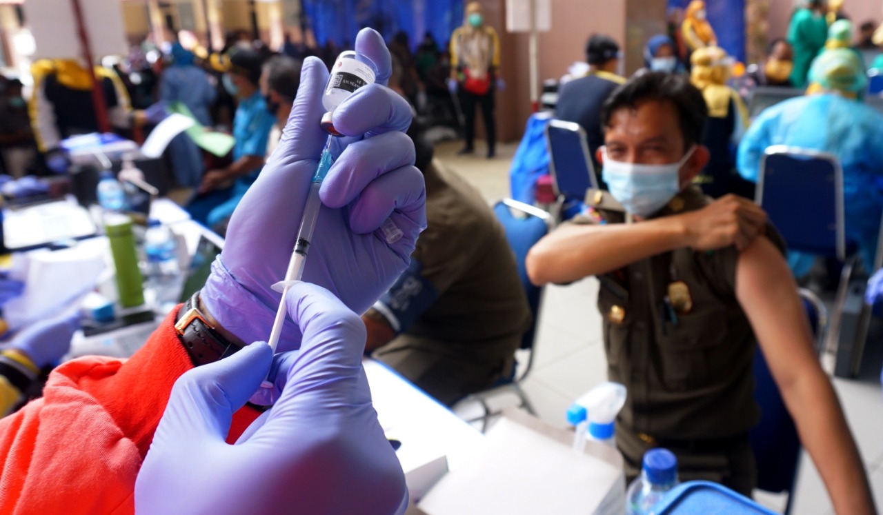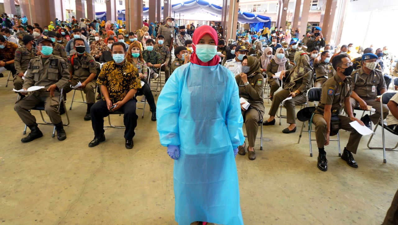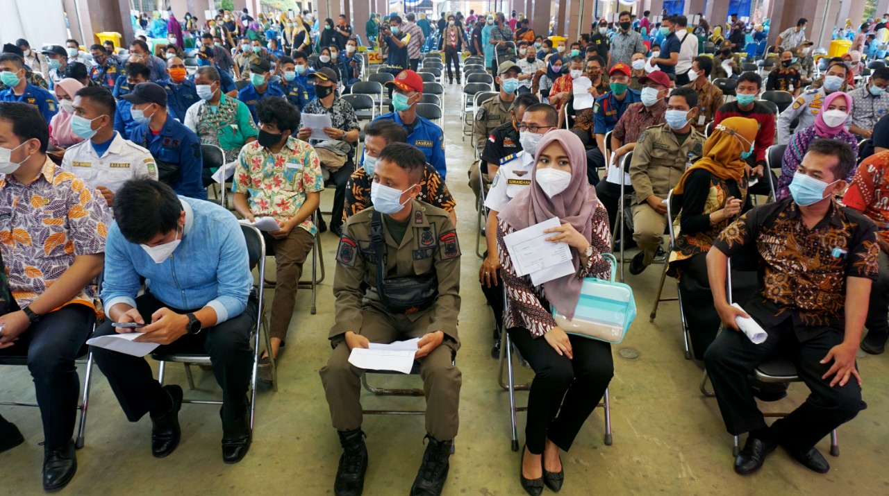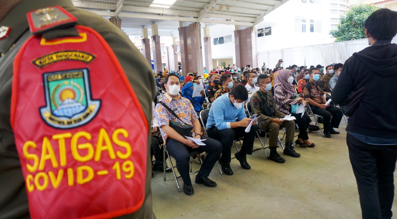 Sebanyak 26 ribu Vaksin Covid-19 mulai di berikan kepada Petugas Pelayanan Publik yang ada di Kota Tangerang. Penerima Vaksin Covid-19 mengantri di Plaza Gedung Pemerintahan Kota Tangerang untuk mendapatkan Penyuntikan Vaksinasi Covid-19 yang menjadi hari pertama bagi petugas pelayanan publik di seluruh Indonesia. Kamis (25/2/21). Banten Aktual/Dennys