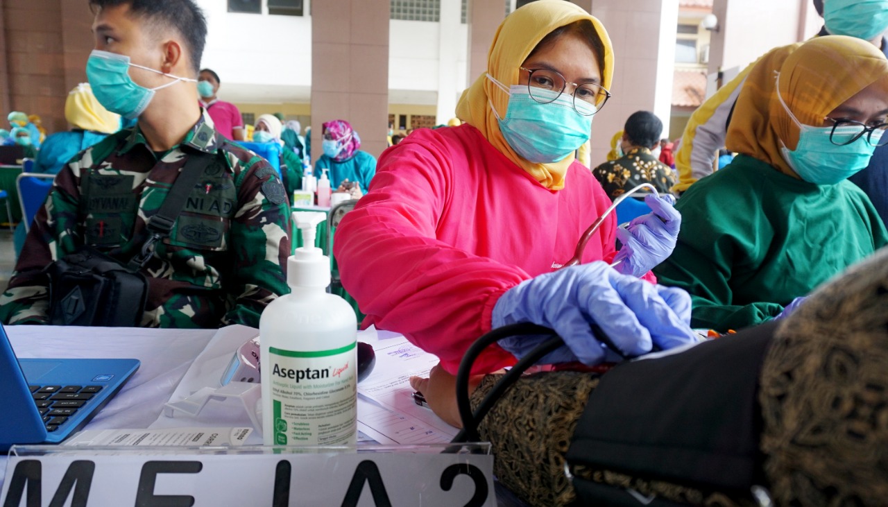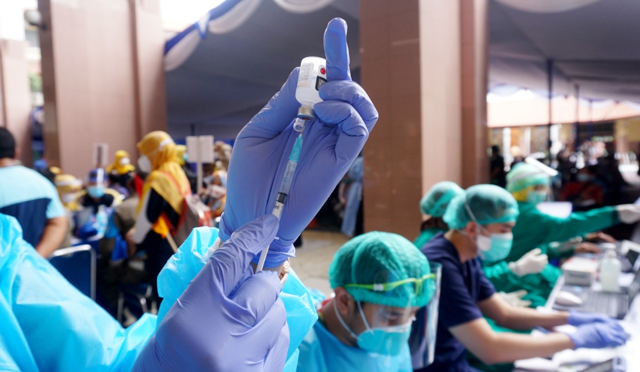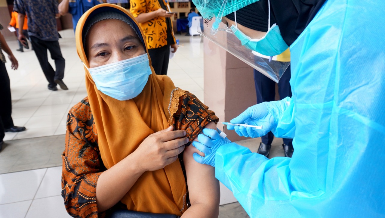 Sebanyak 26 ribu Vaksin Covid-19 mulai di berikan kepada Petugas Pelayanan Publik yang ada di Kota Tangerang. Penerima Vaksin Covid-19 mengantri di Plaza Gedung Pemerintahan Kota Tangerang untuk mendapatkan Penyuntikan Vaksinasi Covid-19 yang menjadi hari pertama bagi petugas pelayanan publik di seluruh Indonesia. Kamis (25/2/21). Banten Aktual/Dennys
