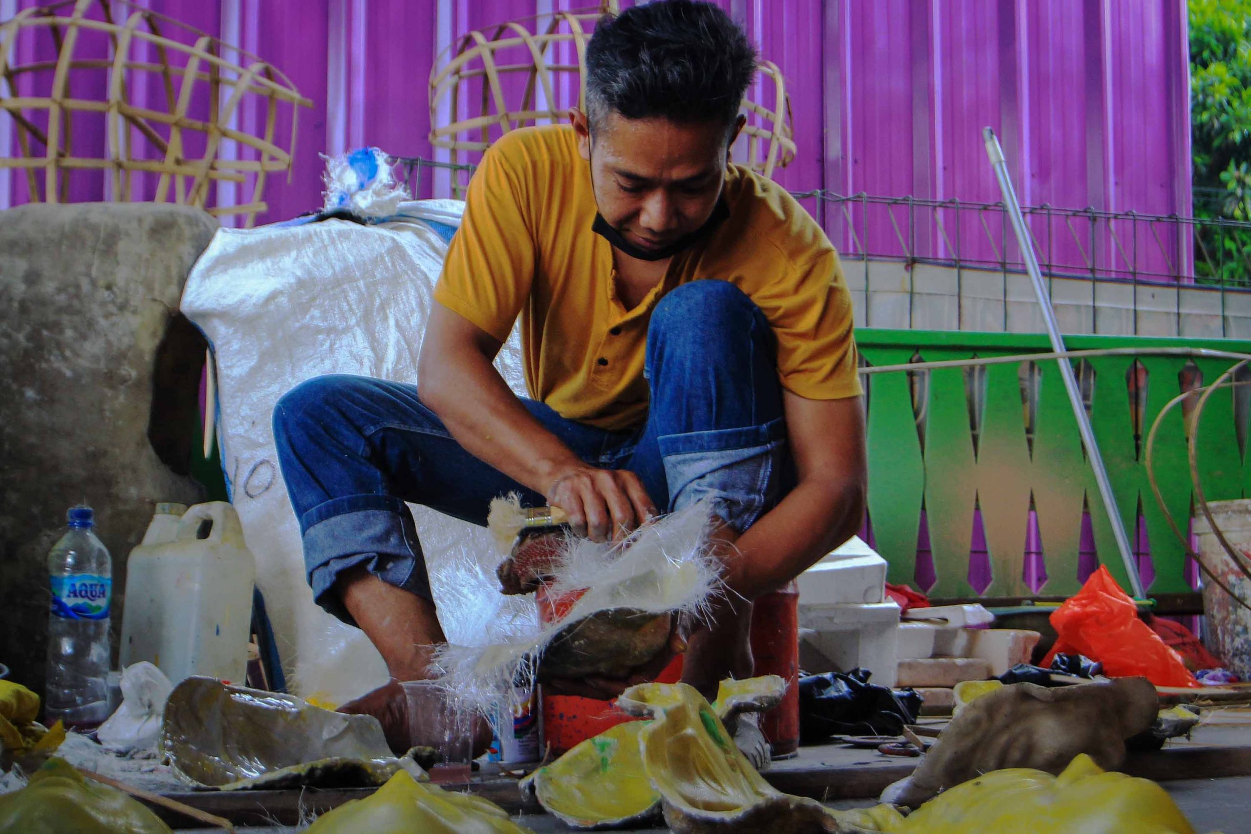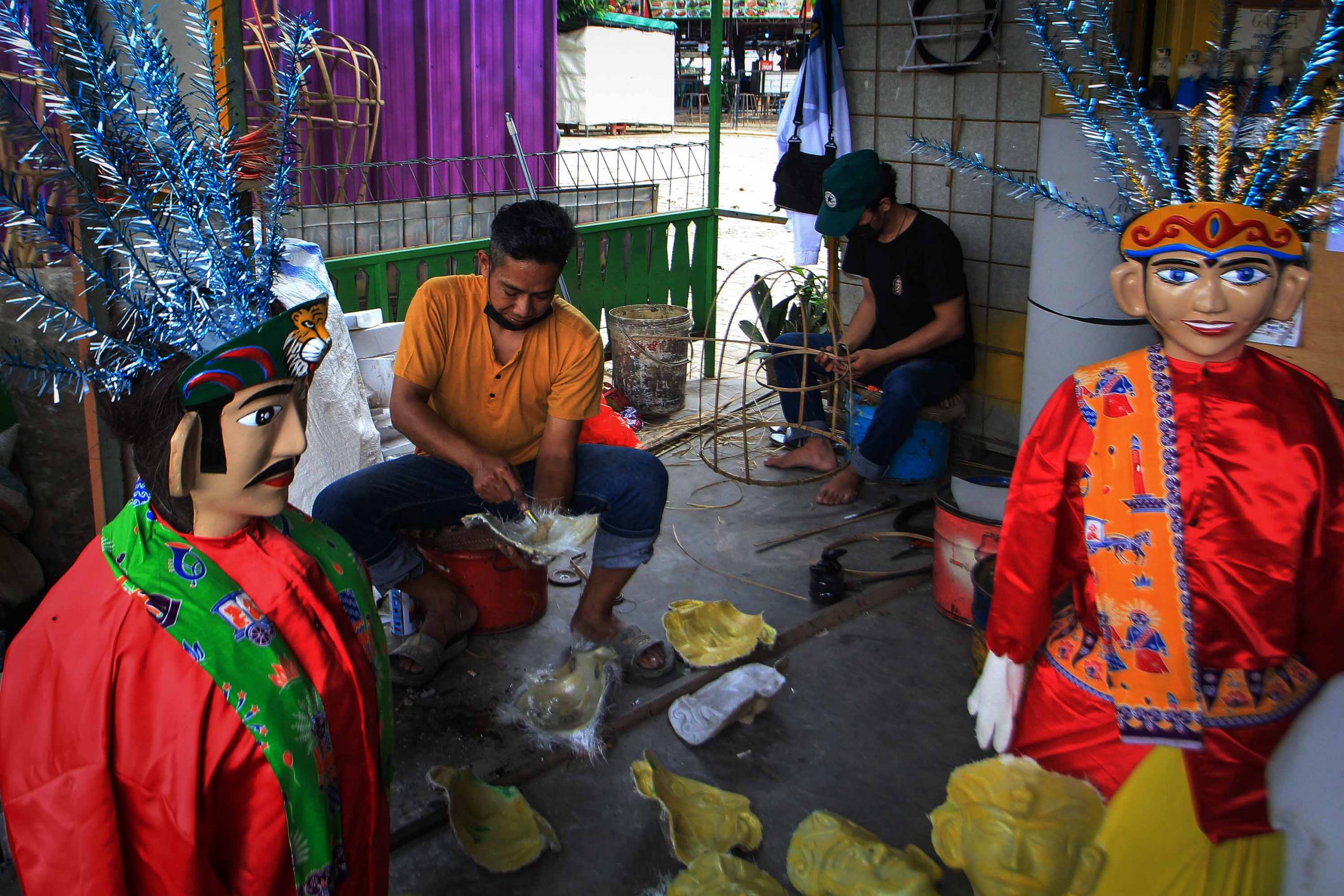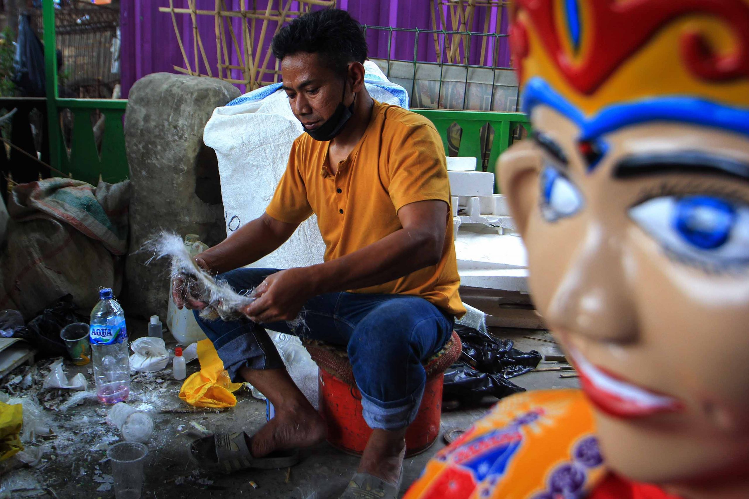 Perajin membuat topeng dan badan ondel-ondel di Sanggar Si Betok jalan KH Hasyim Ashari Cipondoh, Tangerang, Banten, Jum,at (18/2/2022). Ondel - ondel hasil buatan sanggar tersebut dijual dengan harga Rp400 ribu hingga Rp500 ribu tergantung ukuran ondel-ondel tersebut. Selain untuk mendapatkan keuntungan, perajin mengaku membuat ondel-ondel dengan tujuan melestarikan Budaya Betawi. Banten Aktual/Cecep