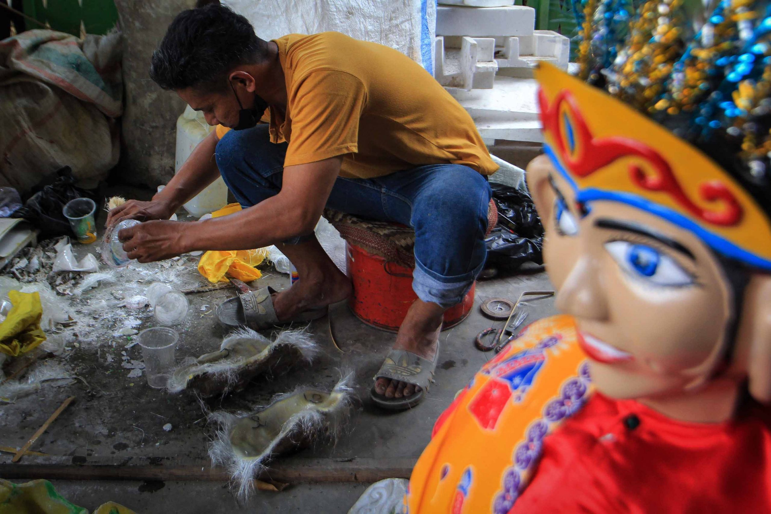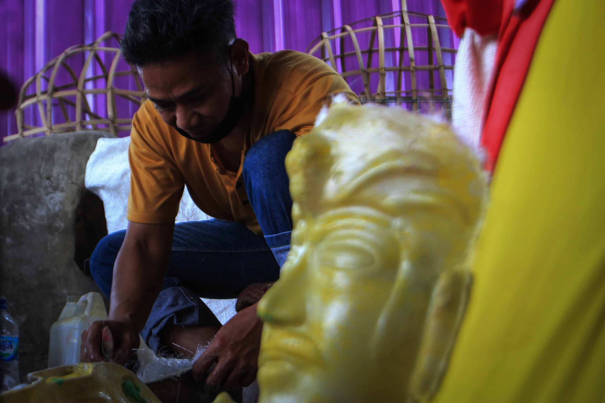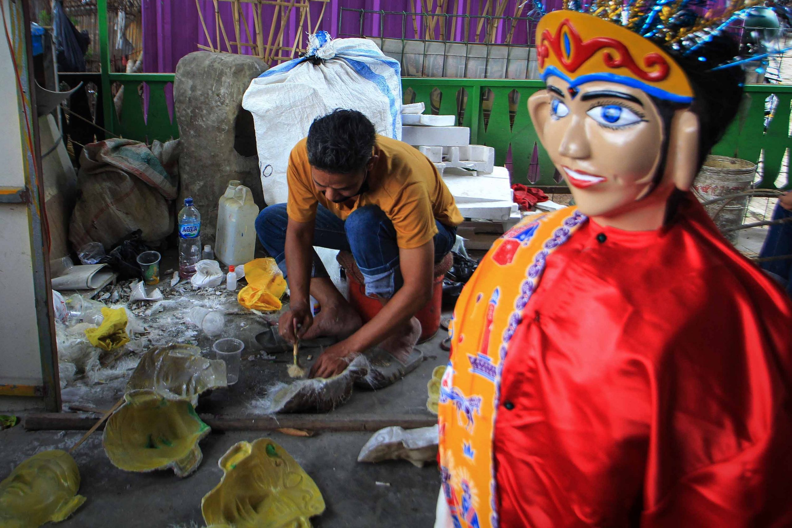 Perajin membuat topeng dan badan ondel-ondel di Sanggar Si Betok jalan KH Hasyim Ashari Cipondoh, Tangerang, Banten, Jum,at (18/2/2022). Ondel - ondel hasil buatan sanggar tersebut dijual dengan harga Rp400 ribu hingga Rp500 ribu tergantung ukuran ondel-ondel tersebut. Selain untuk mendapatkan keuntungan, perajin mengaku membuat ondel-ondel dengan tujuan melestarikan Budaya Betawi. Banten Aktual/Cecep