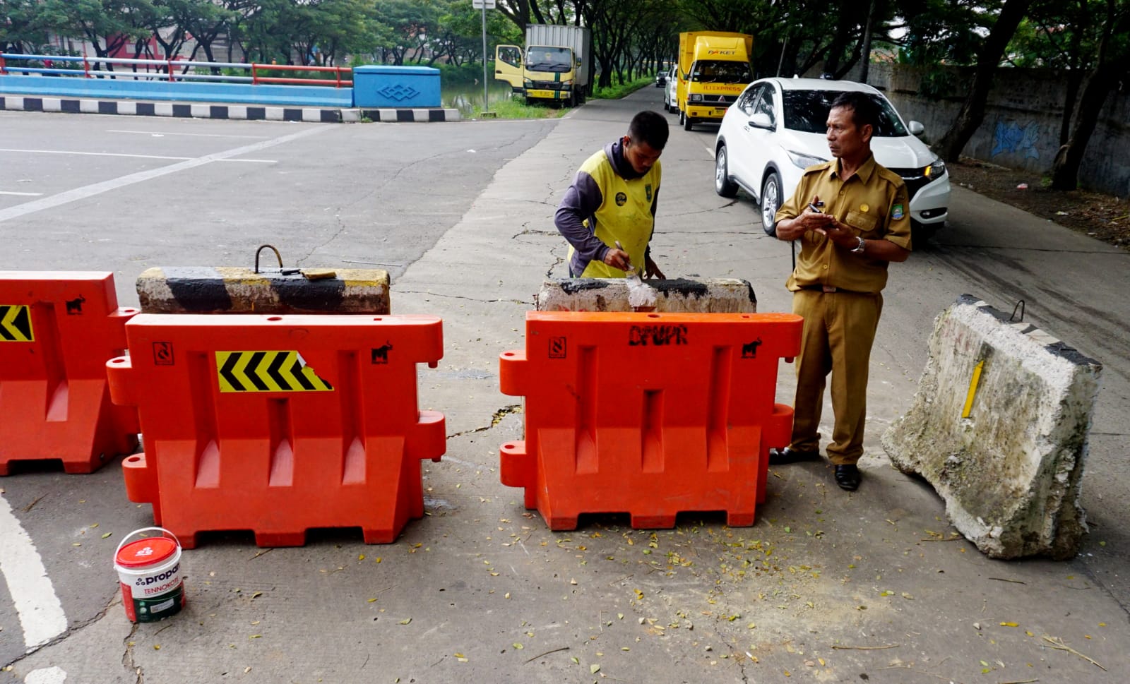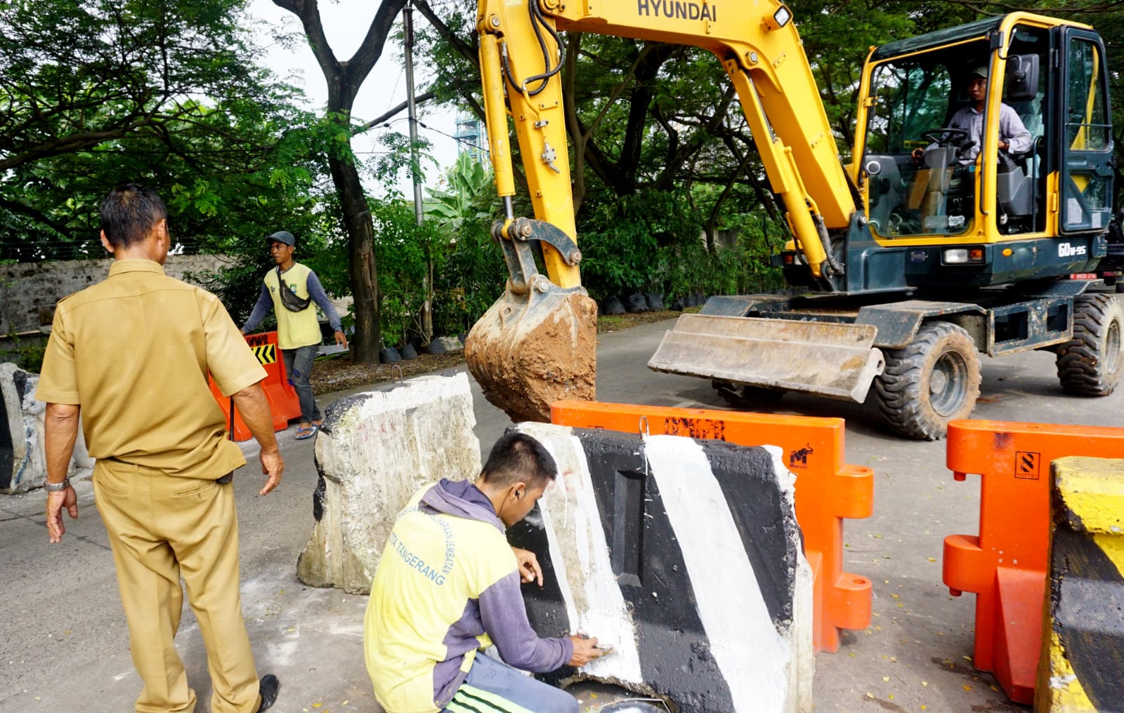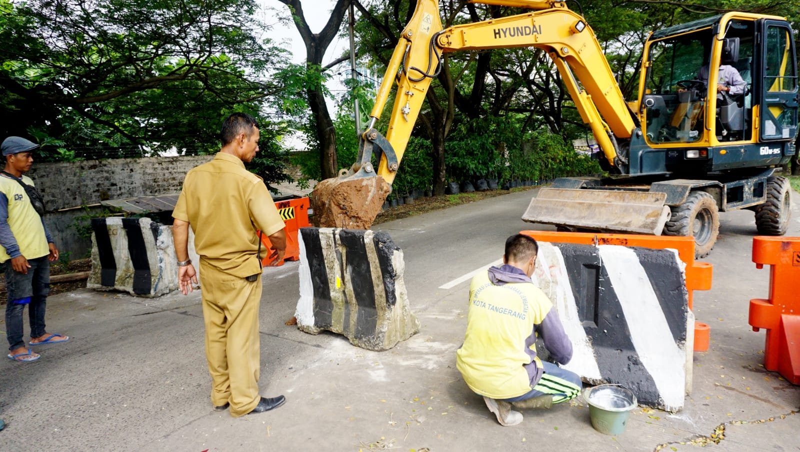 Petugas Pekerjaan Umum dan Penataan Ruang (PUPR) Kota Tangerang sedang memasang Barier Beton guna mengalihkan kendaraan berkapasitas besar (truk) di Jalan Sangego Raya Kelurahan Koang Kecamatan Karawaci Kota Tangerang, penutupan jalan sementara tersebut di karenakan adanya perbaikan jalan yang rusak dikarenakan longsor akibat banyaknya kendaraan berkapasitas besar yang melalui jalan tersebut. Senin (30/5/22). Banten Aktual/Dennys