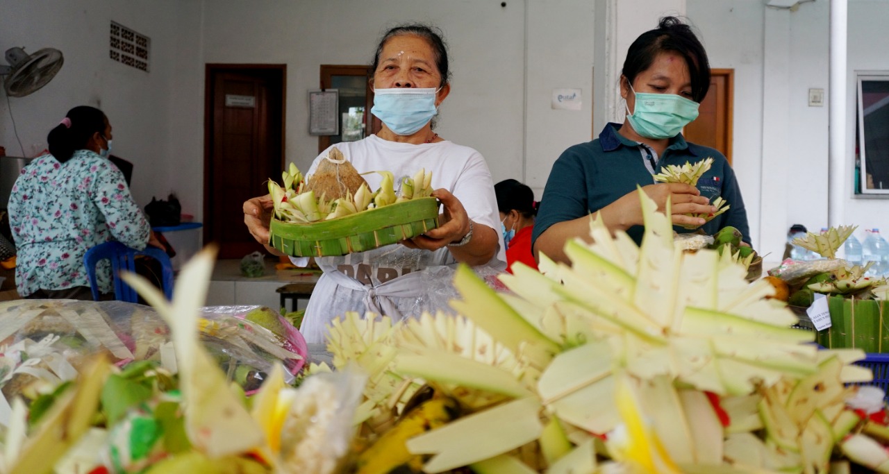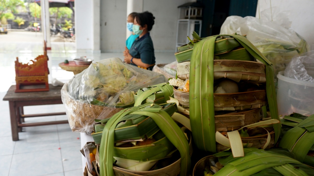 Sejumlah pengurus wanita Pura Kerta Jaya yang berada di Jalan KS Tubun Pasar Baru Kota Tangerang mempersiapkan sesaji untuk persembahyangan jelang Hari Raya Nyepi yang akan di adakan pada Sabtu (13/3/21). Dimasa pandemi saat ini Pure Kerta Jaya tidak mengadakan acara pawai Ogoh-ogoh mengikuti peraturan Pemerintah demi menekan penularan Covid-19. Jumat (12/3/21). Banten Aktual/Dennys