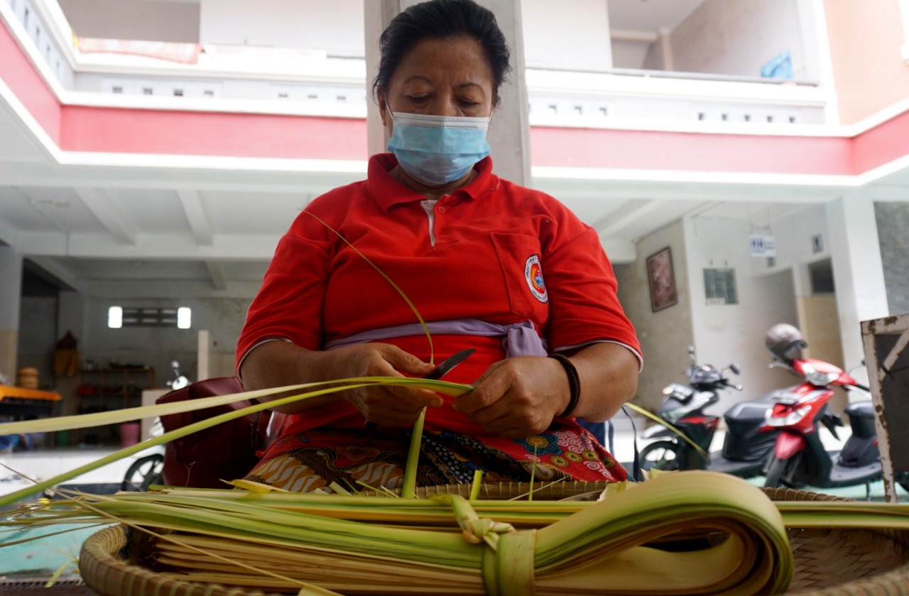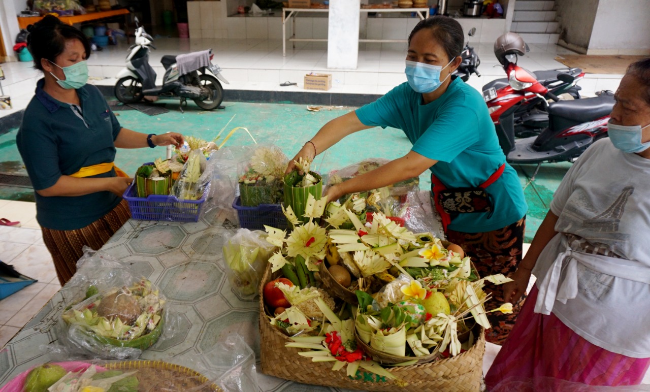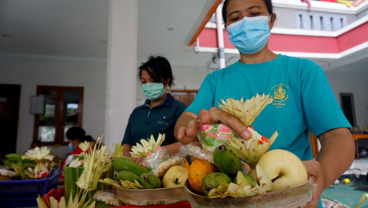 Sejumlah pengurus wanita Pura Kerta Jaya yang berada di Jalan KS Tubun Pasar Baru Kota Tangerang mempersiapkan sesaji untuk persembahyangan jelang Hari Raya Nyepi yang akan di adakan pada Sabtu (13/3/21). Dimasa pandemi saat ini Pure Kerta Jaya tidak mengadakan acara pawai Ogoh-ogoh mengikuti peraturan Pemerintah demi menekan penularan Covid-19. Jumat (12/3/21). Banten Aktual/Dennys