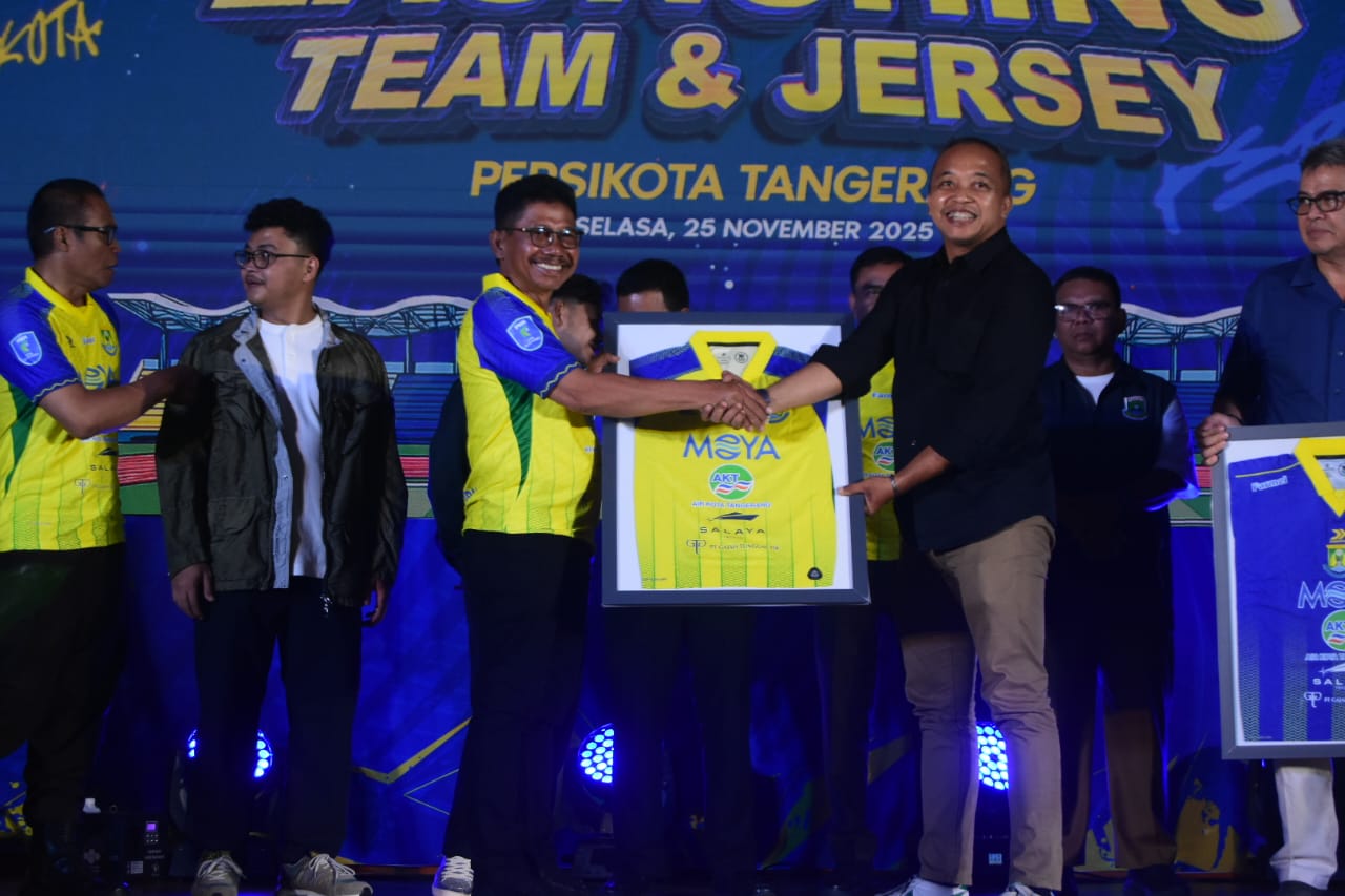 Persikota Tangerang resmi melaunching tim dan jersey terbaru di Gedung Al Amani, Puspem Kota Tangerang, pada Selasa, 25 November 2025. Acara berlangsung meriah dengan kehadiran suporter dan jajaran manajemen klub. Pemkot Tangerang memastikan dukungan penuh bagi tim Bayi Ajaib. Sachrudin menyerahkan penuh urusan teknis kepada manajemen dan pelatih. Ia menilai kondisi fisik pemain telah siap bertanding. Dirinya berharap target juara bisa dicapai musim ini. Selasa (25/11/25). Banten Aktual/Dennys