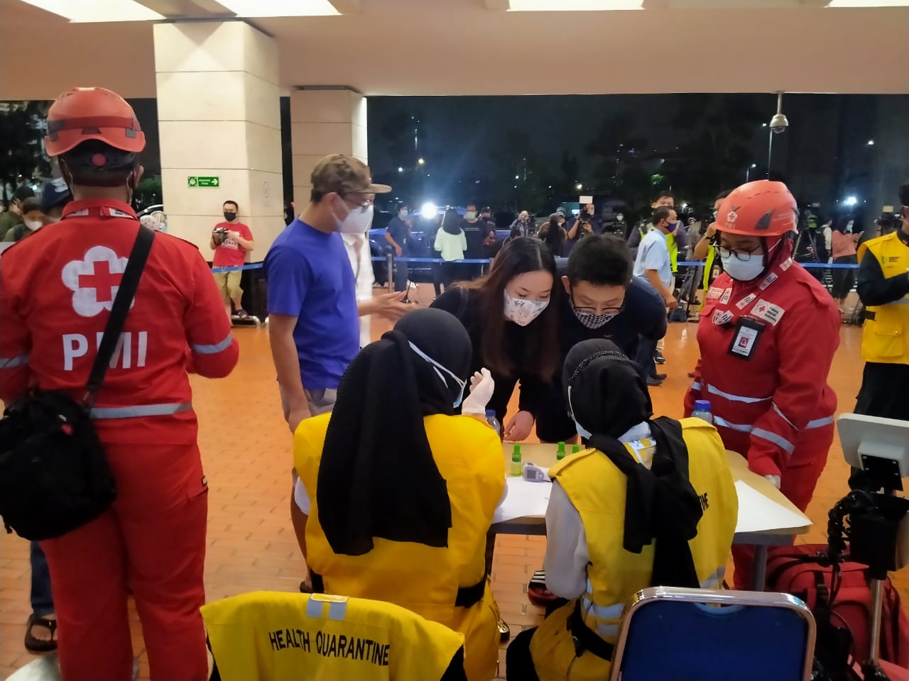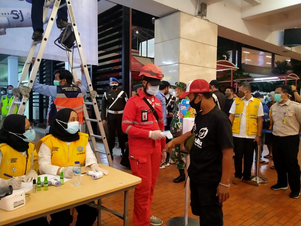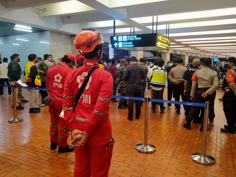 Demi menjaga protokol kesehatan, tim PMI KOTA TANGERANG membantu petugas bandara untuk pengecekan suhu kepada keluarga korban kecelakaan jatuhnya pesawat Sriwijaya Air SJ 182. (9/1/2021). Banten Aktual/PMI Kota Tangerang/Cecep