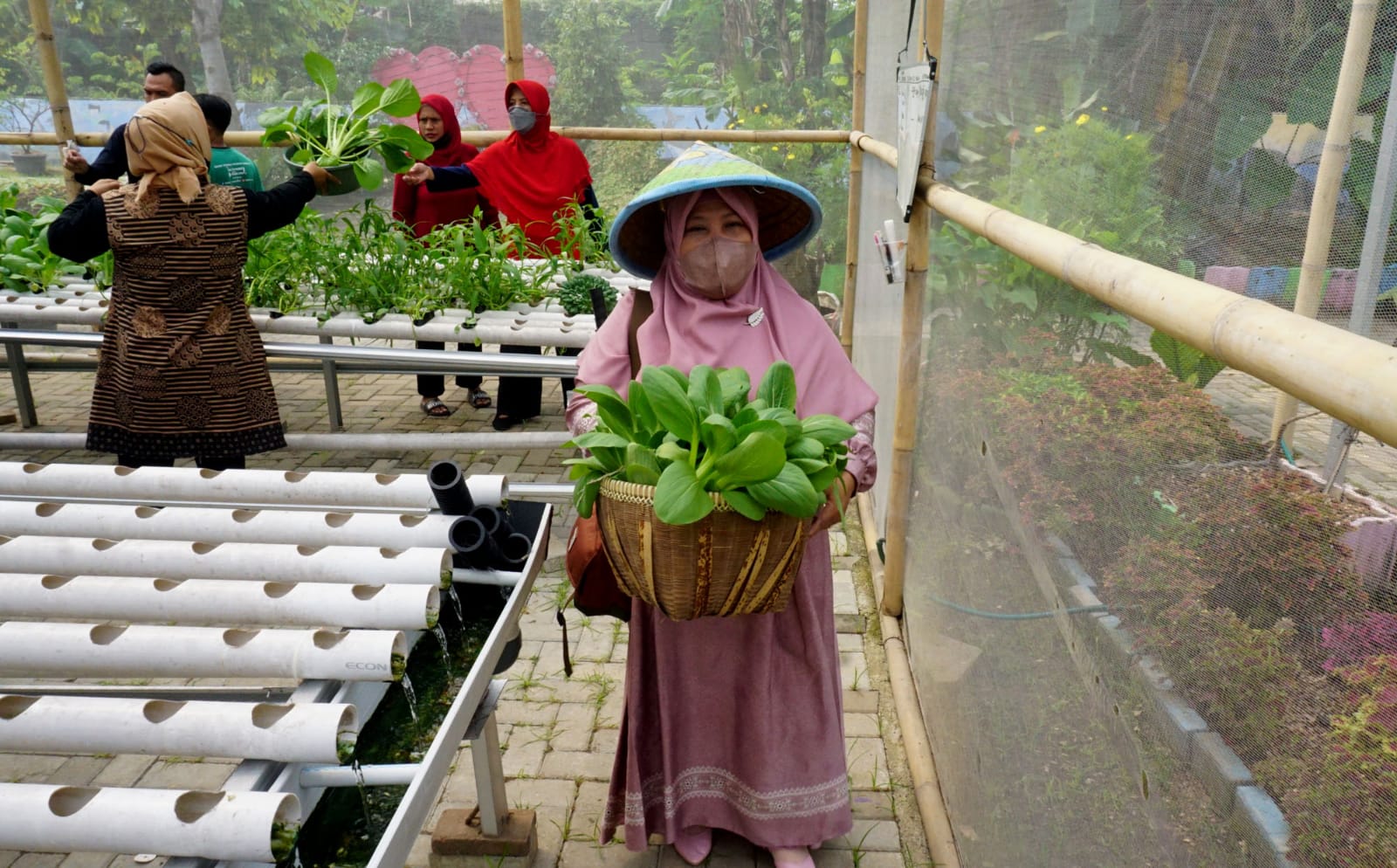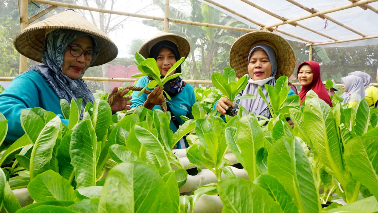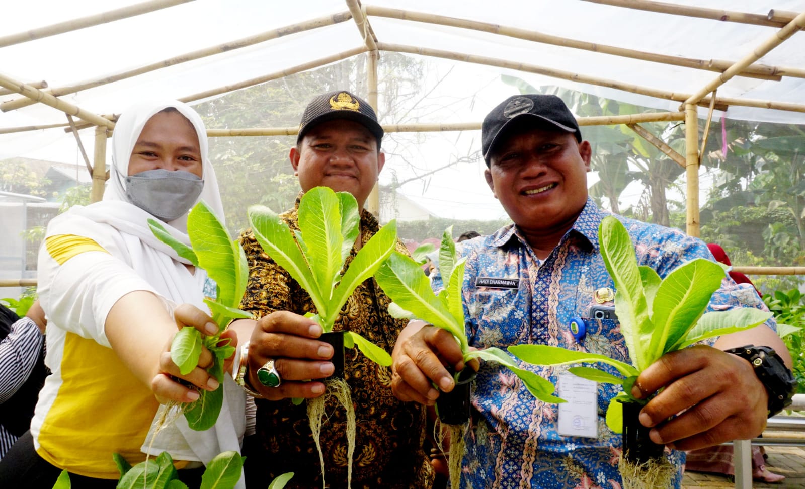 Puluhan Ibu-ibu dari berbagai wilayah mendatangi perkebunan sayur untuk dapat membeli sayur segar hidroponik yang langsung dapat memetik sendiri dari ladangnya. Panen Raya Kelompok Wanita Tani Anturium yang ada di Perumahan Pondok Arum RW.03 Kelurahan Nambo Jaya Kecamatan Karawaci Kota Tangerang ini menjadi satu KWT percontohan bagi KWT yang ada di Kota Tangerang. Tampak terlihat Lurah Nambo Jaya bersama staffnya turut menghadiri acara panen raya tersebut. Kamis (30/6/22). Banten Aktual/Dennys