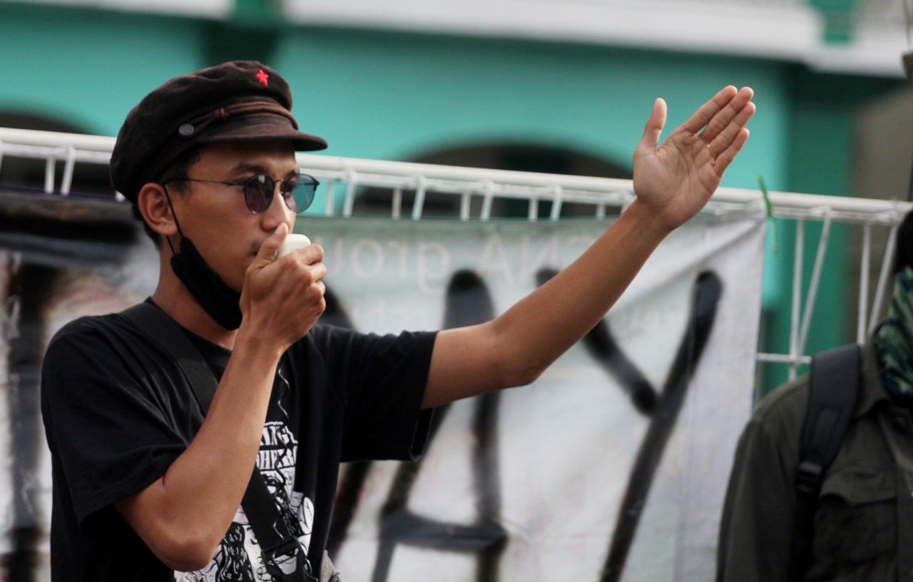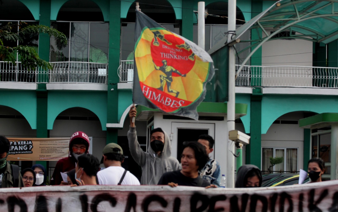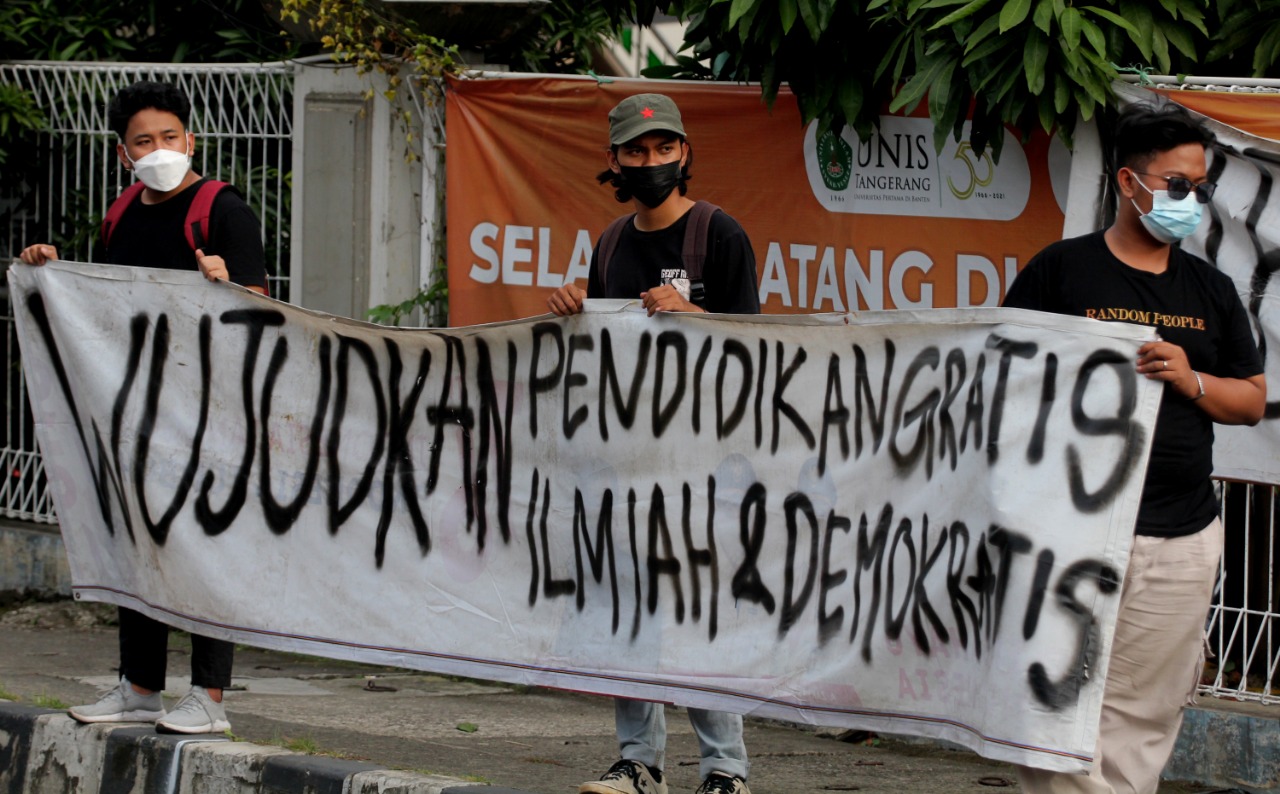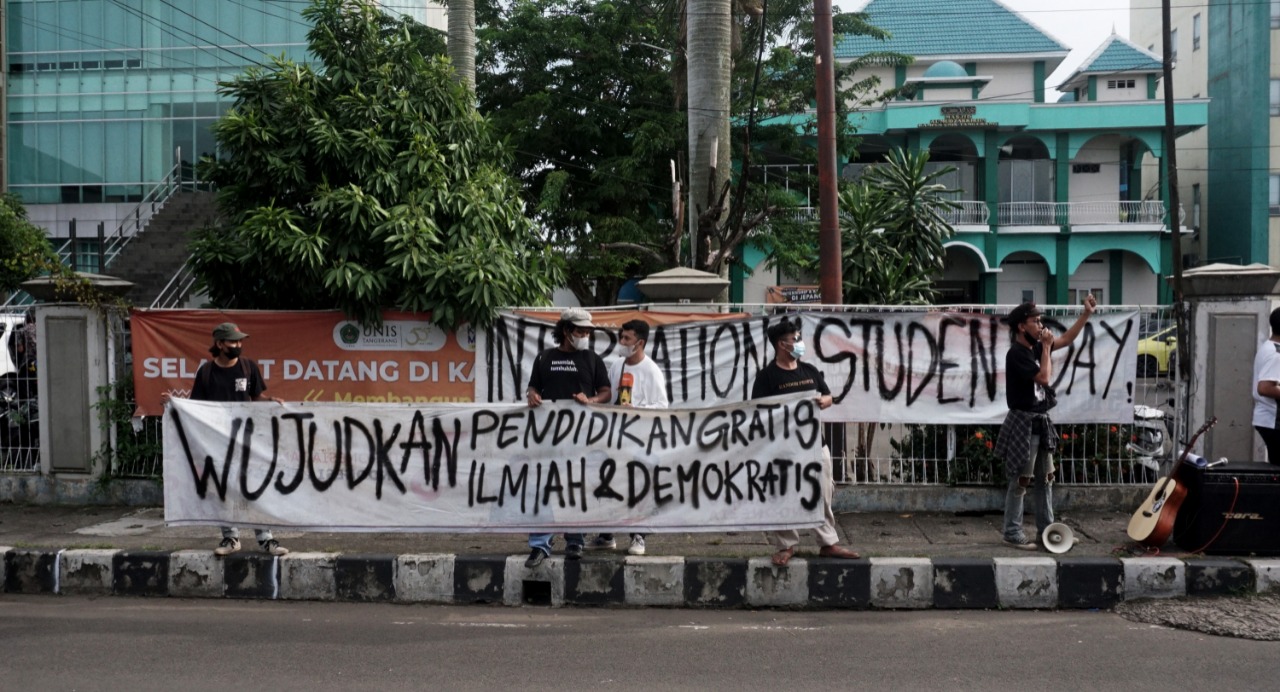 Internasional Student Day 2021 di warnai unjuk rasa mahasiswa Universitas Islam Syekh Yusuf (UNIS) Tangerang di Jalan Maulana Yusuf No.10 Kota Tangerang, sebanyak puluhan mahasiswa menuntut kepada pemerintah daerah maupun pusat untuk mewujudkan Pendidikan Gratis, Ilmiah dan Demokratis. Dalam aksi tersebut terlihat beberapa aparat keamanan baik dari kampus maupun Polisi melakukan penjagaan dan mengatur lalulintas agar tidak mengundang kemacetan. Rabu (17/11/21). Banten Aktual/Dennys