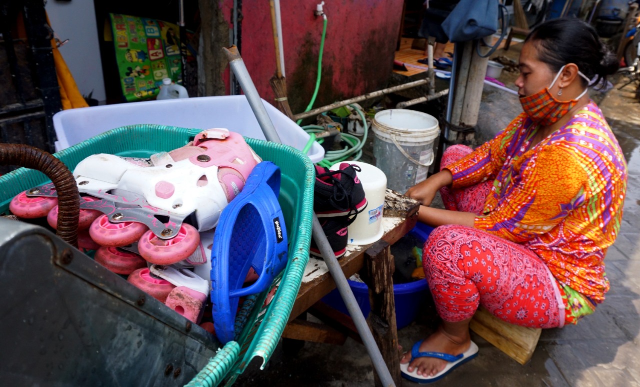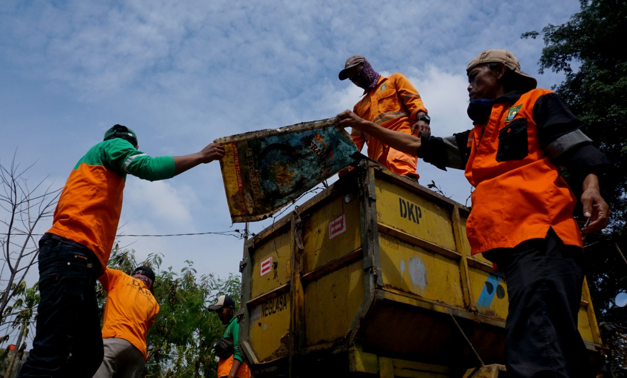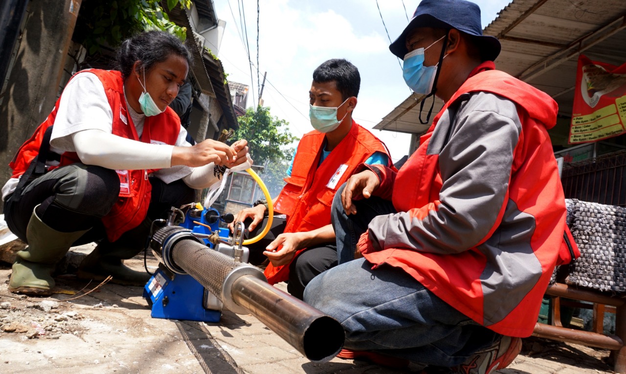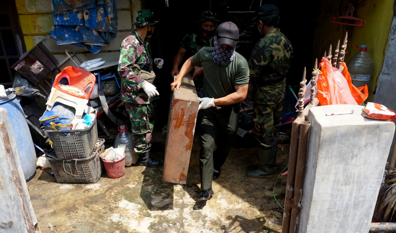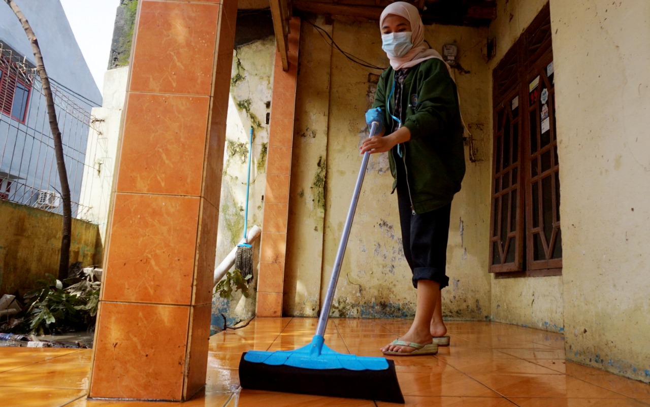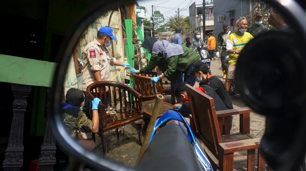 Para relawan tengah membersihkan fasilitas umum dan tempat tinggal warga di Perumahan Periuk Damai Kelurahan Periuk Kecamatan Periuk Kota Tangerang. Paskha Banjir selama 5 hari yang lalu menyisakan sampah dan dapat menjadi penyebab penyakit bagi warga. Sabtu (27/2/21). Banten Aktual/Dennys
