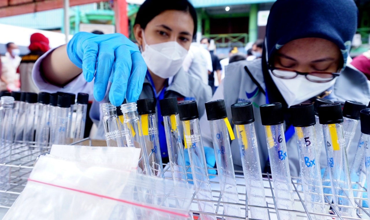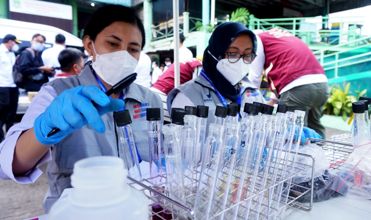 Jelang Ramadhan Dinas Ketahanan Pangan (KETAPANG) Kota Tangerang bersama Badan Pengawasan Obat dan Makanan (BPOM) Provinsi Banten mengadakan sidak di Pasar Anyar Kota Tangerang, dari hasil sidak dan uji laboratorium di lokasi, para petugas mendapati 10 Sample makanan yang positif mengandung Formalin dari 230 sempel makanan, dalam kegiatannya petugas akan menindak tegas bagi para pedagang yang kedapatan barang dagangannya menggunakan bahan berbahaya (Formalin) akan langsung di tindak oleh pihak Kepolisian terutama pihak pemasoknya. Rabu (30/3/22). Banten Aktual/Dennys