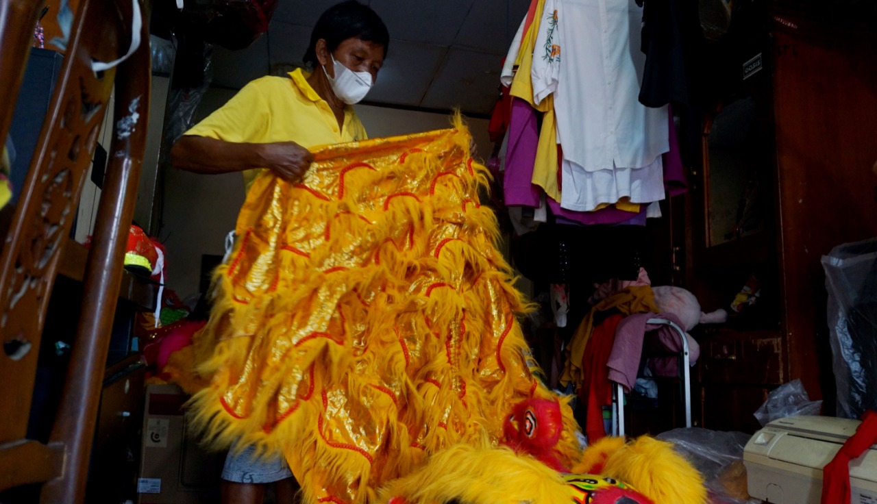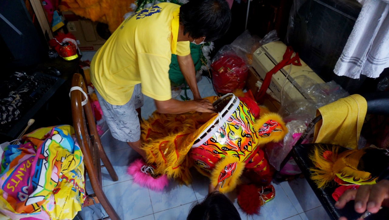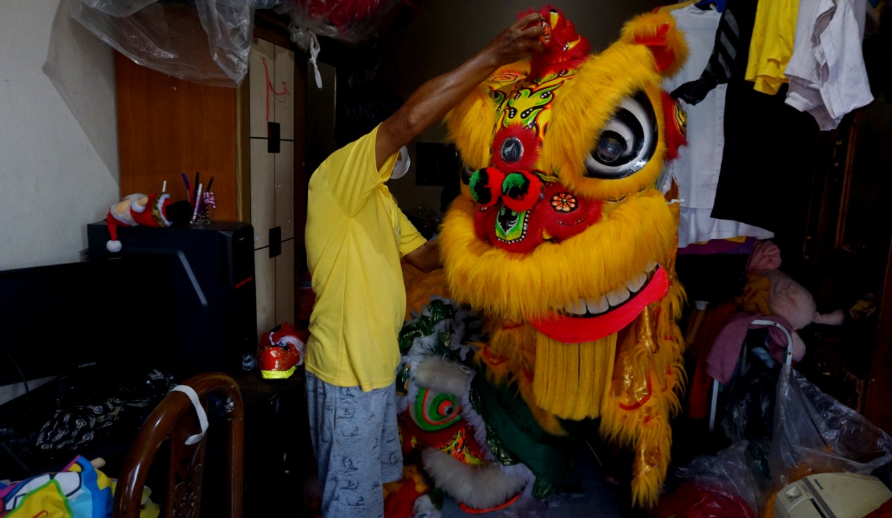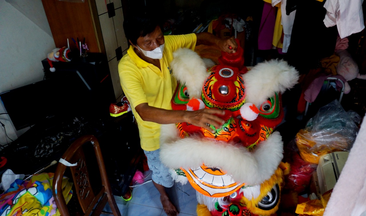 Pengrajin Barongsai sepi pesanan seperti Kim Coan (69) pengrajin barongsai yang masih aktif mengerjakan pesanan konsumenya, dimasa pandemi seperti saat ini ia merasa kesulitan dalam pesanan, dengan pemerintah mengeluarkan aturan untuk tidak adanya perayaan besar ini menjadi satu faktor dari sepinya pemesanan barongsai, terlihat kim coan sedang membersihkan barongsai di rumahnya Kampung Eretan Kecamatan Karawaci Kota Tangerang. Selasa (18/1/22). Banten Aktual/Dennys