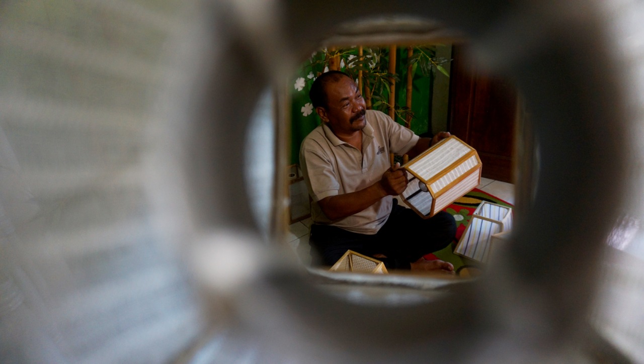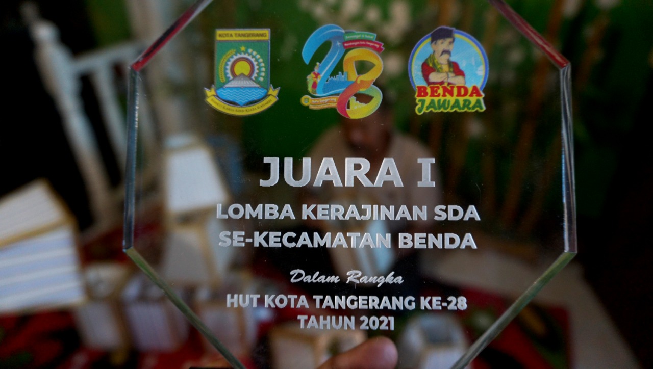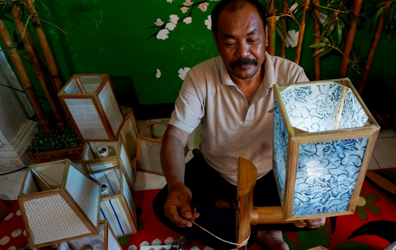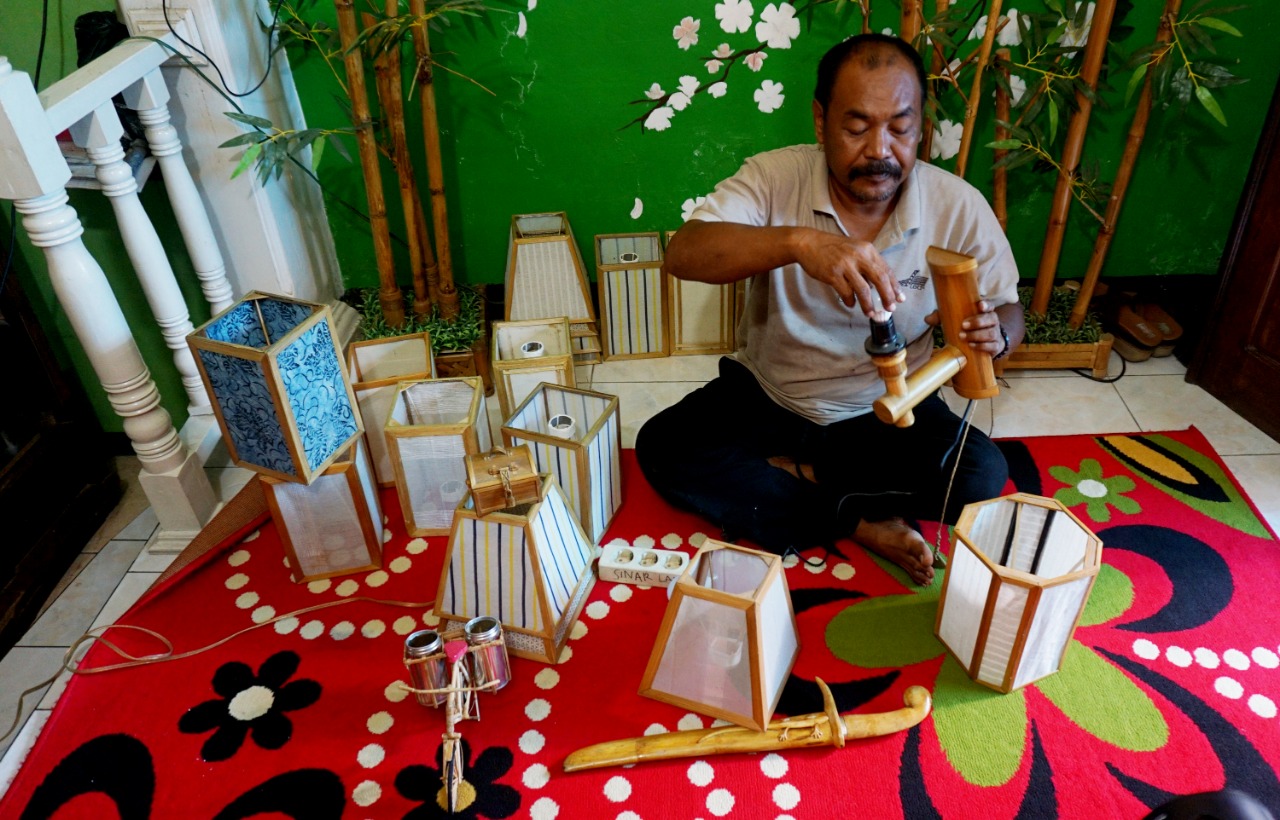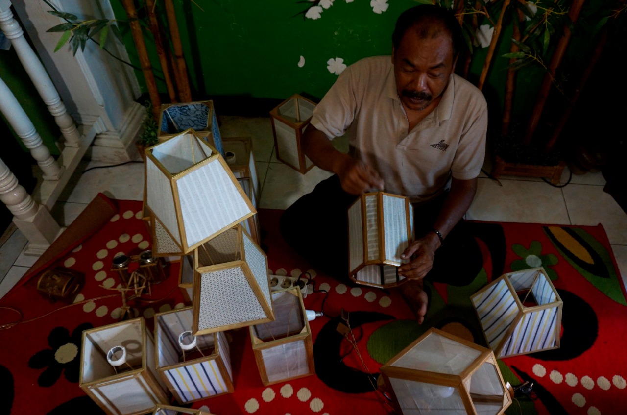 Nana Suryana (52) pengrajin Lampion sedang mengerjakan Lampion pesanan Konsumen di Rumahnya. Kelurahan Pajang, Kecamatan Benda, Kota Tangerang. Lampion hasil karyanya di bandrol dengan harga bervariasi mulai dari Rp. 50.000-1000.000,-. Hasil karya yang di ciptakan semuanya menggunakan limbah yang didapat dari daerah sekitar lingkungan kampungnya. Senin (8/3/21). Banten Aktual/Dennys