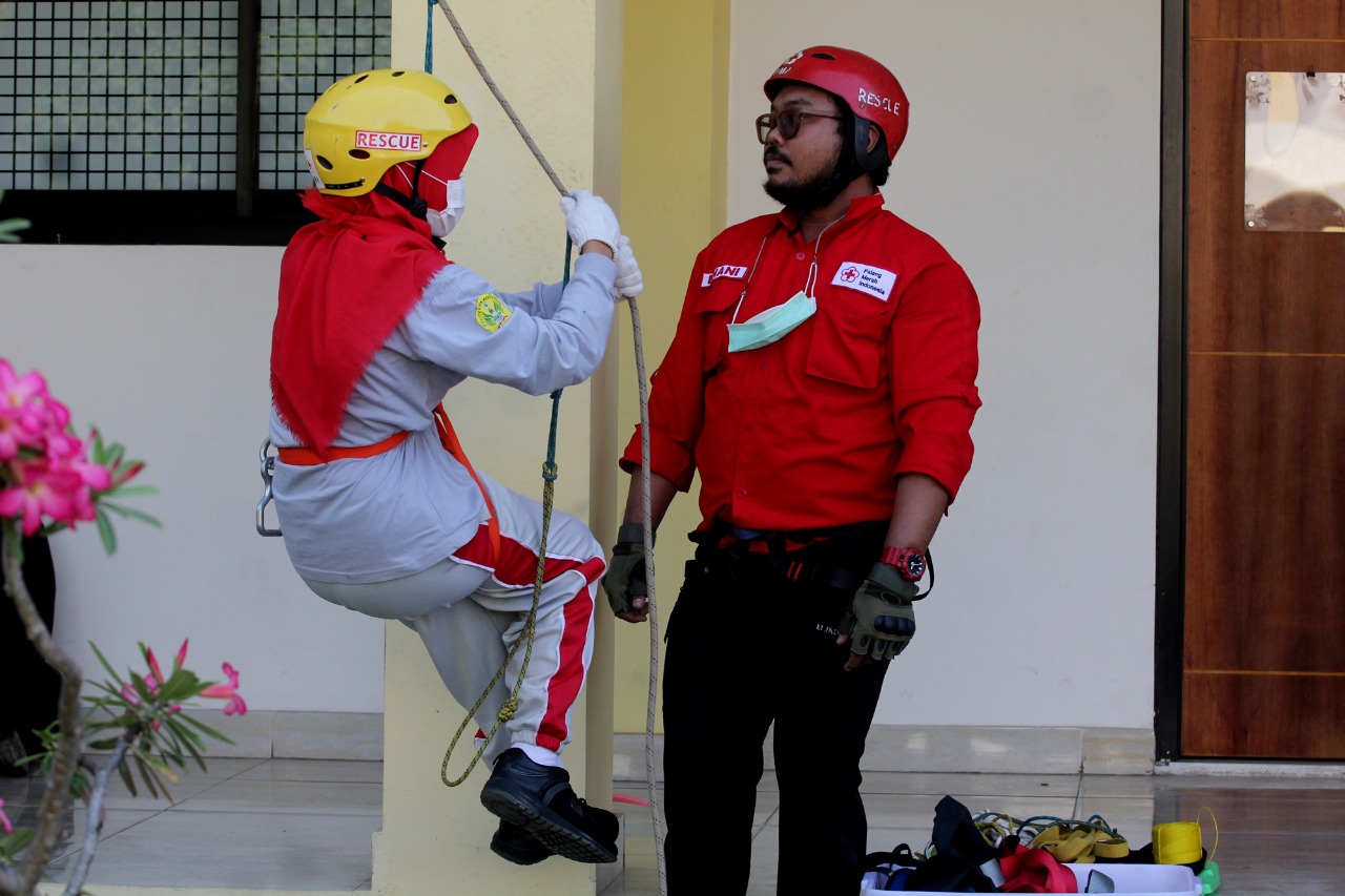 Politeknik Kesehatan (POLTEKES) Banten jalani pelatihan kebencanaan, pelatihan yang diadakan di kampusnya ini menjadi satu kewajiban bagi siswanya yang sudah tingkat 3 (tiga) semester 6 (enam). Pelatihan tersebut menjadi satu matakuliah tentang kebencanaan, guna mempersiapkan para siswanya ketika terjadi bencana dan selalu siap jika diterjunkan kewilayah rawan bencana, para pelatih dari Palang Merah Indonesia (PMI) Kota Tangerang sedang memberi materi tali-temali kepada para mahasiswa di Kampus Poltekes Banten Jalan Dr. Sintanala Tangerang. Rabu (6/4/22). Banten Aktual/Dennys