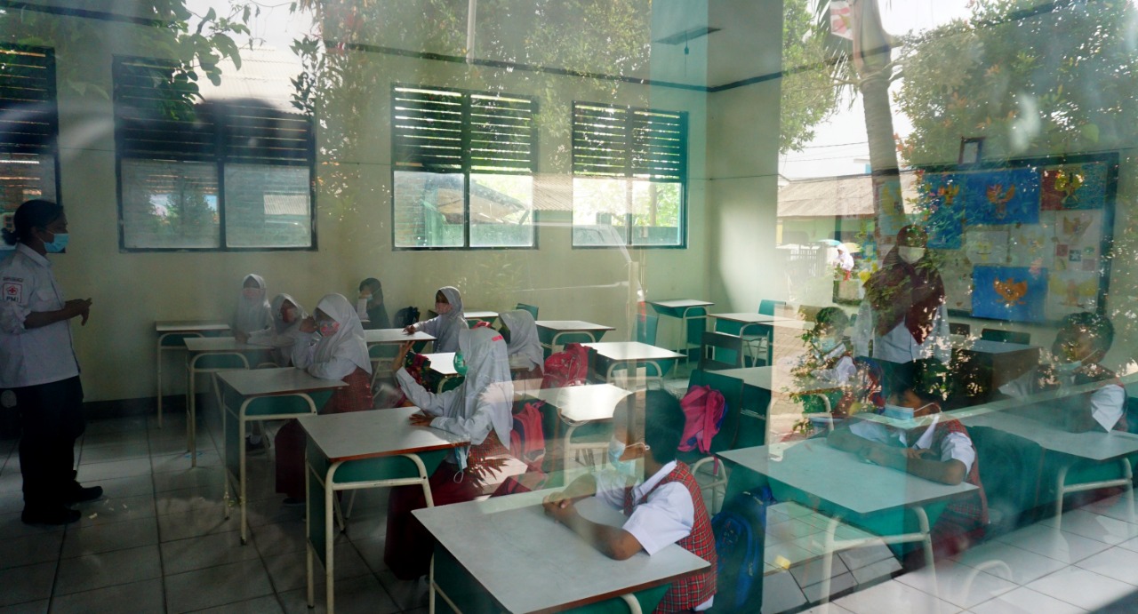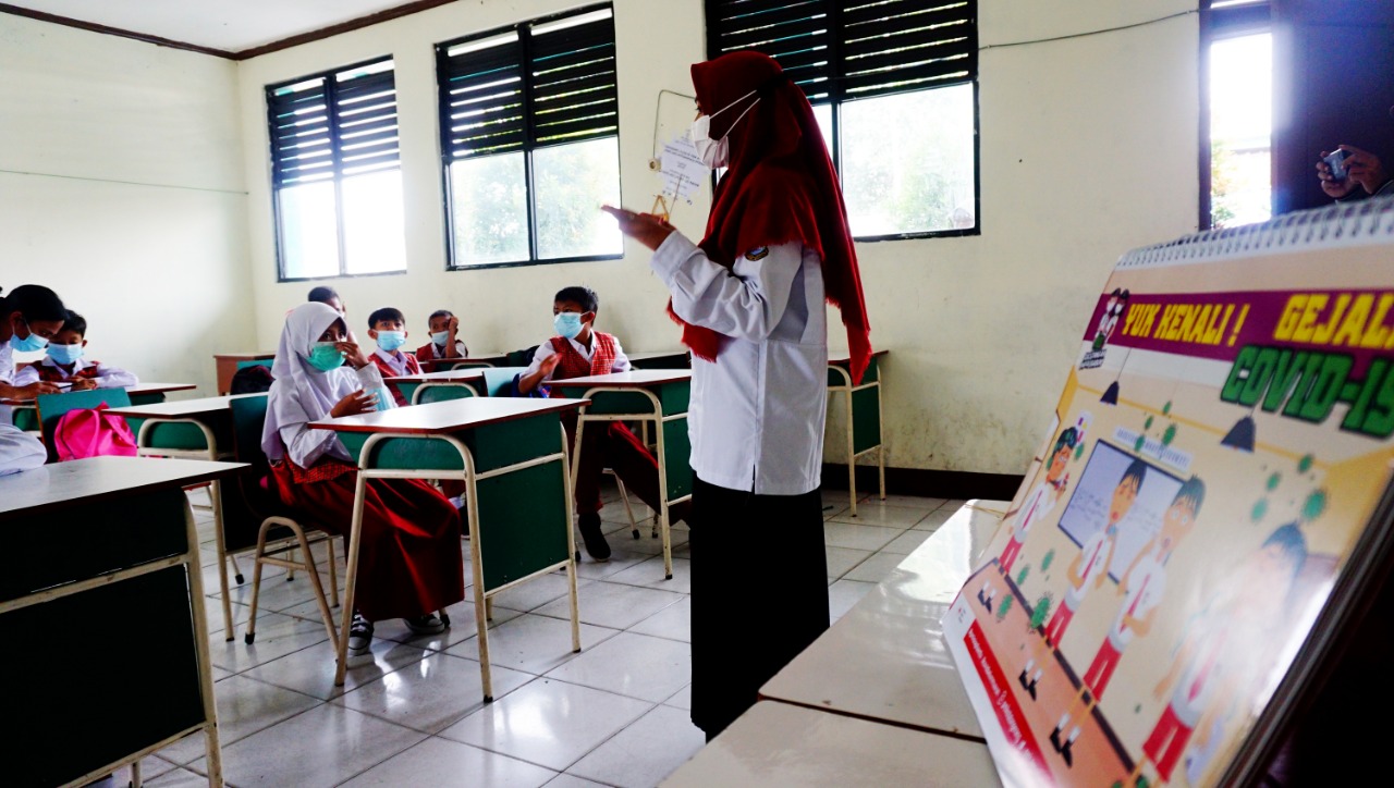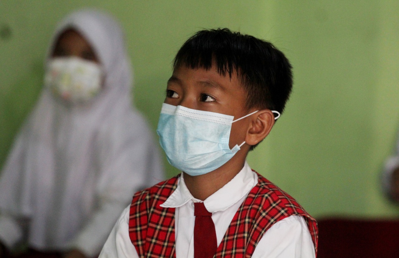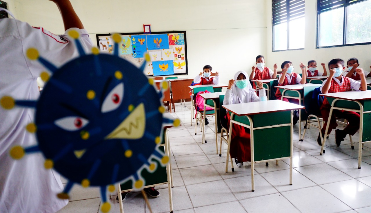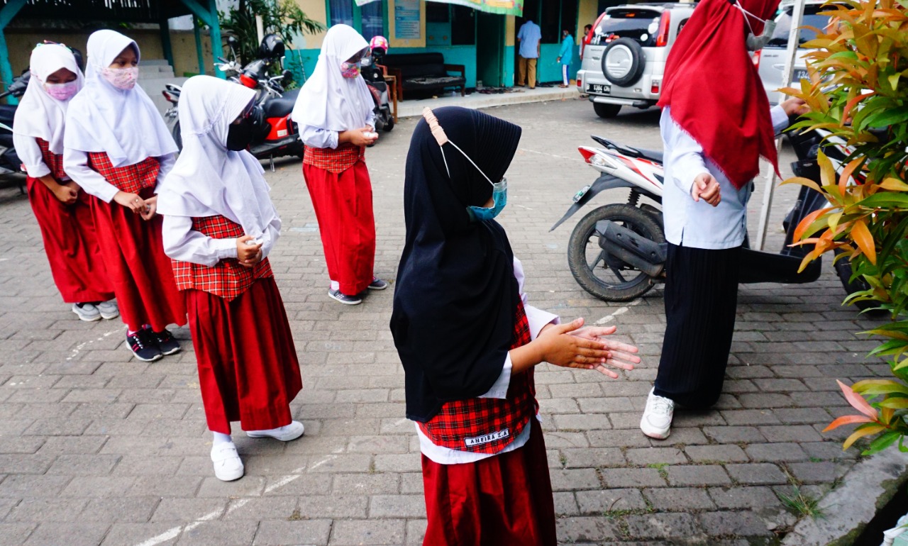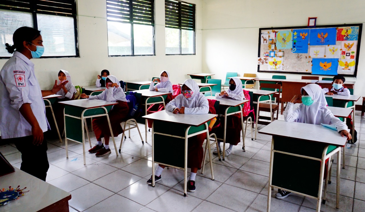 Palang Merah Indonesia (PMI) Kota Tangerang mengajak anak-anak untuk lakukan hidup bersih dimasa pandemi, dalam sosialisasinya di Madrasah Ibtidaiyah (MI) Darul Hikmah Cimone Kecamatan Karawaci, Kota Tangerang, para instruktur selain mengajarkan cara mencuci tangan dengan benar mereka juga memberi pengetahuan tentang bahaya dan ciri orang yang terkena virus Corona-19. Senin (6/9/21). Banten Aktual/Dennys