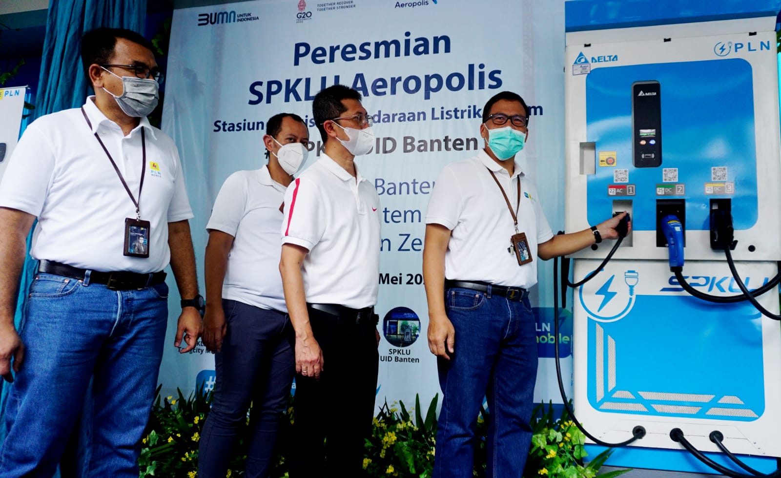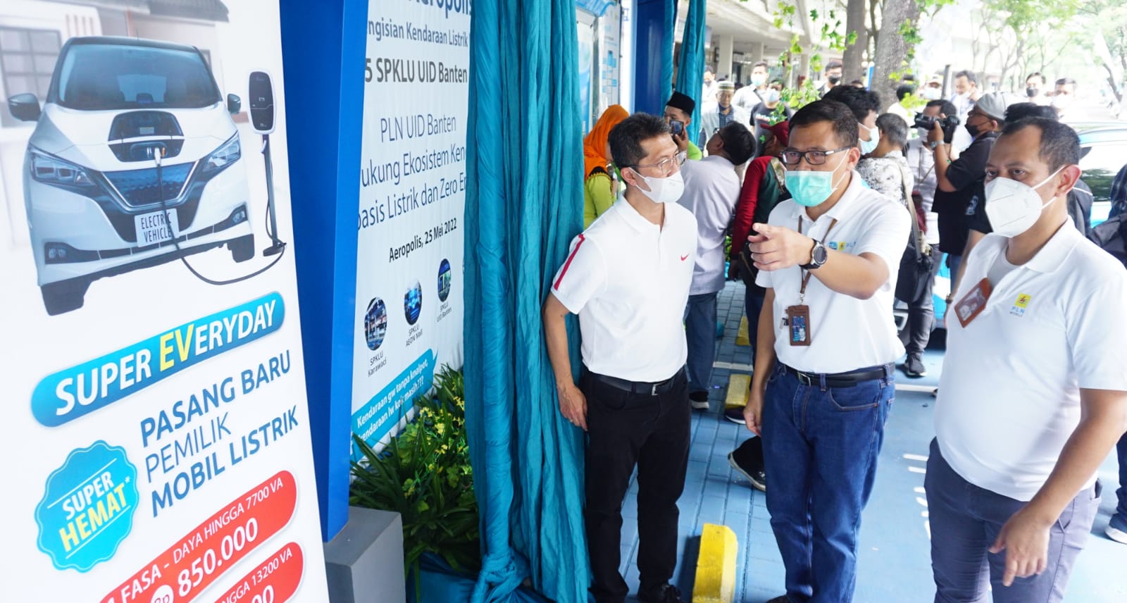 Kawasan Aeropolis Kecamatan Neglasari Kota Tangerang kini miliki Stasiun Pengisian Kendaraan Listrik Umum (SPKLU). Demi memenuhi kebutuhan masyarakat yang menggunakan kendaraan listrik, dalam kesempatan tersebut terlihat (kiri/kanan). Direktur Inti Land Permadi, Sandika GM PLN Wilayah Banten dan Manager PLN UP 3 Teluk Naga Roksi Swagerino yang sekaligus meresmikan SPKLU. Rabu (25/5/22). Banten Aktual/Dennys