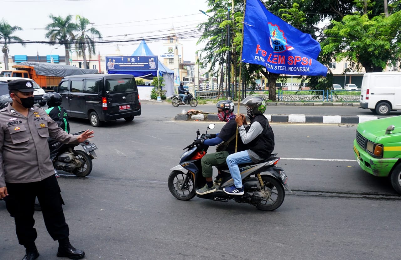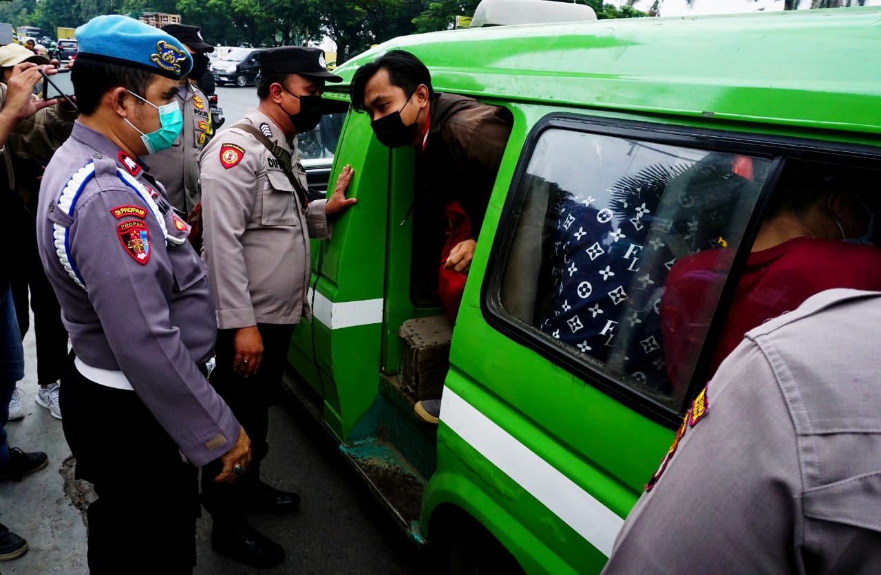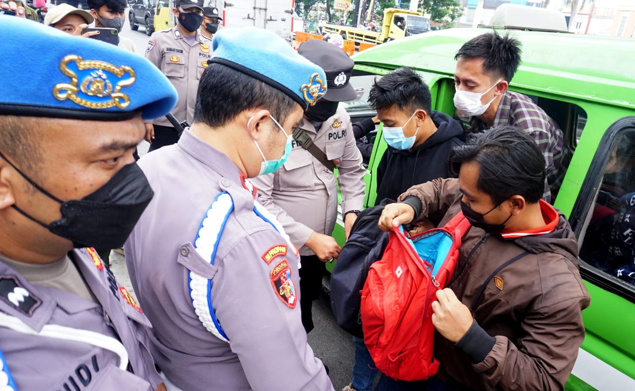 Sejumlah Mobil yang menuju Jakarta di periksa oleh polisi guna memastikan adanya pelajar dan kelompok anarko ikut demo, terlihat para petugas gabungan TNI dan Polisi yang berjaga di Jalan. Daan Mogot Kota Tangerang sedang memeriksa Angkot dan pengguna motor. Senin (11/4/22). Banten Aktual/Dennys