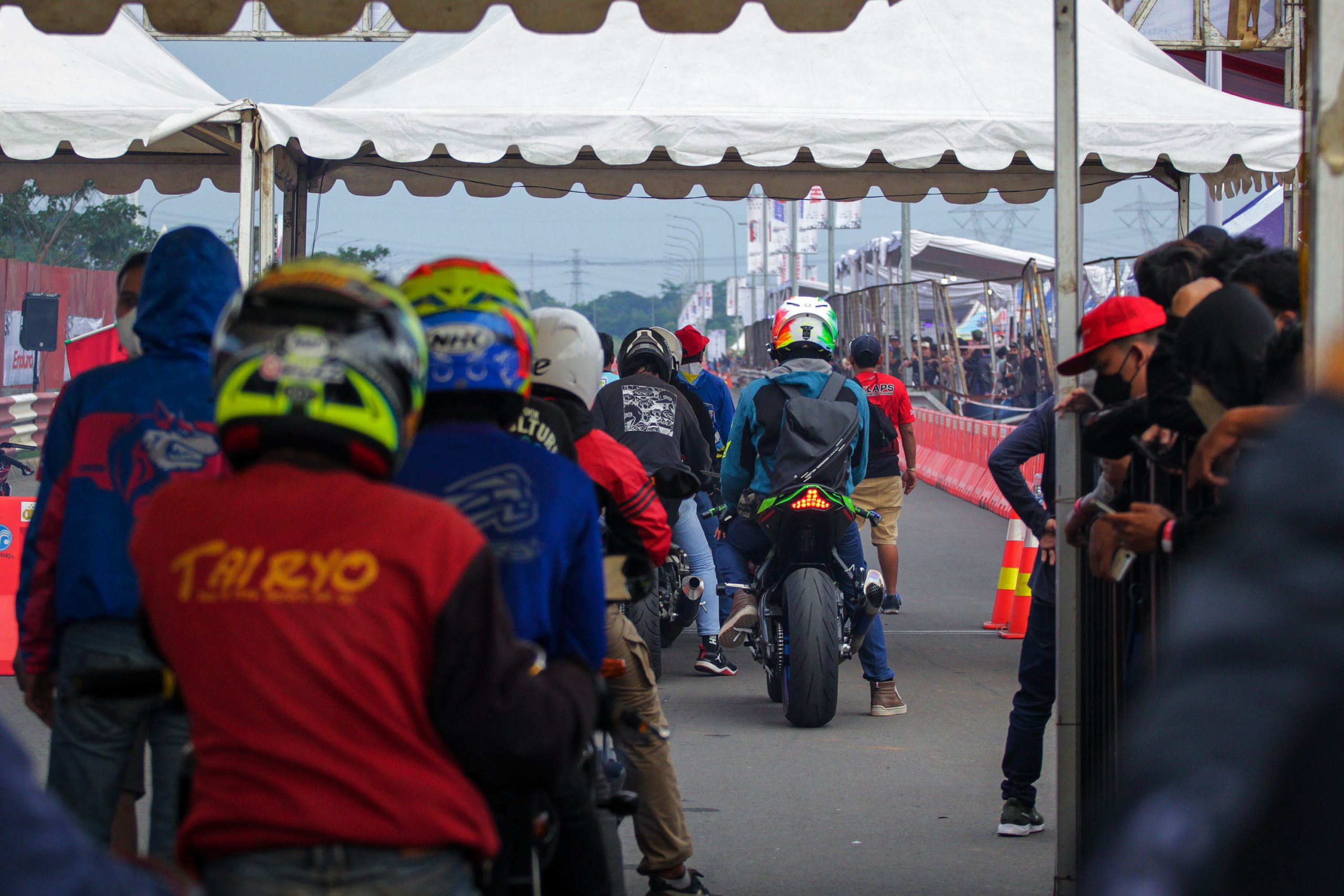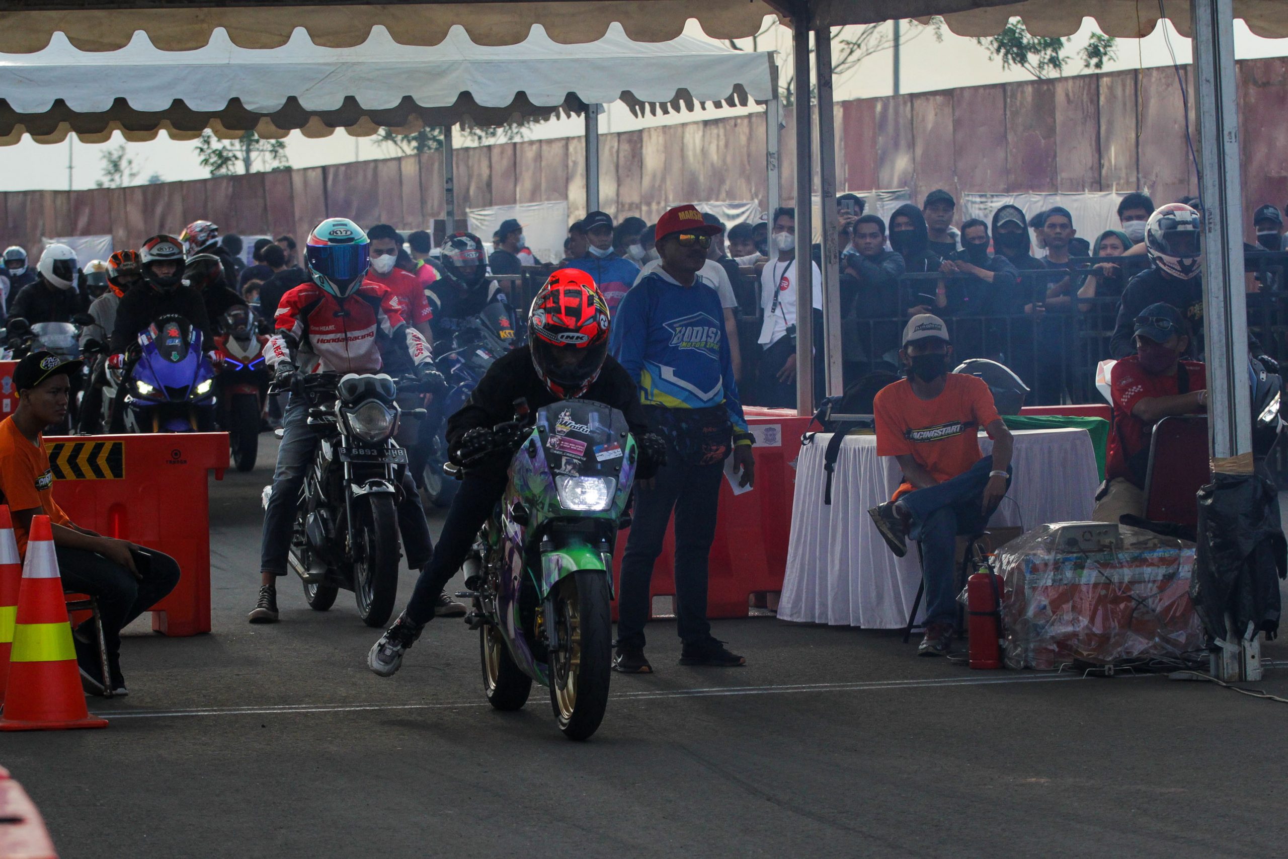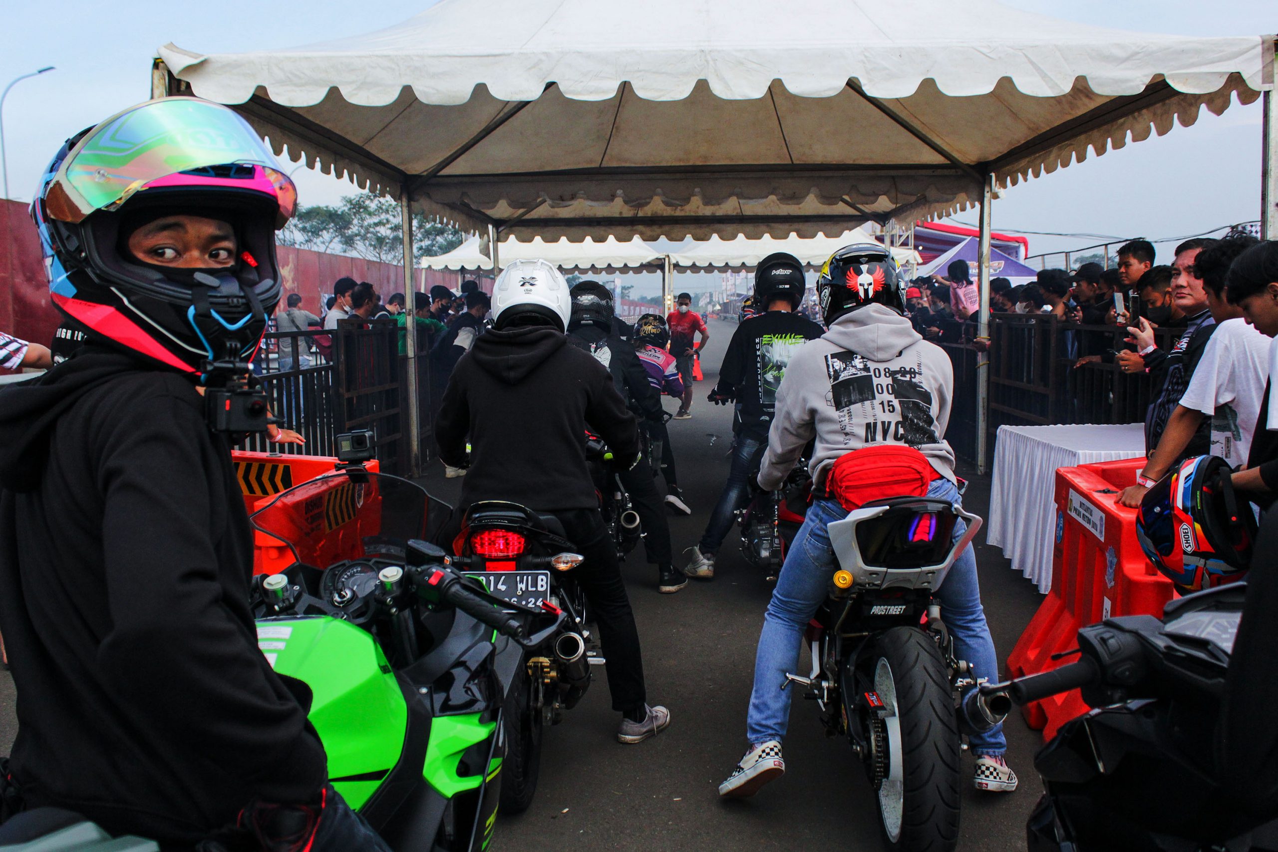 Peserta memadati antrian untuk mulai di Start memacu sepeda motornya dalam ajang Street Race Polda Metro Jaya di kawasan BSD Serpong, Tangerang, Banten, Sabtu (23/4/2022). Polda Metro Jaya menggelar lomba balap motor dan mobil yang diikuti oleh 657 peserta untuk memfasilitasi para pembalap agar tidak melakukan balapan liar dan berlangsung hingga 24 April 2022. Banten Aktual/Cecep