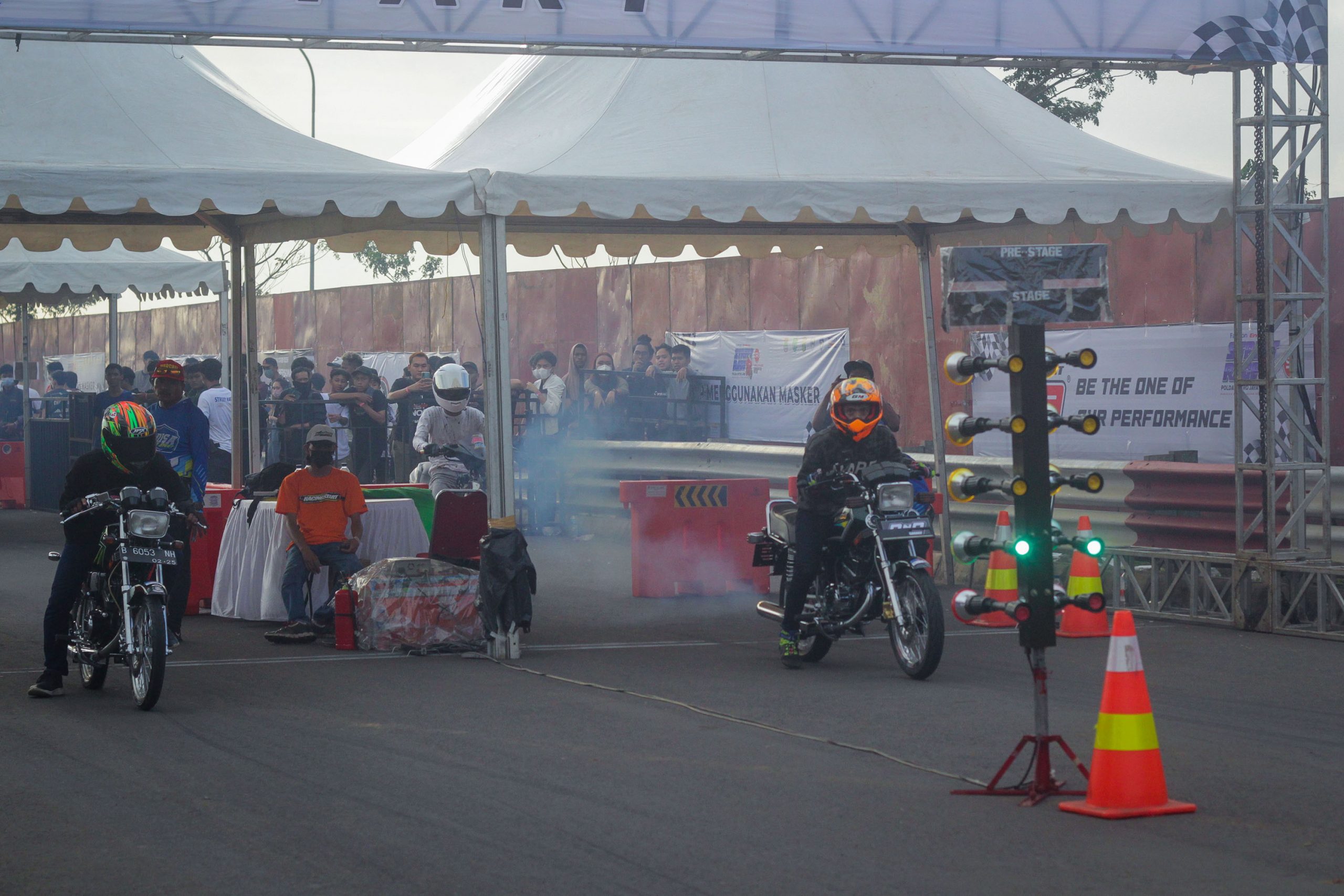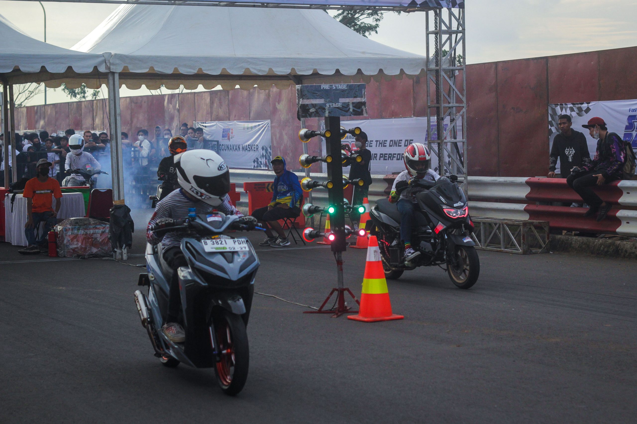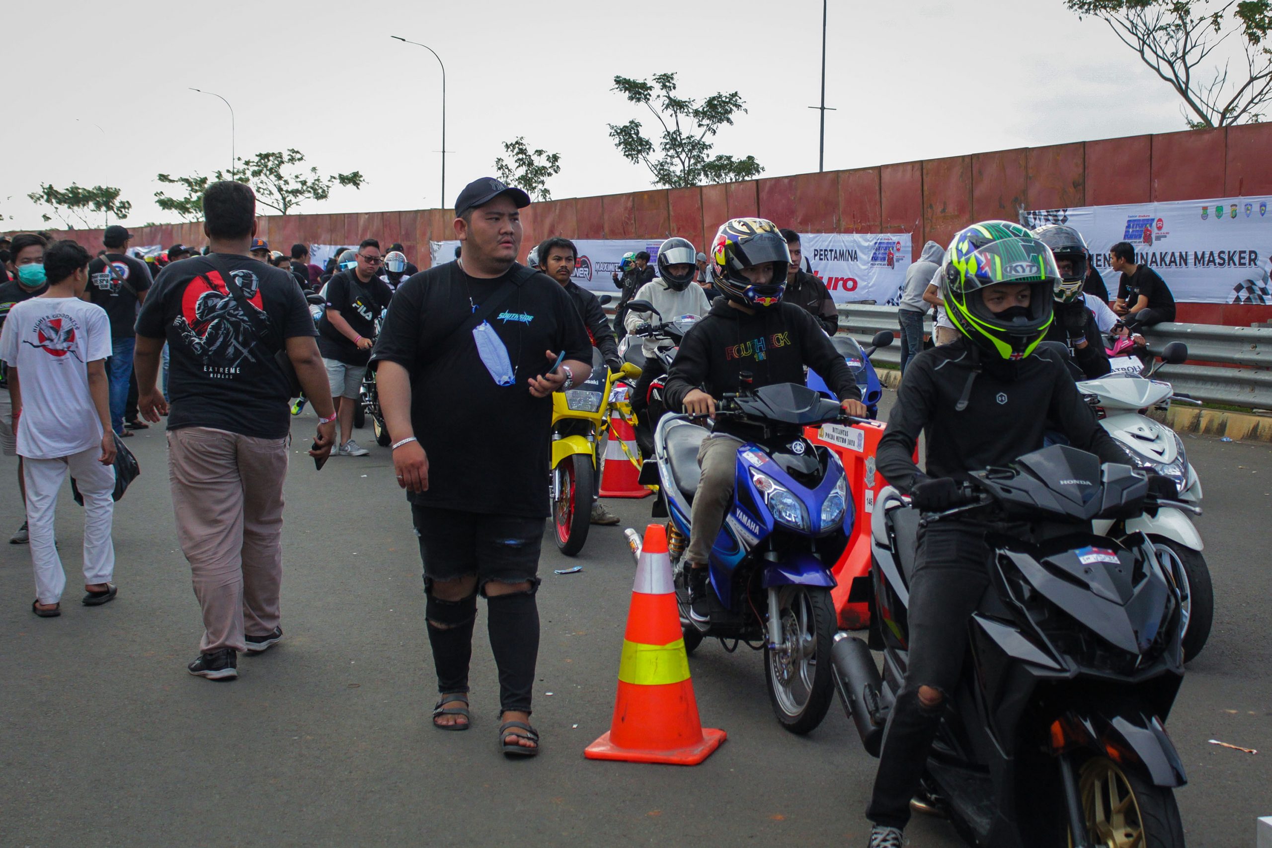 Peserta memadati antrian untuk mulai di Start memacu sepeda motornya dalam ajang Street Race Polda Metro Jaya di kawasan BSD Serpong, Tangerang, Banten, Sabtu (23/4/2022). Polda Metro Jaya menggelar lomba balap motor dan mobil yang diikuti oleh 657 peserta untuk memfasilitasi para pembalap agar tidak melakukan balapan liar dan berlangsung hingga 24 April 2022. Banten Aktual/Cecep