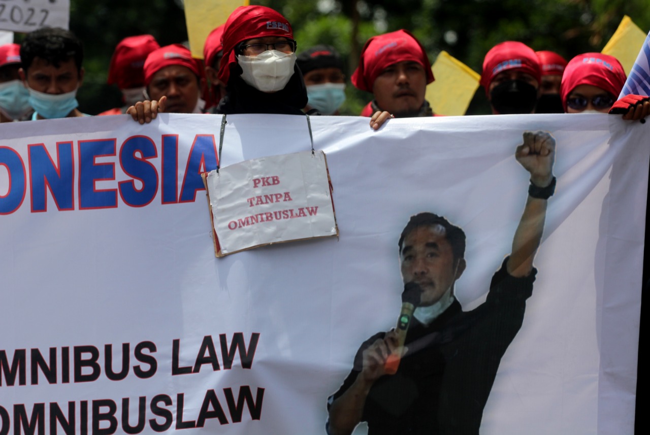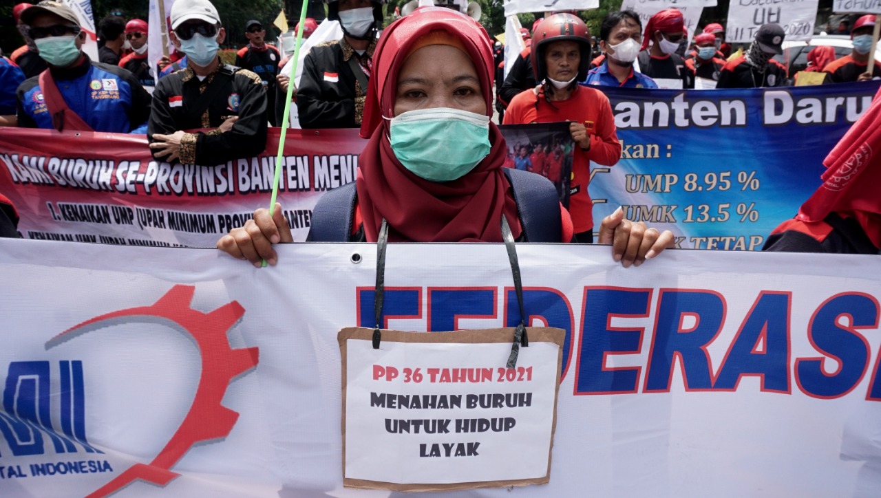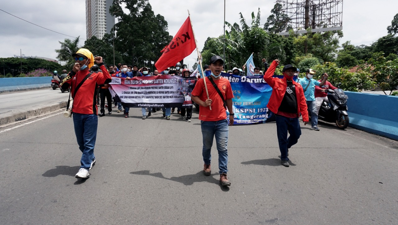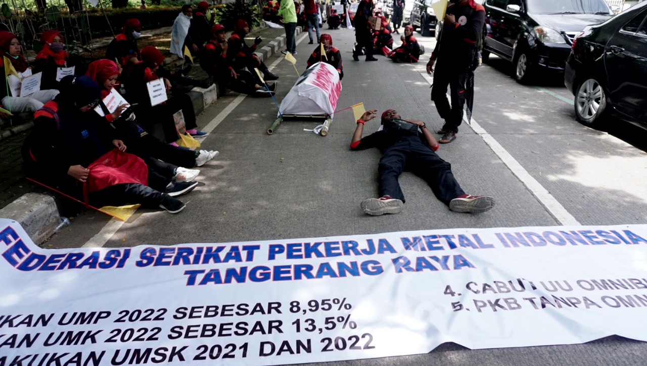 Buruh Seluruh Indonesia turun kejalan menuntut kenaikan upah yang hanya naik 1,09% dari tuntutan 13,5%, seperti yang dilakukan buruh di Kota Tangerang ini. Dalam aksinya mereka menutup jalan didepan Kantor Dinas Ketenaga Kerjaan Jalan Perintis Kemerdekaan Cikokol Kota Tangerang, terlihat dalam aksinya buruh membawa keranda mayat dan bendera merah putih yang ukurannya cukup besar. Senin (22/11/21). Banten Aktual/Dennys