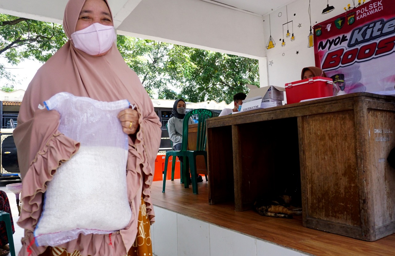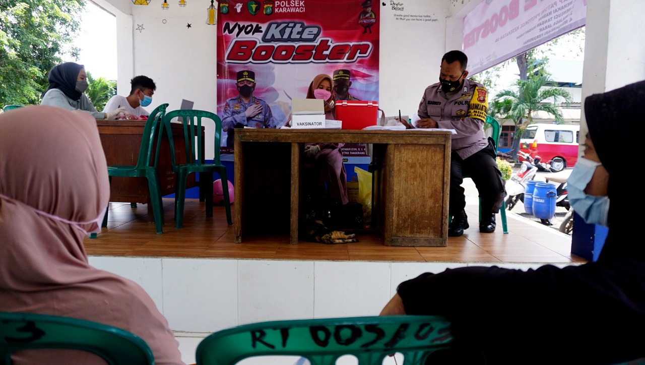 Polsek Karawaci Kota Tangerang adakan Vaksin di Terminal Pasar Baru Jalan. Mohamad Toha Kelurahan Pasar Baru Karawaci Kota Tangerang. Dalam kegiatannya kali ini Polsek Karawaci menyediakan Beras dan Minyak Goreng geratis bagi masyarakat yang melaksanakan vaksin di lokasi tersebut. Vaksin ini menjadi program pemerintah dalam menghadapi masa endemi di Indonesia. Sabtu (9/4/22). Banten Aktual/Dennys
